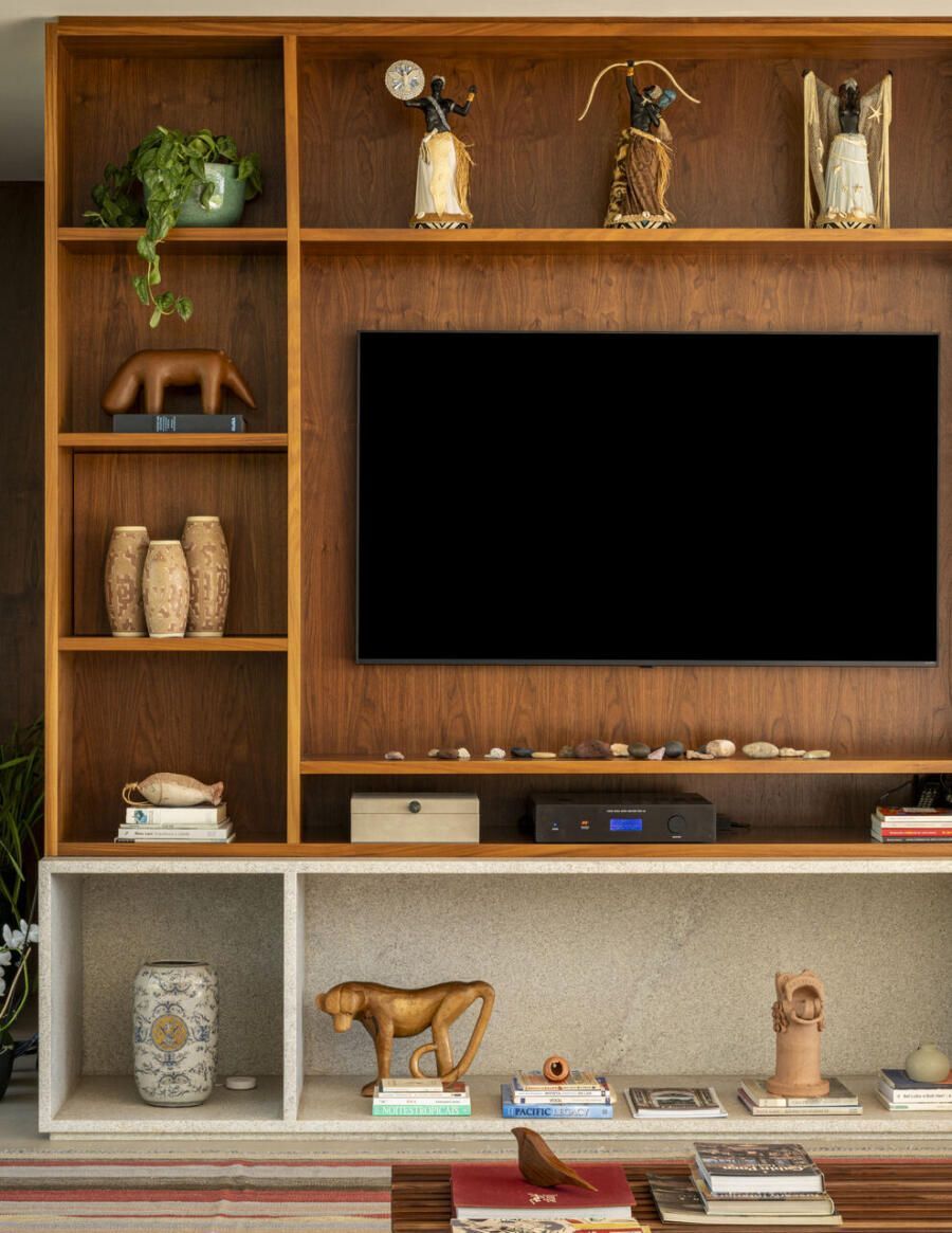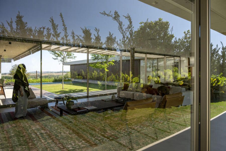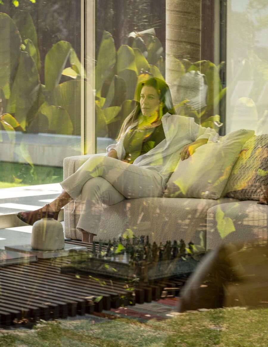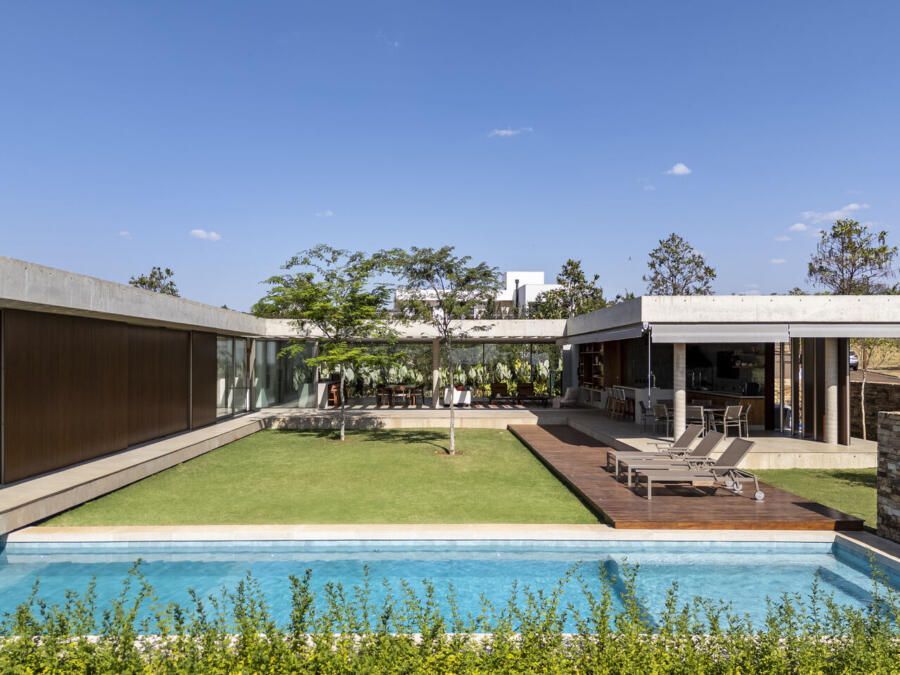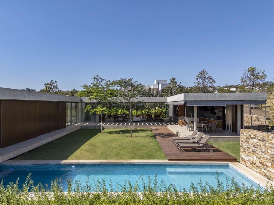 “Como o casal adora receber amigos nos finais de semana, o desejo principal era uma casa com ambientes amplos, acolhedores e totalmente conectados. A proposta previa a integração entre cozinha, sala de jantar e living, criando um espaço contínuo que se estendesse naturalmente até a área gourmet e piscina. Essa conexão foi alcançada por meio de uma planta em formato de “U” e pelo uso de amplas portas de vidro, que permitem unir ou separar os ambientes conforme a necessidade, trazendo versatilidade ao cotidiano.”