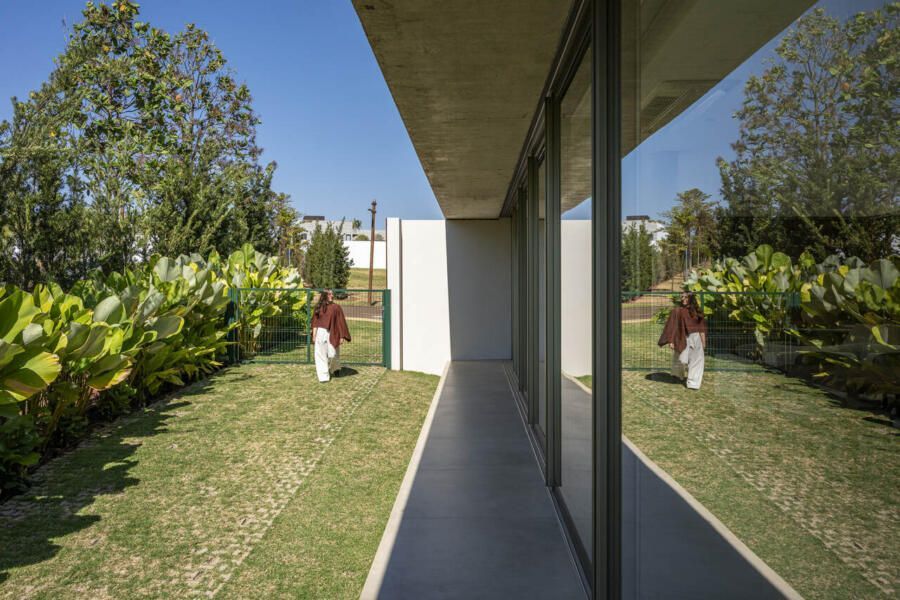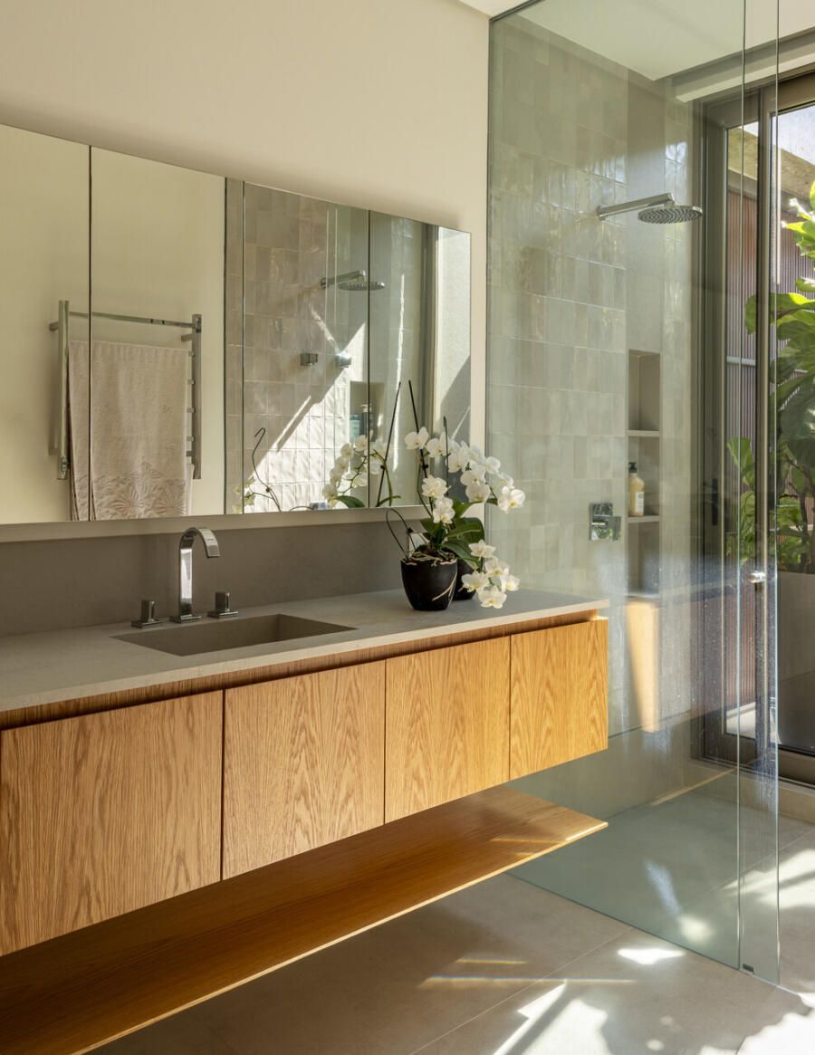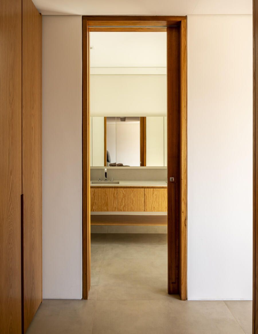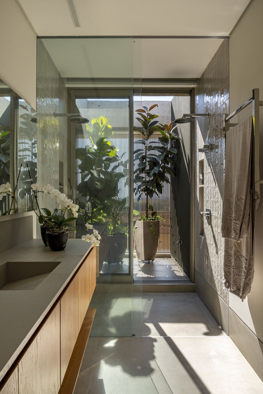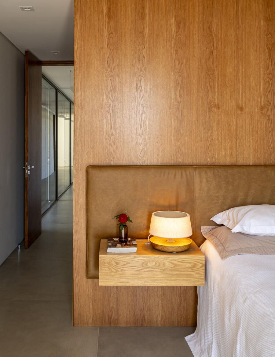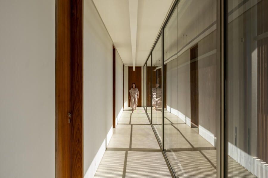 Quatro suítes no pavimento térreo reforçam essa atmosfera acolhedora, enquanto um escritório cuidadosamente posicionado oferece funcionalidade ao cotidiano. A materialidade contemporânea, marcada por texturas naturais, paleta suave e proporções precisas, cria uma arquitetura que privilegia luz e sombra, vazios e cheios, e que dá à casa uma sensação de serenidade permanente.