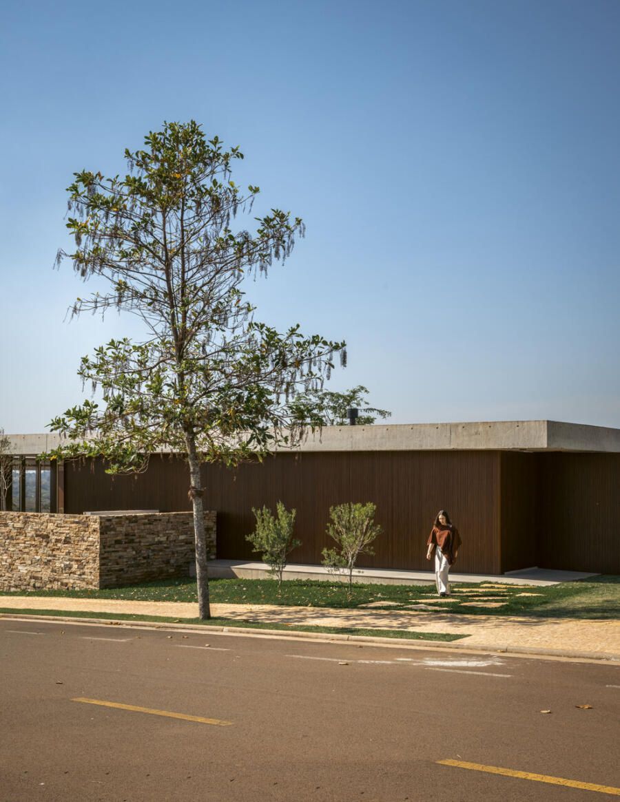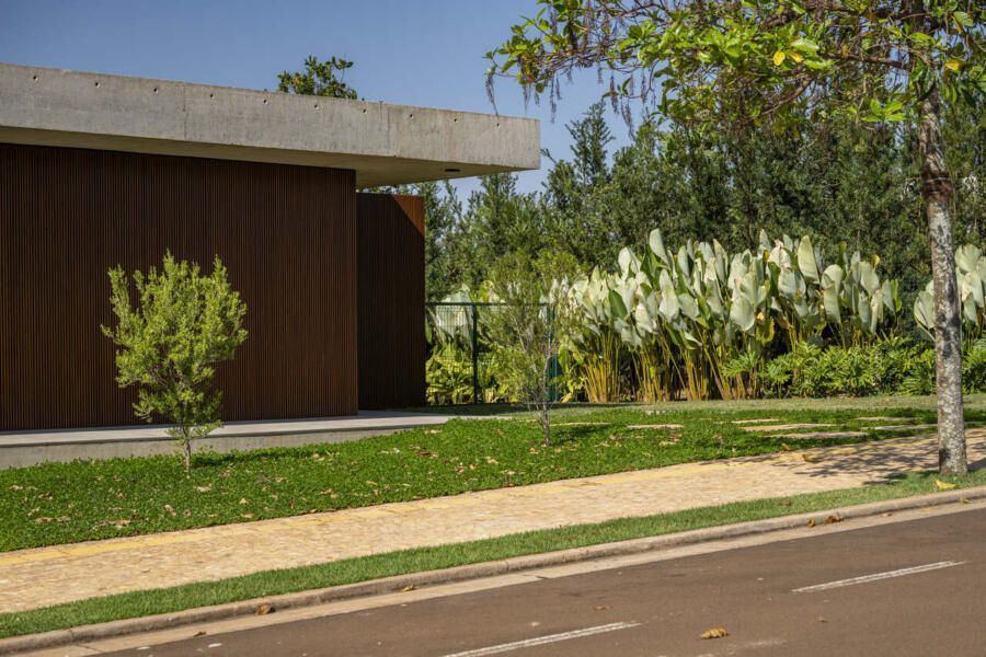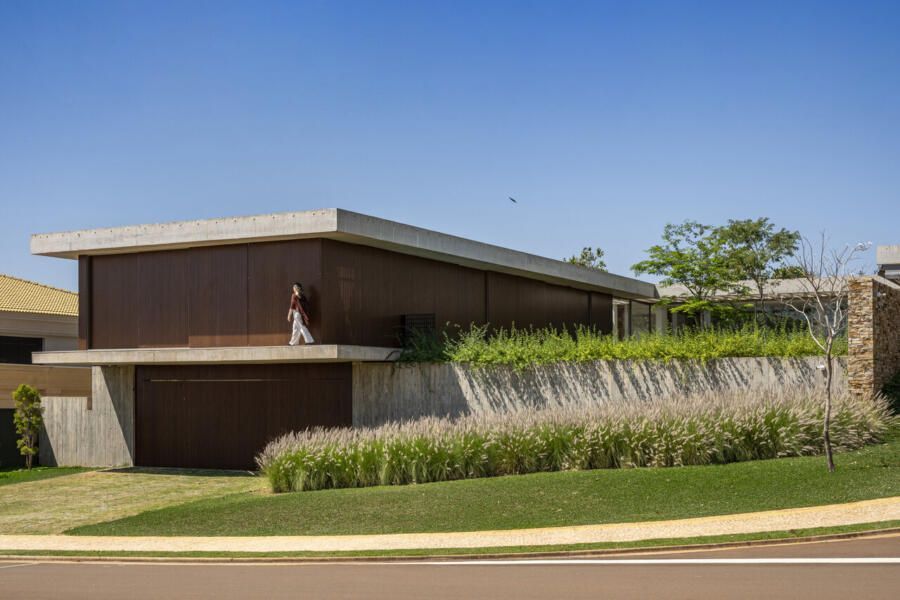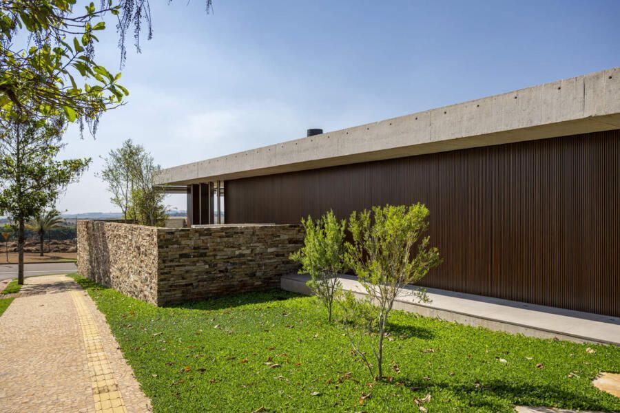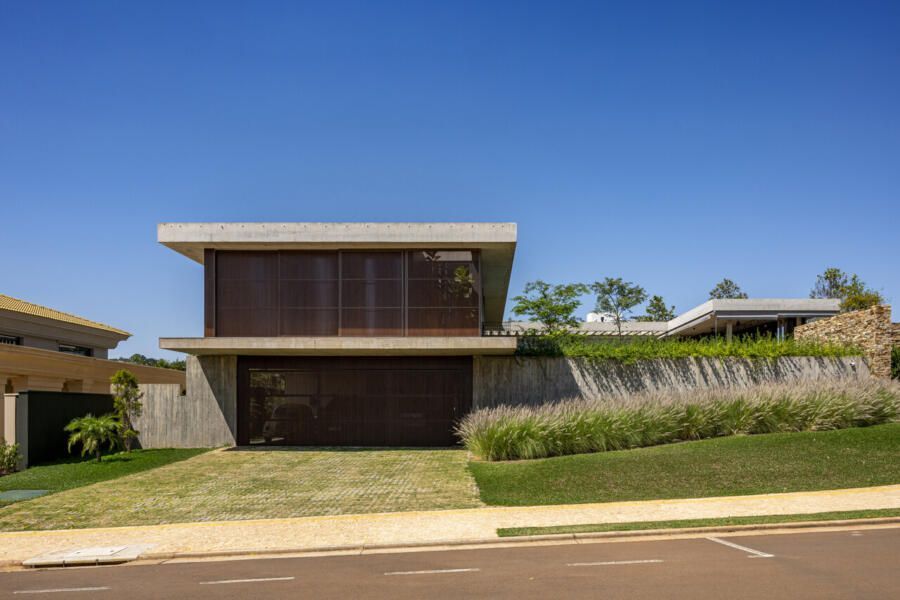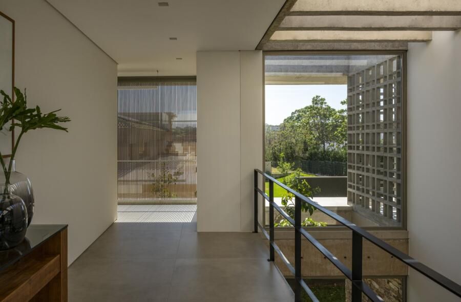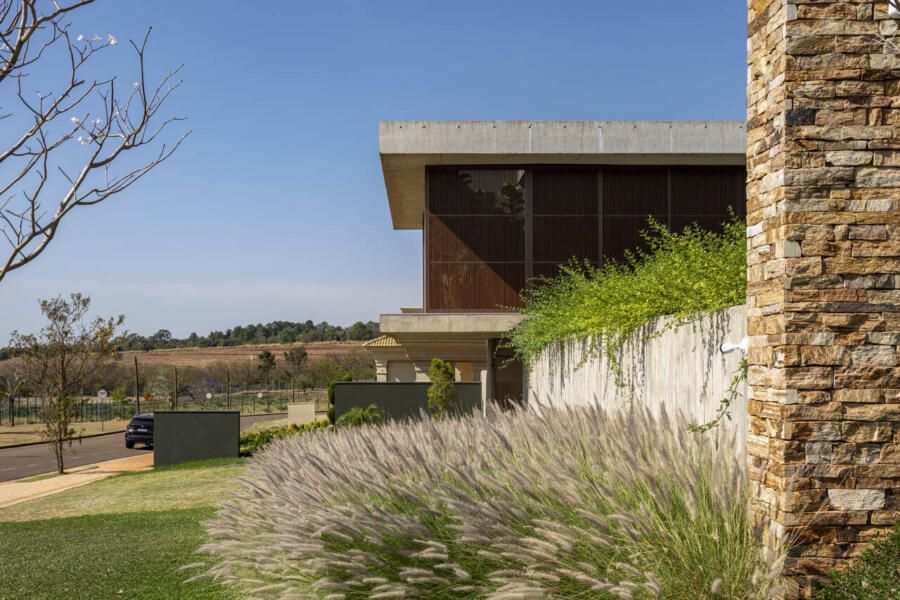“A implantação do projeto representou um dos principais desafios. O terreno, tem uma vista privilegiada e era marcado por um aclive acentuado, exigia uma solução que permitisse à residência acomodar-se ao lote com naturalidade, evitando qualquer imposição sobre a paisagem. Ao mesmo tempo, buscamos garantir privacidade, sobretudo para as áreas sociais.”
