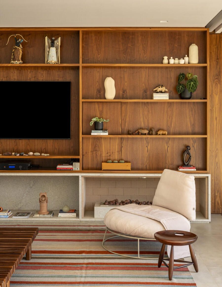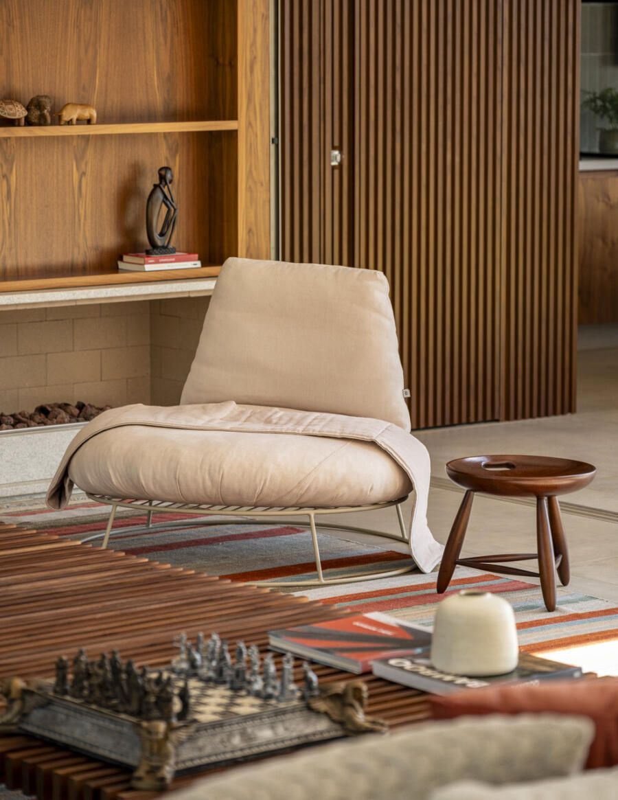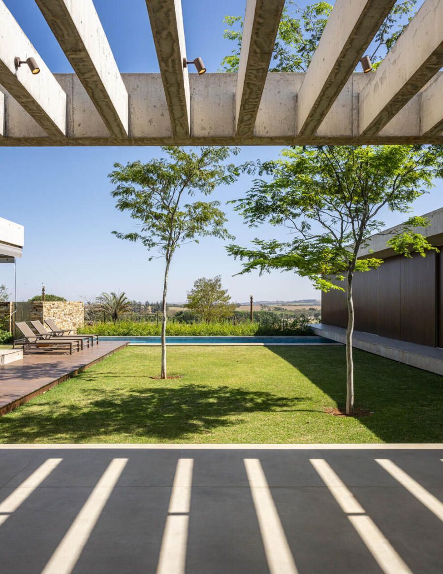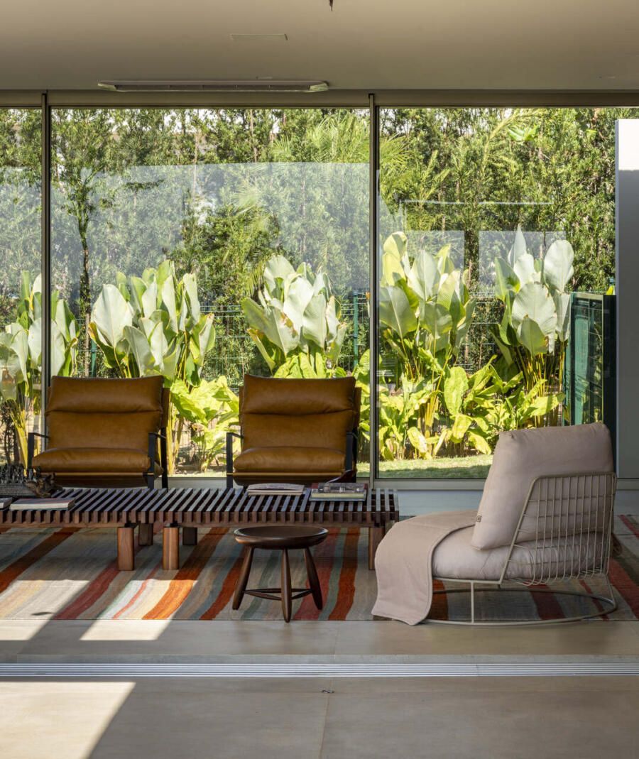 “A implantação do projeto representou um dos principais desafios. O terreno, tem uma vista privilegiada e era marcado por um aclive acentuado, exigia uma solução que permitisse à residência acomodar-se ao lote com naturalidade, evitando qualquer imposição sobre a paisagem. Ao mesmo tempo, buscamos garantir privacidade, sobretudo para as áreas sociais.”