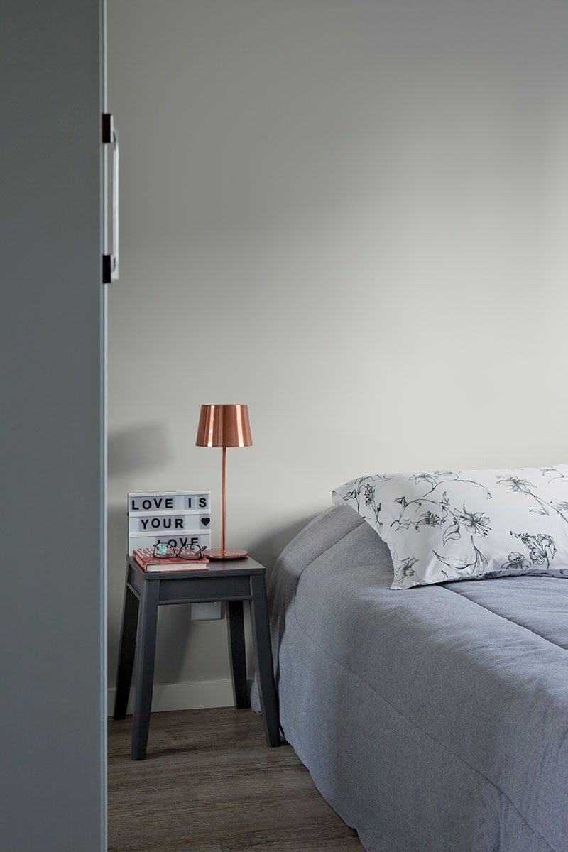 Um dos desafios do escritório foi esconder a máquina de ar condicionado, a condensadora, na sala. O móvel com portas cinzas laqueadas foi planejado com portas para escondê-la. Dentro dele passa toda a tubulação de cobre necessária para fazer a refrigeração dos quartos, elétrica e ainda um ponto de dreno para captar a água que goteja com a condensação do ar refrigerado.