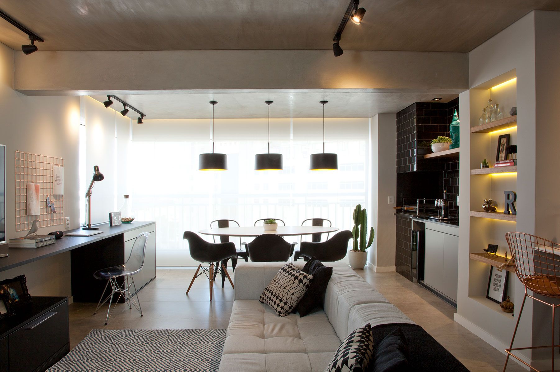 Uma dica é usar sempre a mesma iluminação. Muita gente gosta de fazer a iluminação da cozinha mais clara, com uma temperatura de cor branca, mas se você tem os ambientes integrados, a iluminação deve respeitar este raciocínio.