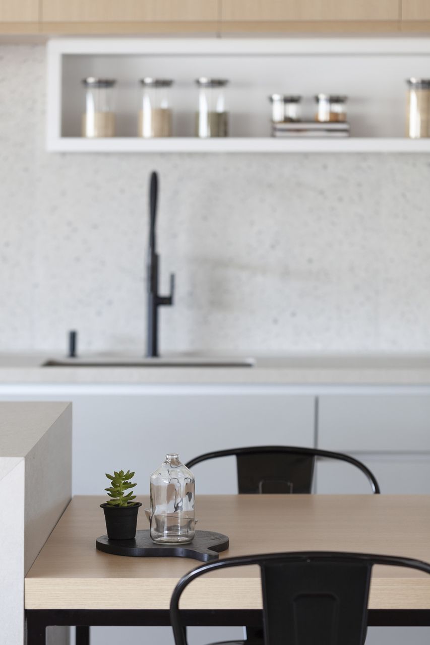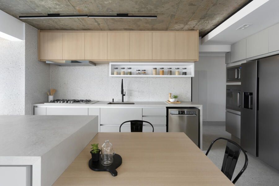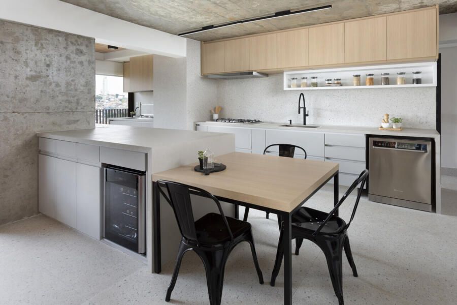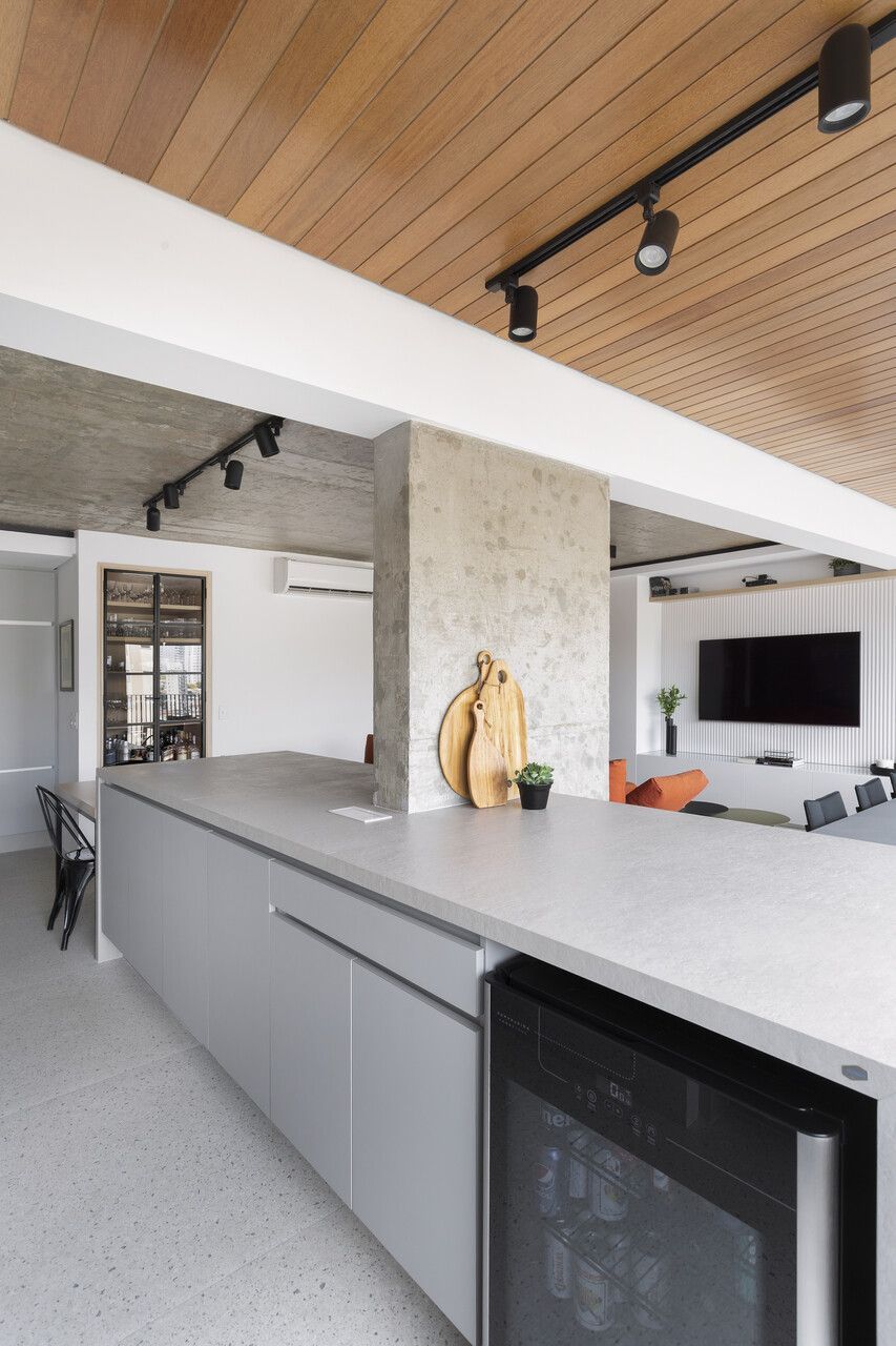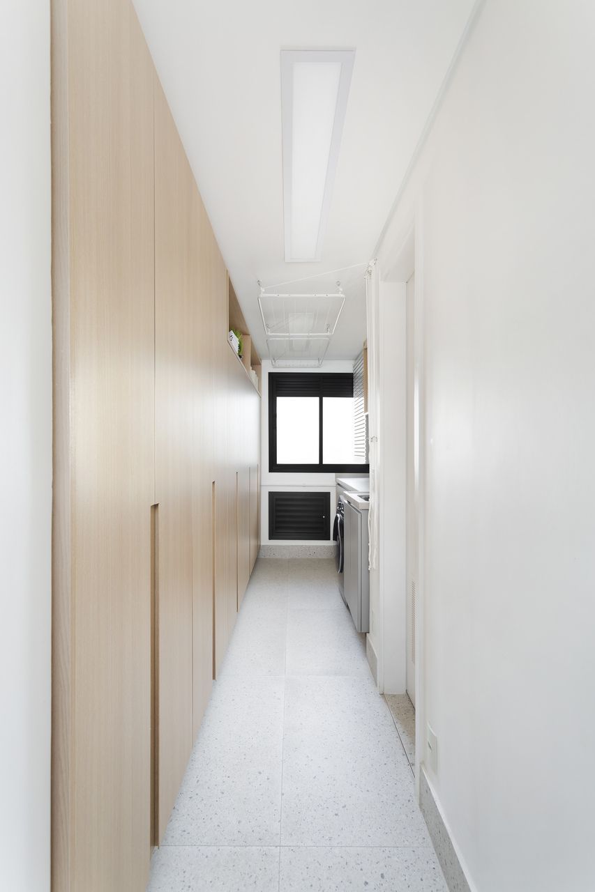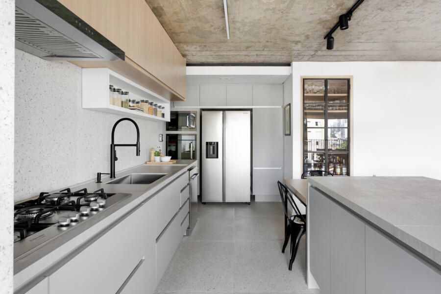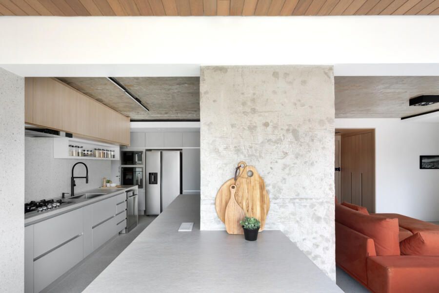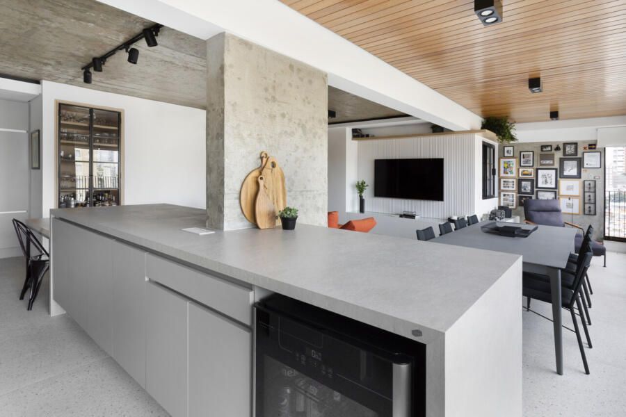 Para isso, a área de serviço teve a espessura de sua parede com a cozinha diminuída, o que possibilitou a criação da despensa em madeirado. Além disso, a demolição da alvenaria entre sala e cozinha possibilitou a integração dos espaços e a criação da ilha de apoio.