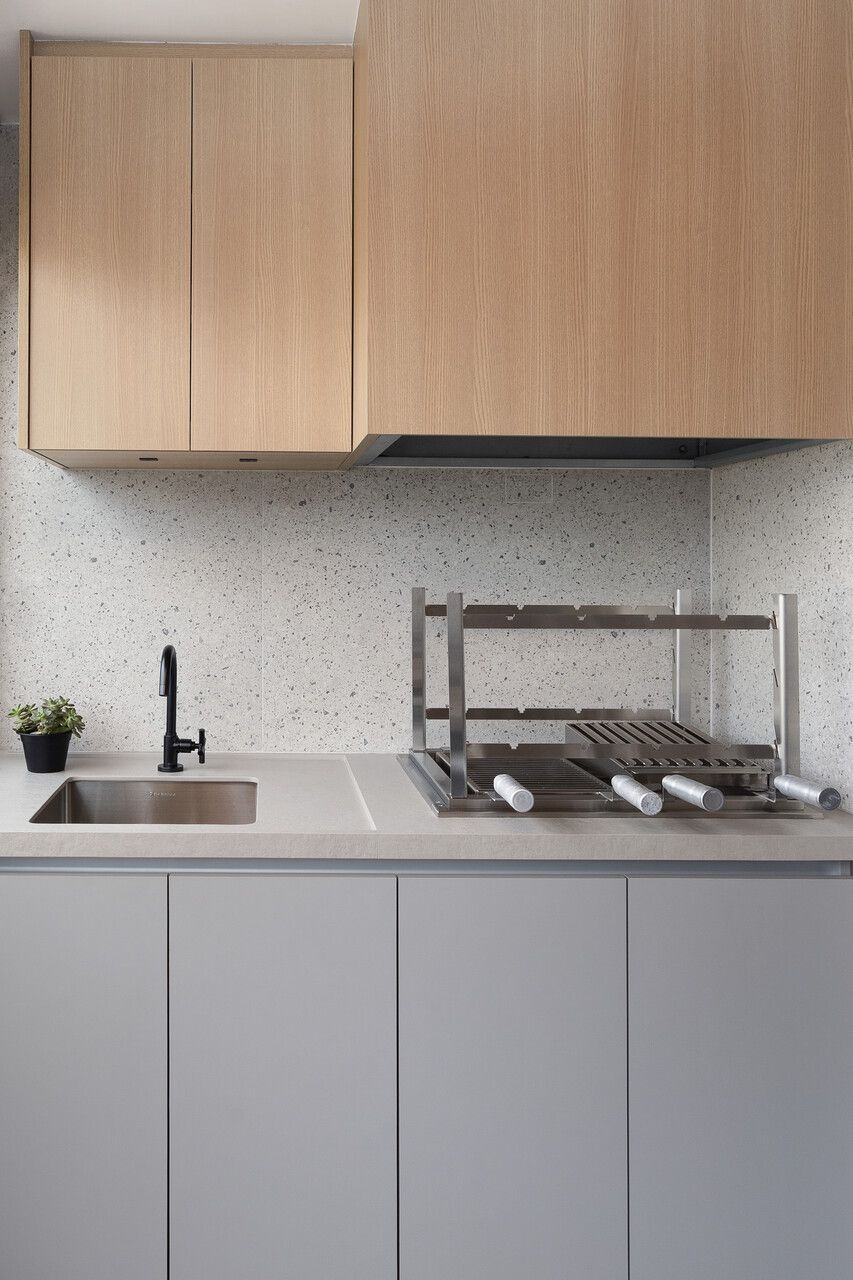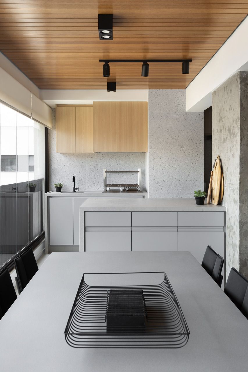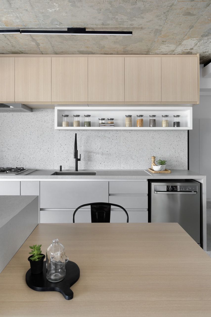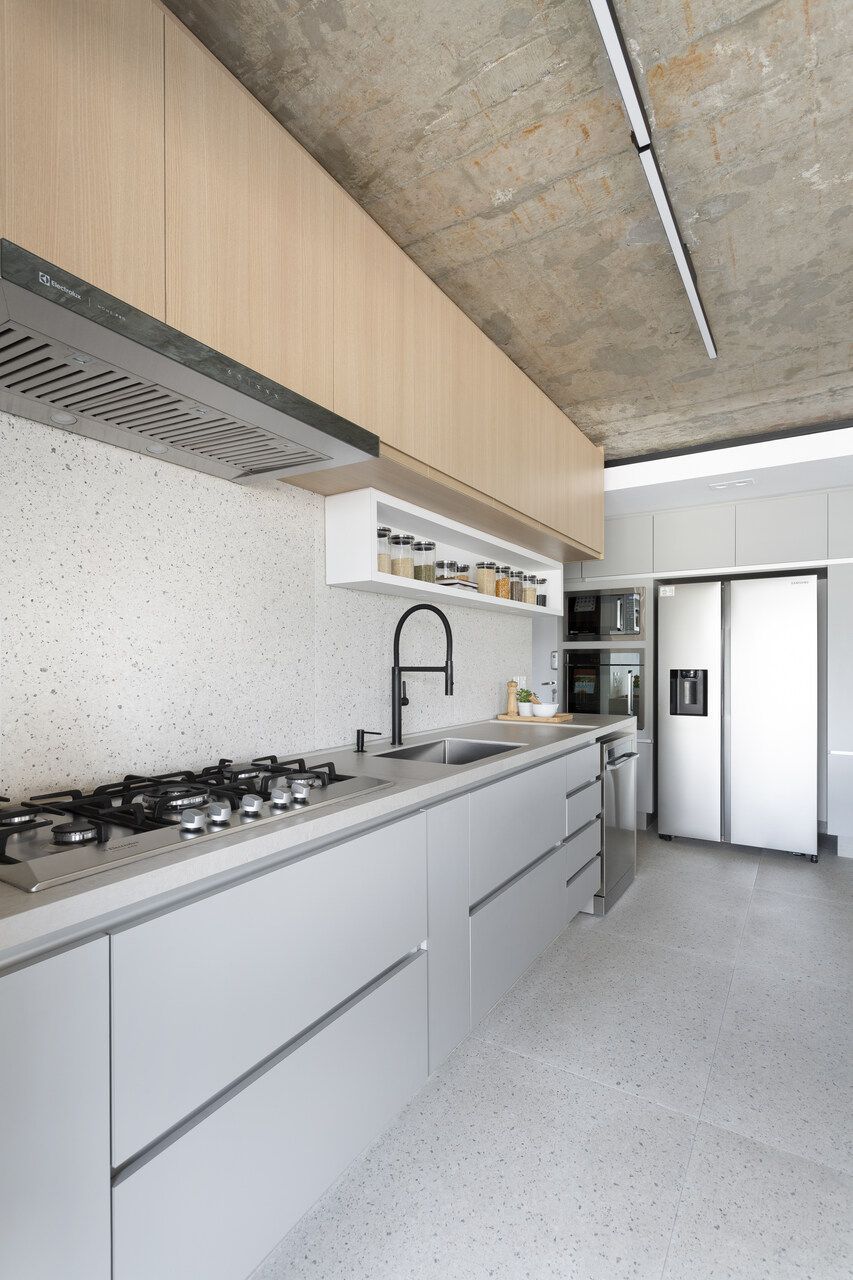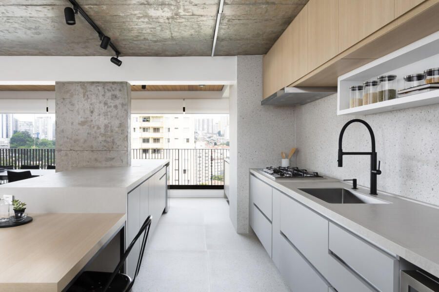 Para isso, a área de serviço teve a espessura de sua parede com a cozinha diminuída, o que possibilitou a criação da despensa em madeirado. Além disso, a demolição da alvenaria entre sala e cozinha possibilitou a integração dos espaços e a criação da ilha de apoio.