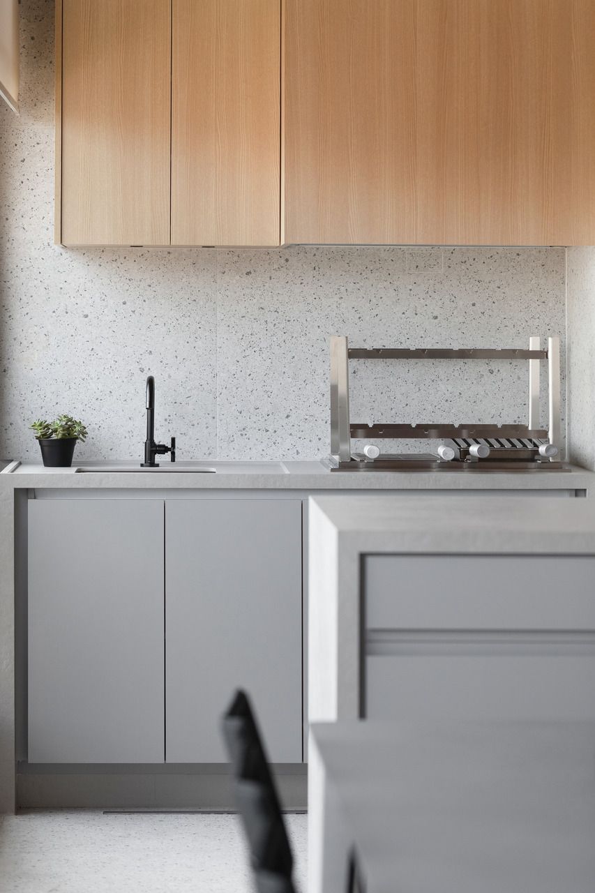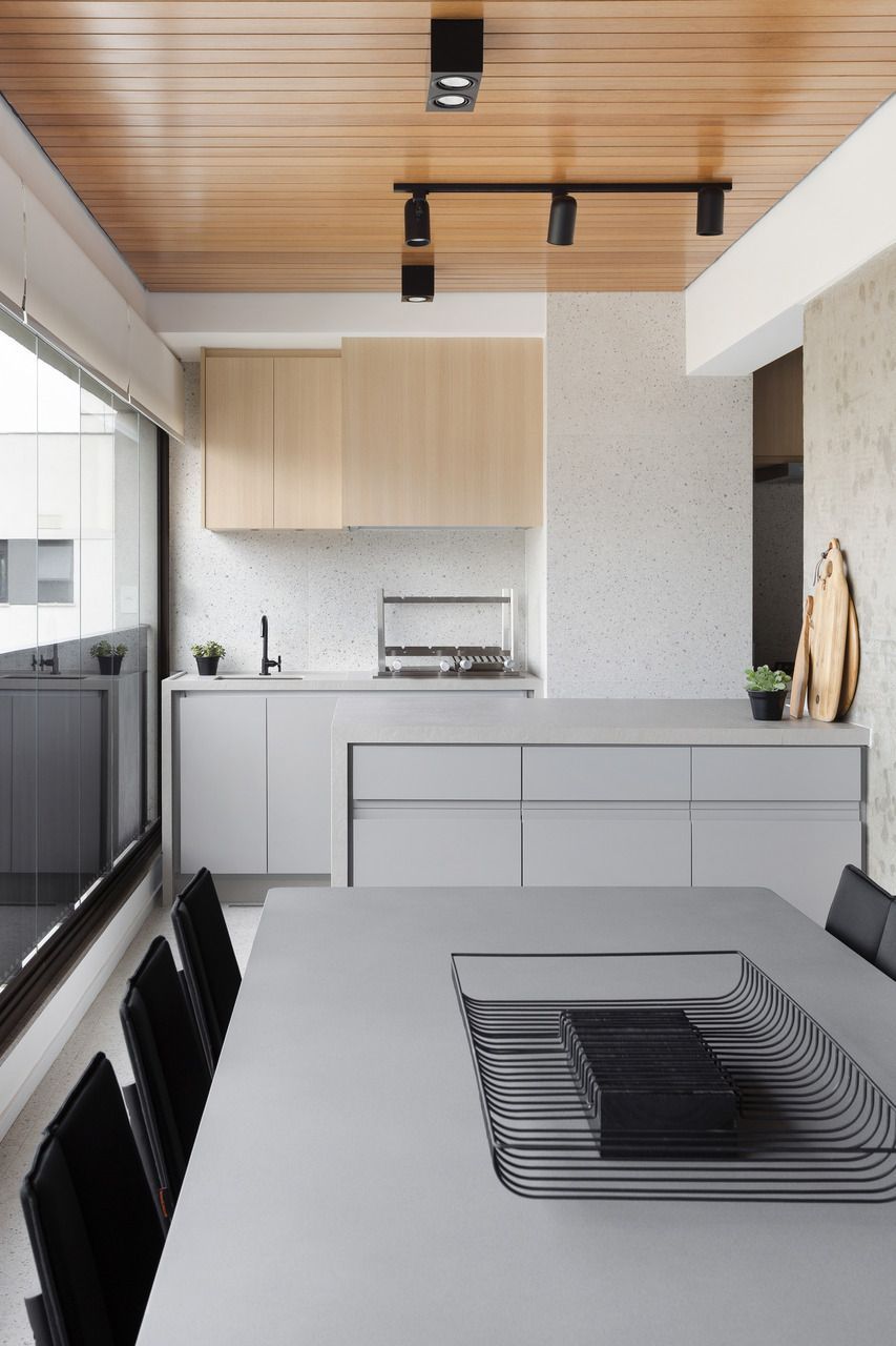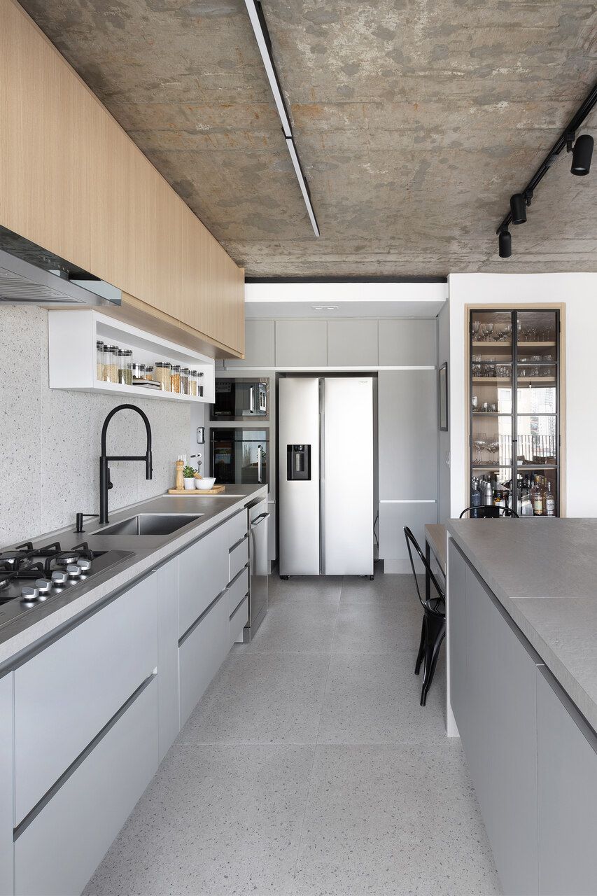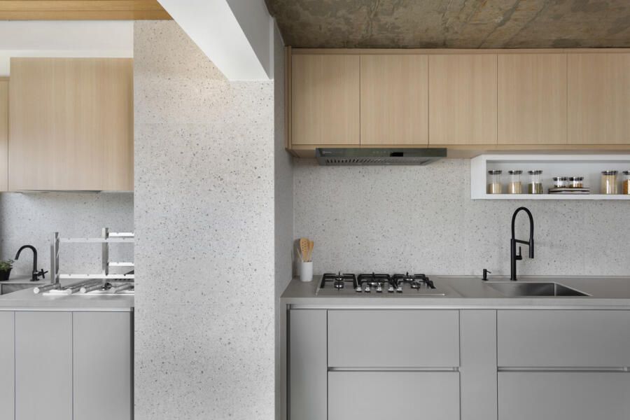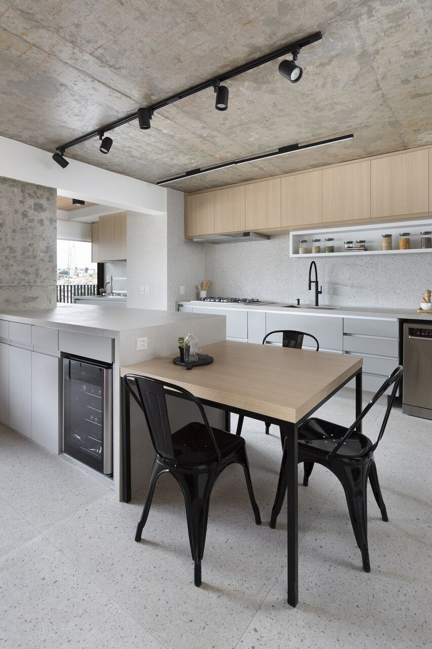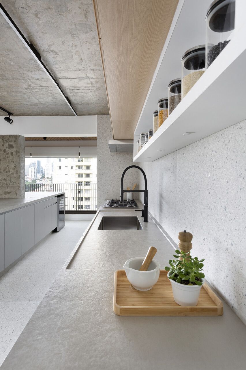 Para isso, a área de serviço teve a espessura de sua parede com a cozinha diminuída, o que possibilitou a criação da despensa em madeirado. Além disso, a demolição da alvenaria entre sala e cozinha possibilitou a integração dos espaços e a criação da ilha de apoio.