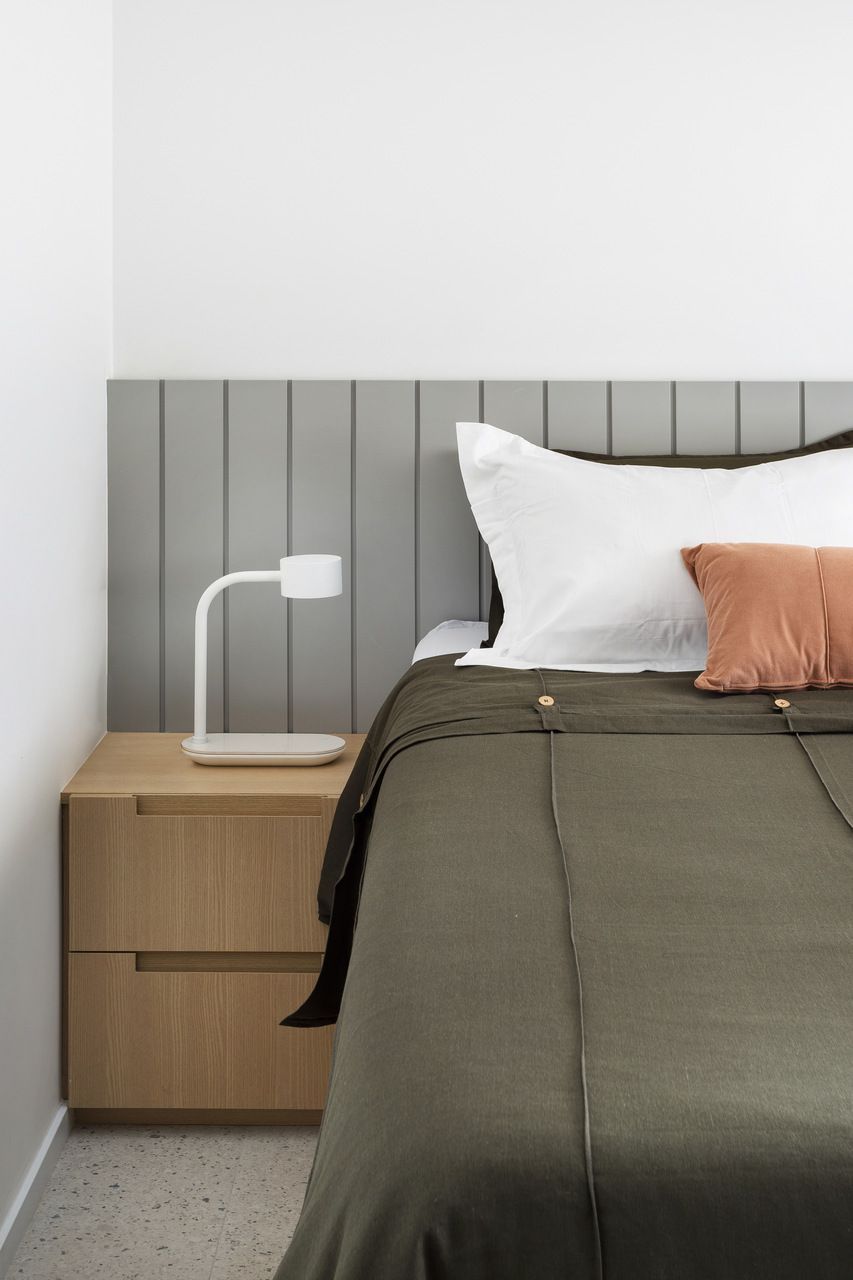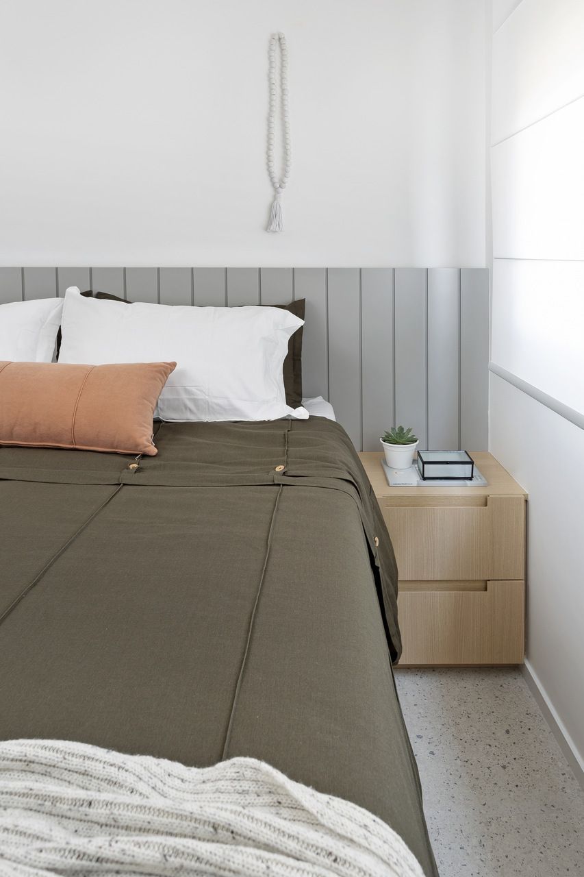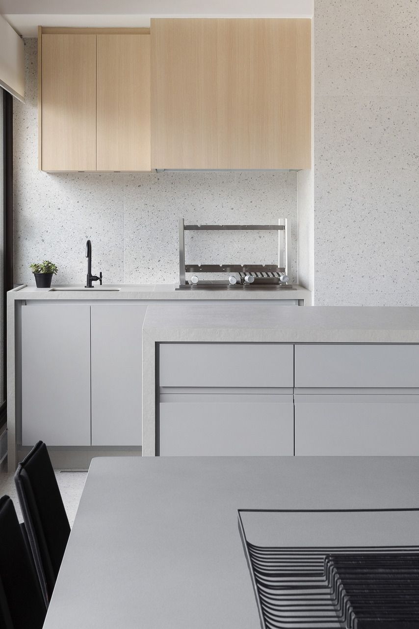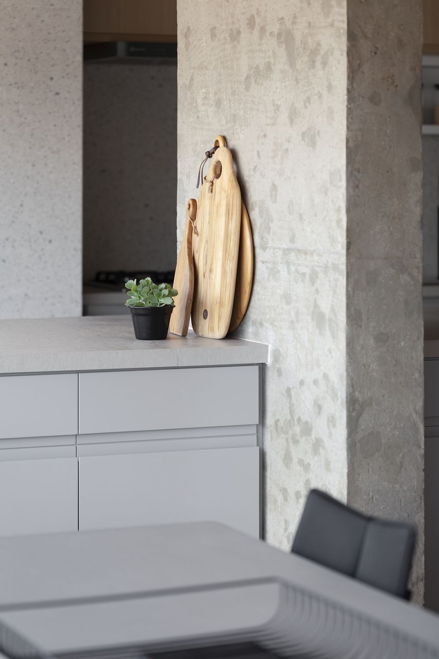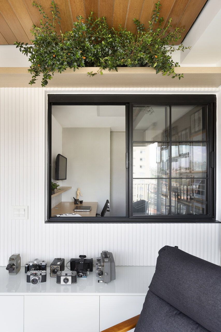 Para isso, a área de serviço teve a espessura de sua parede com a cozinha diminuída, o que possibilitou a criação da despensa em madeirado. Além disso, a demolição da alvenaria entre sala e cozinha possibilitou a integração dos espaços e a criação da ilha de apoio.