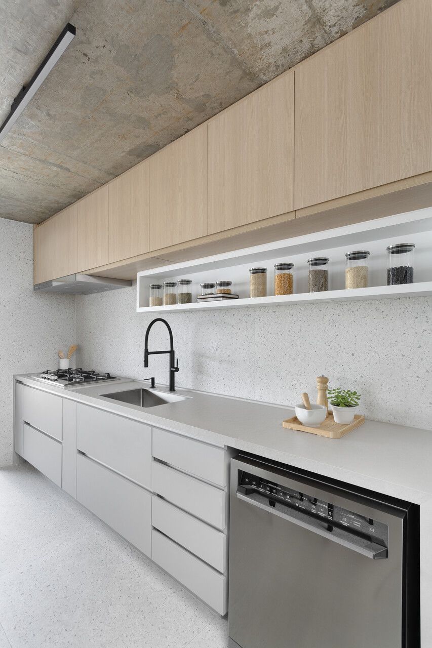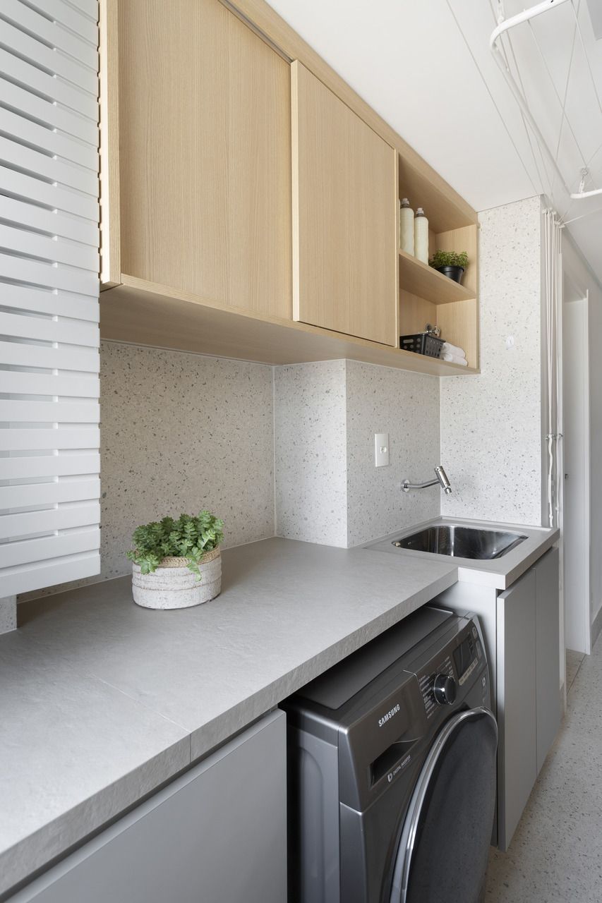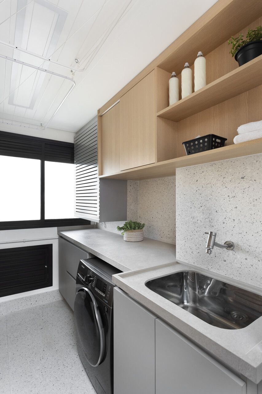 “O principal pedido da cliente era uma marcenaria prática no quesito limpeza, por isso optamos por usar um laminado cinza que não marcasse as digitais na área de serviço, cozinha e escritório. A laca acetinada (semi brilho) também possibilita a facilidade da limpeza, utilizamos as cores cinza e branco para trazer o ar atemporal solicitado pelos clientes.”
