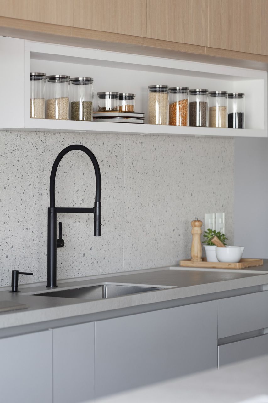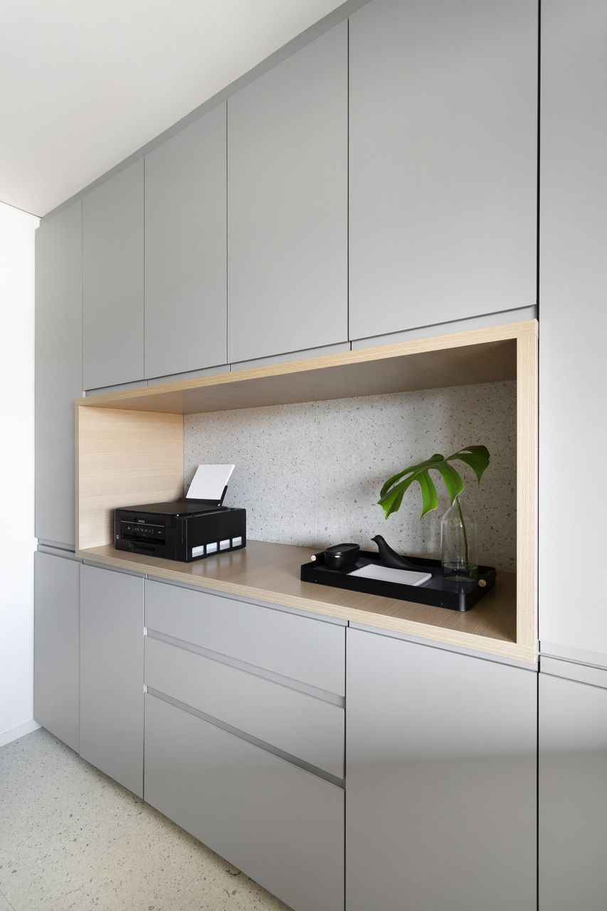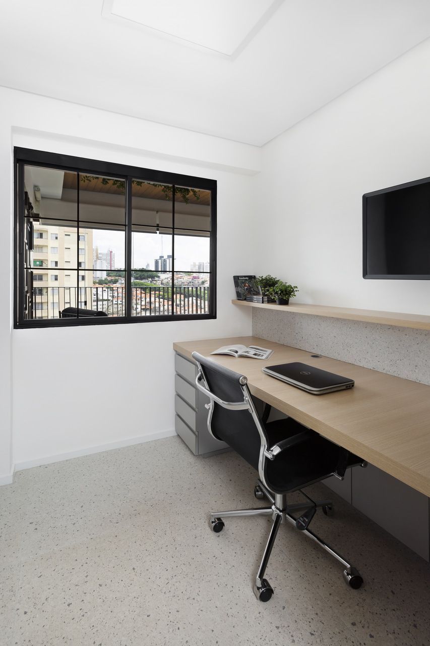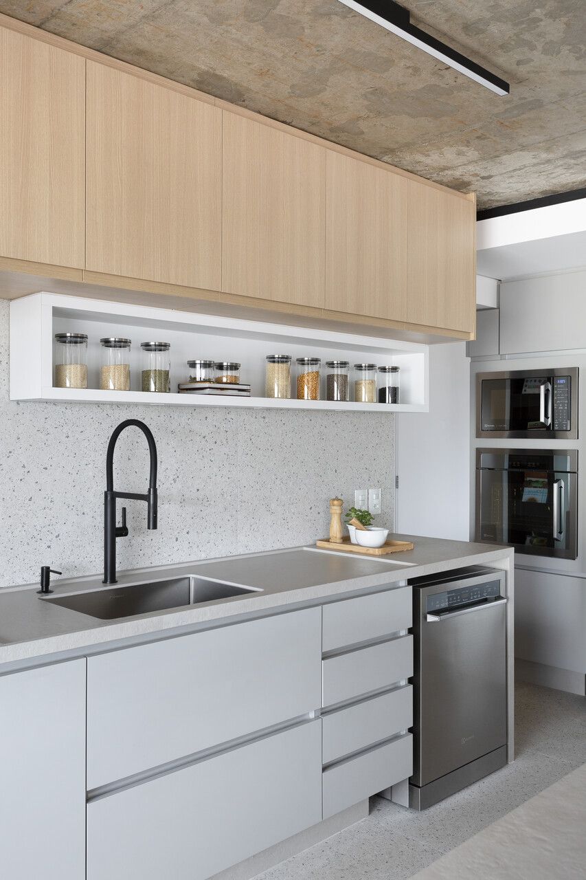 “O principal pedido da cliente era uma marcenaria prática no quesito limpeza, por isso optamos por usar um laminado cinza que não marcasse as digitais na área de serviço, cozinha e escritório. A laca acetinada (semi brilho) também possibilita a facilidade da limpeza, utilizamos as cores cinza e branco para trazer o ar atemporal solicitado pelos clientes.”