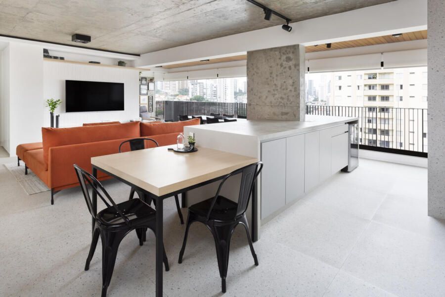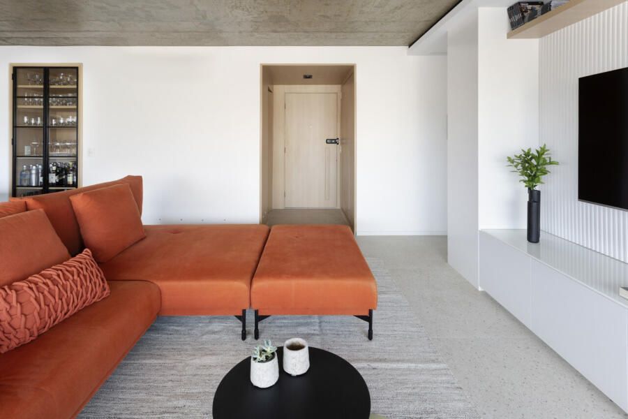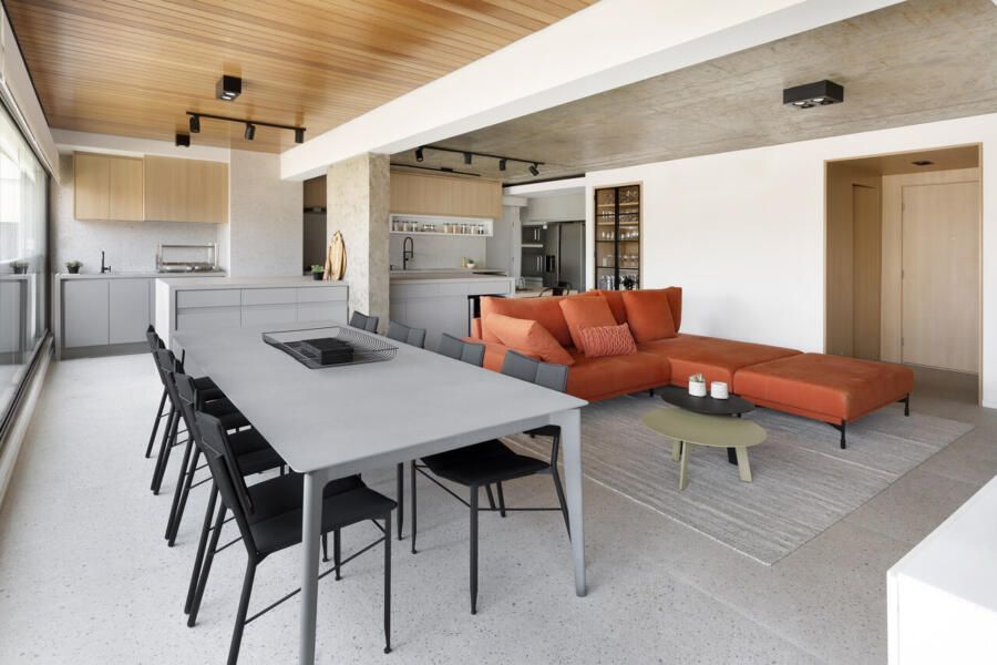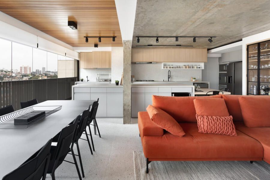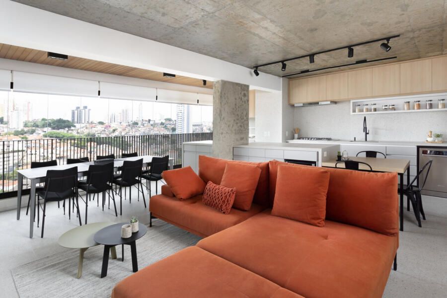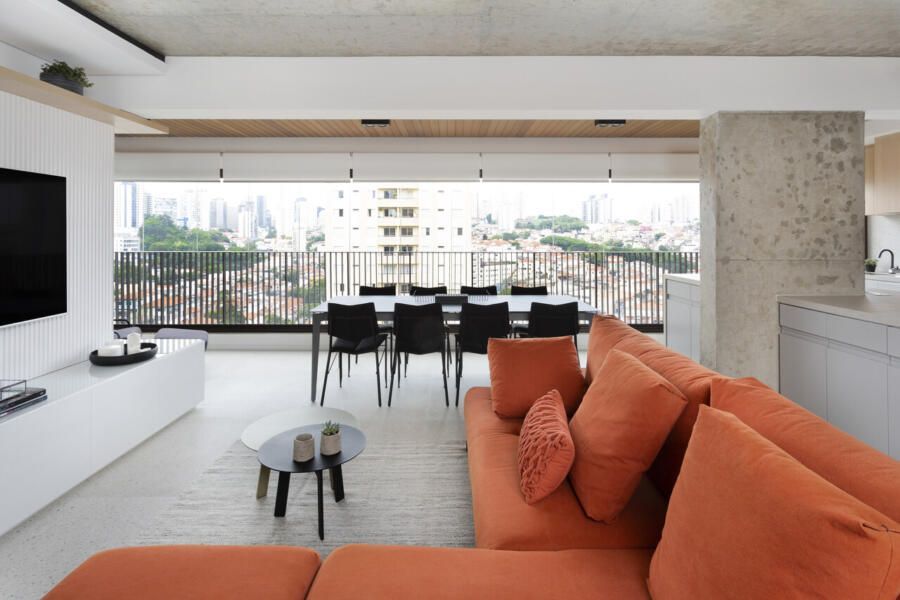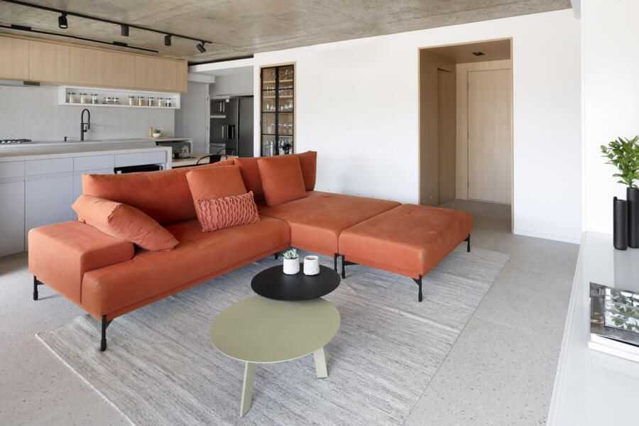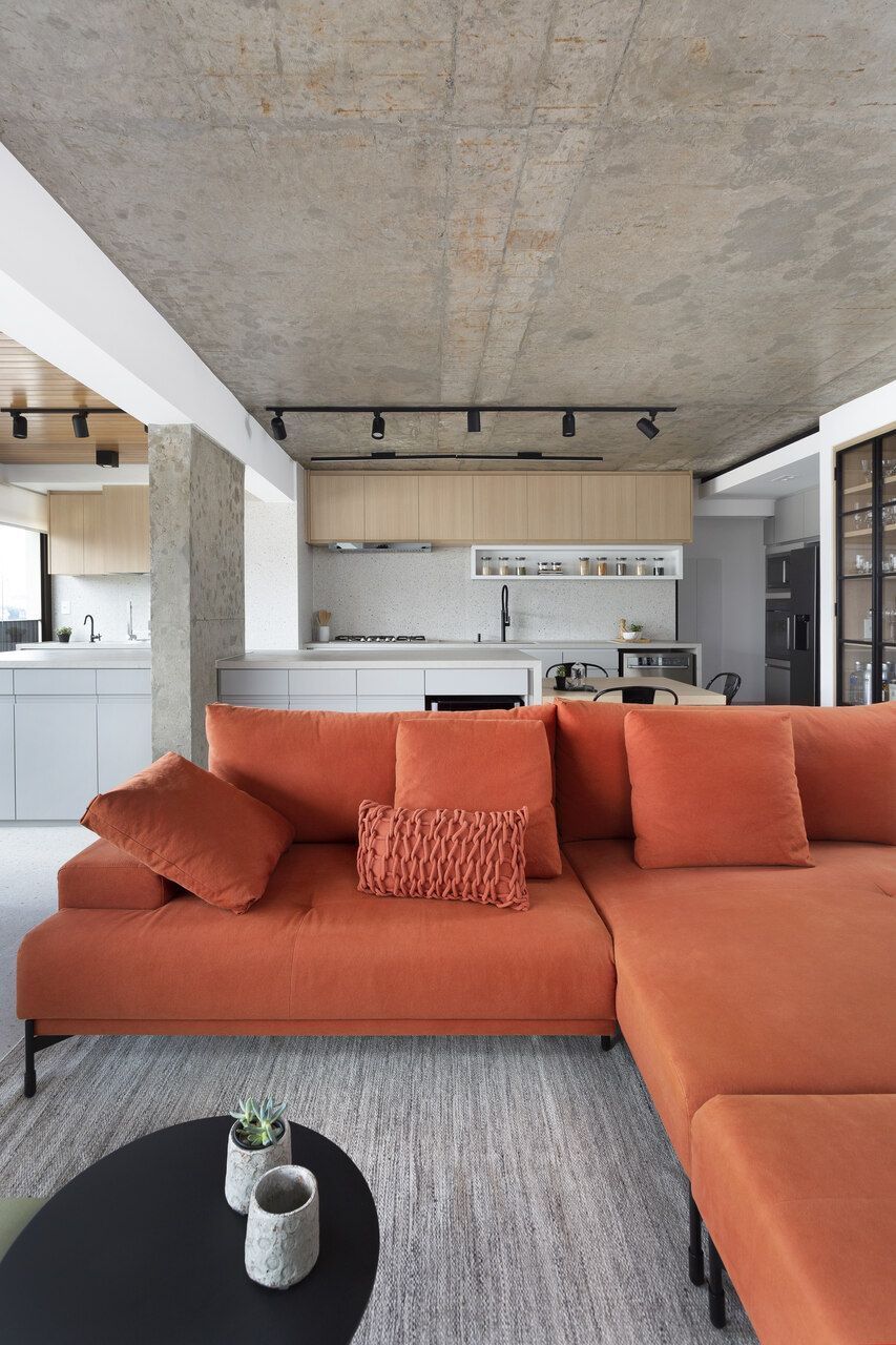 A composição de cores neutras do piso e das paredes com a cor forte laranja do sofá é um destaque para o espaço. Descascamos a pintura do teto da sala, do pilar da ilha e do fundo da parede da varanda (atrás dos quadros) para expor o concreto aparente e trazer esse ar contemporâneo do projeto. O projeto é especial por ter atendido o desejo dos clientes com a criação de muitos armários em um espaço atemporal e prático.