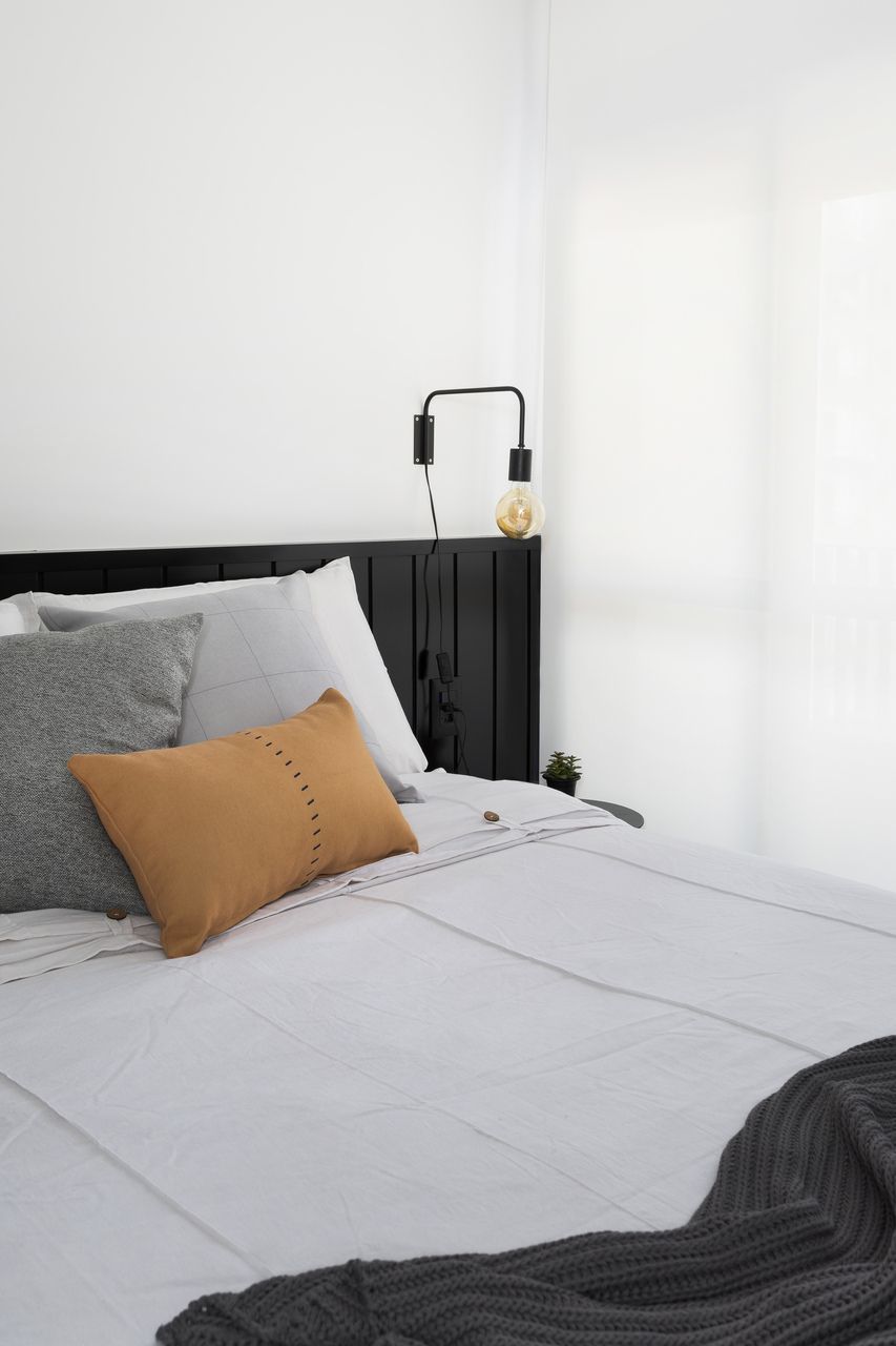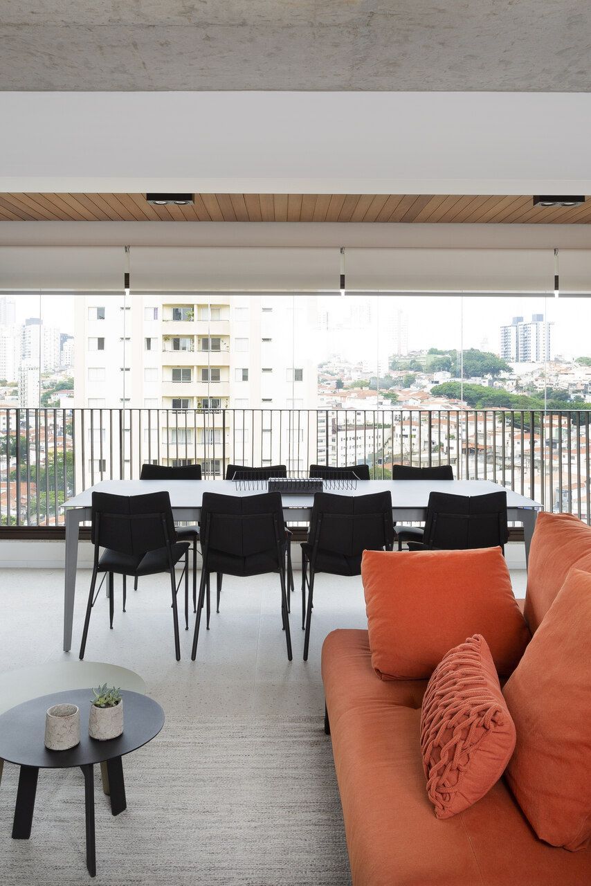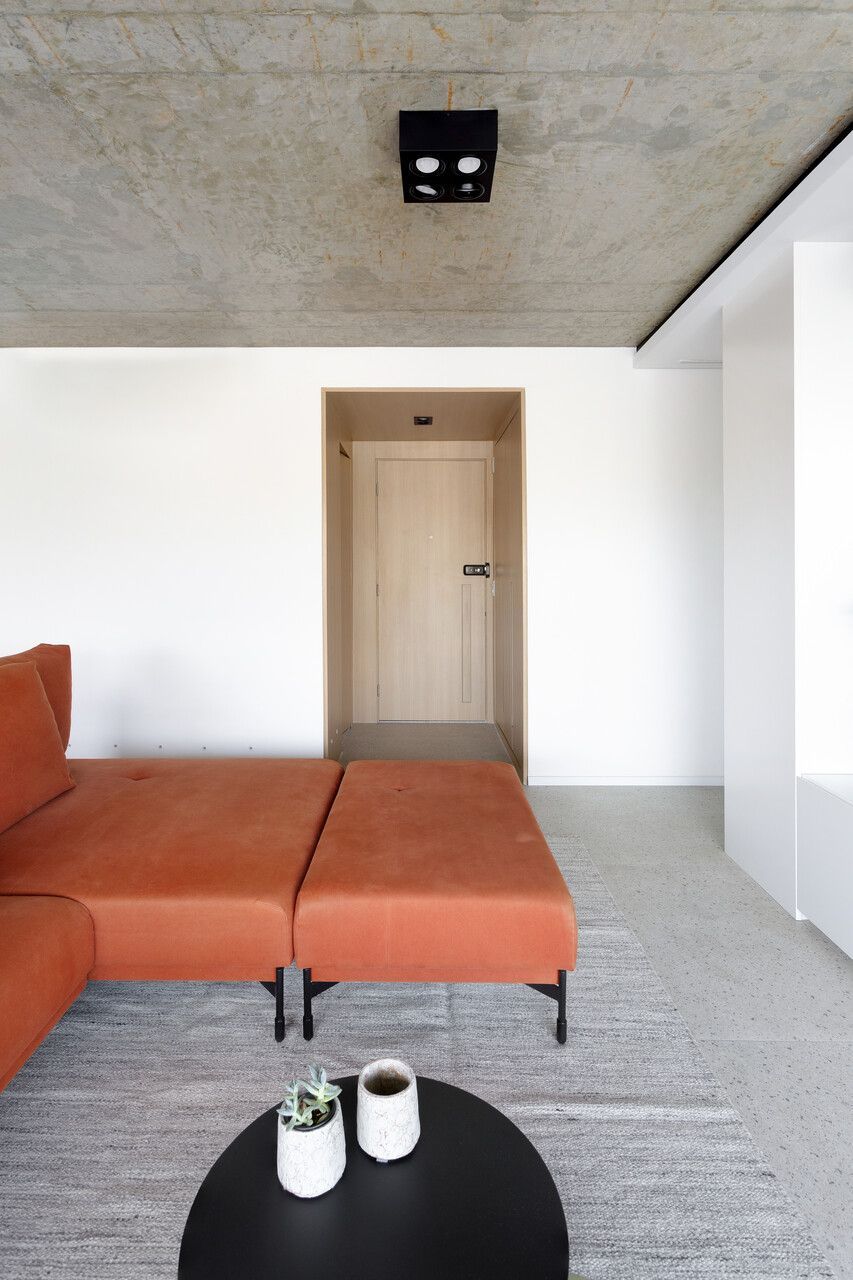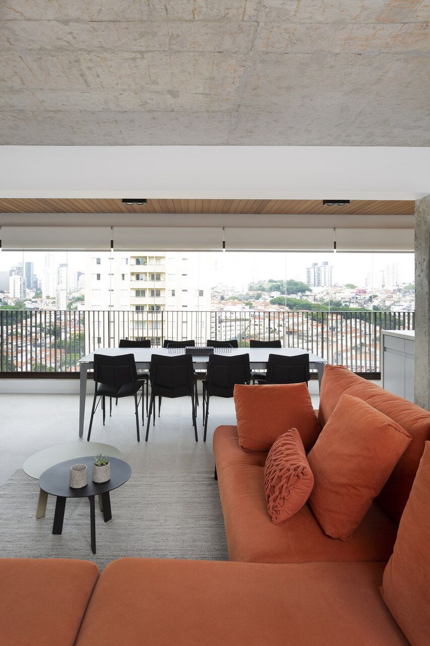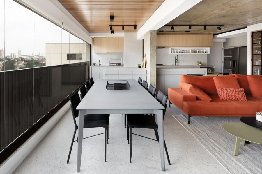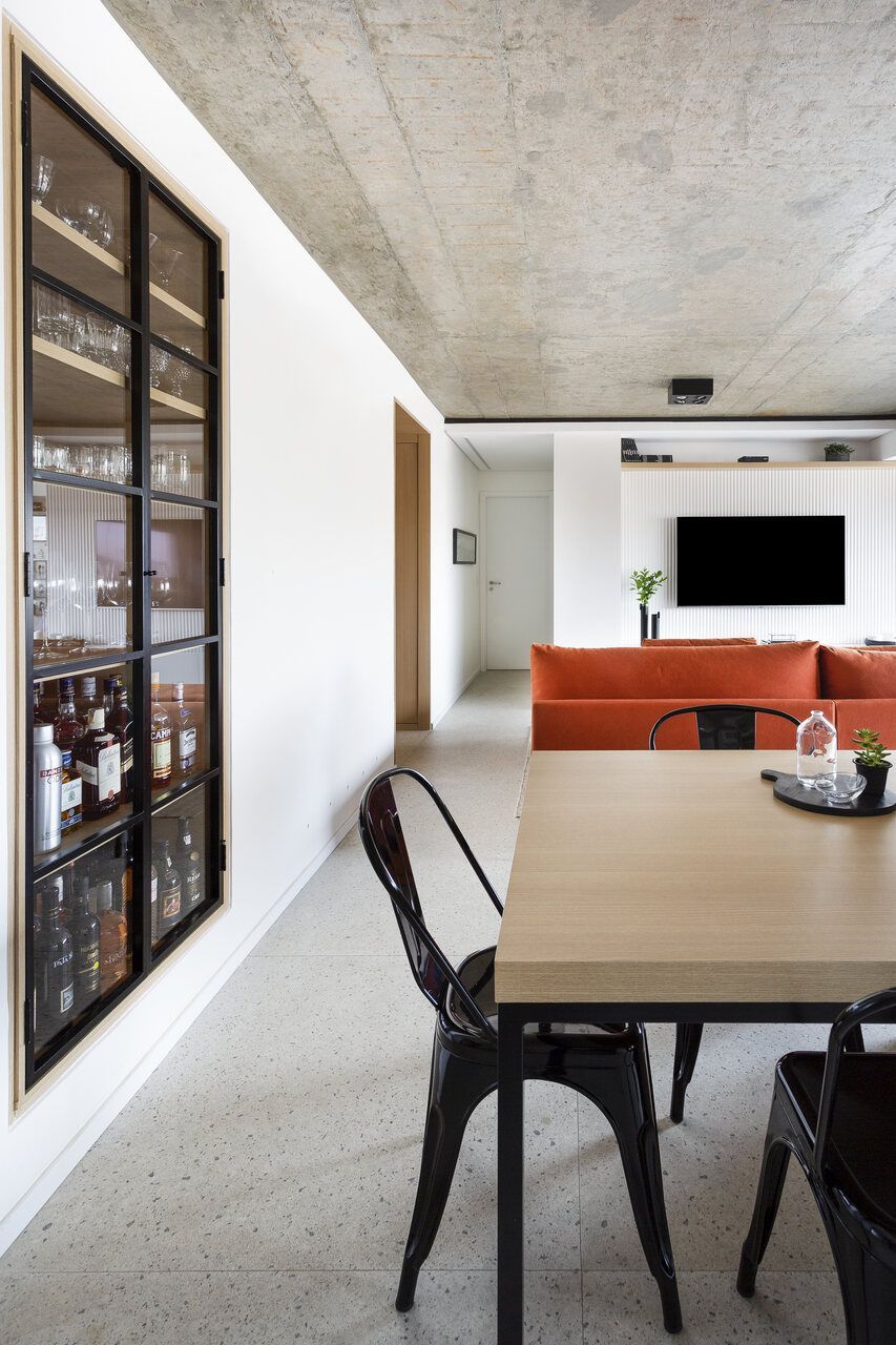A composição de cores neutras do piso e das paredes com a cor forte laranja do sofá é um destaque para o espaço. Descascamos a pintura do teto da sala, do pilar da ilha e do fundo da parede da varanda (atrás dos quadros) para expor o concreto aparente e trazer esse ar contemporâneo do projeto. O projeto é especial por ter atendido o desejo dos clientes com a criação de muitos armários em um espaço atemporal e prático.