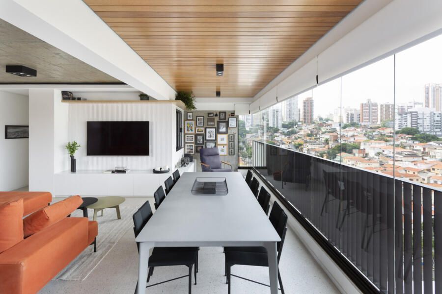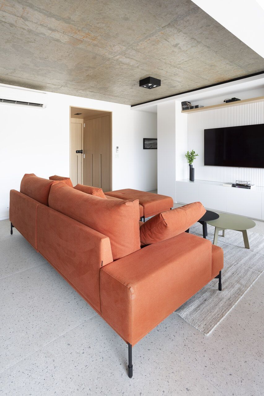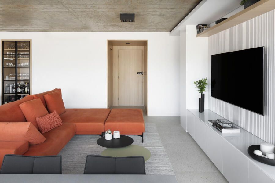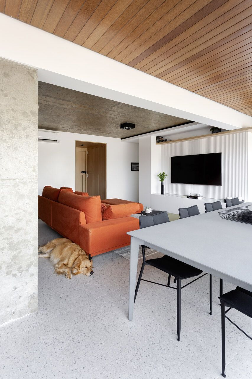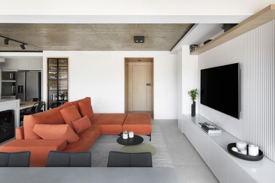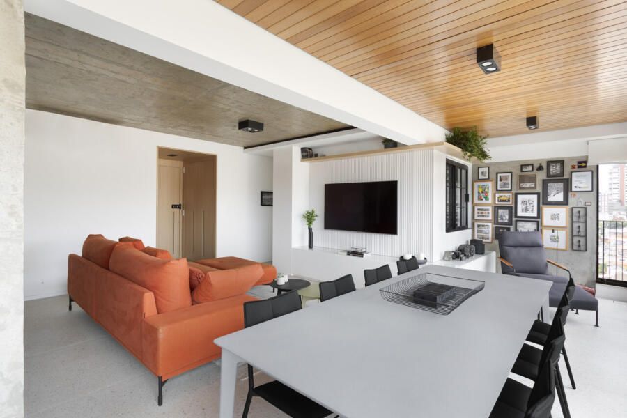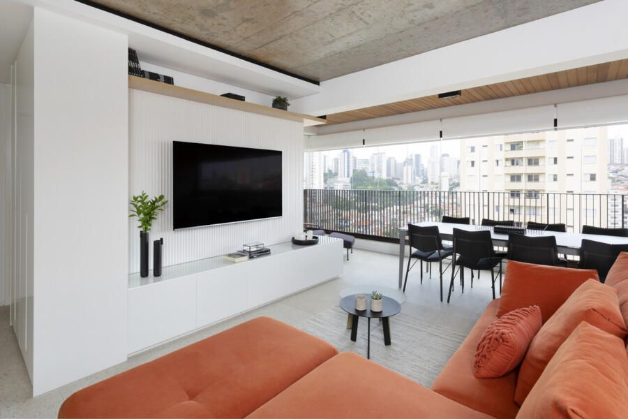 Todos os tampos das áreas molhadas foram executados em porcelanato. Atrás da TV, um porcelanato ripado garante durabilidade e praticidade ao espaço. Sobre a paleta de cores e o ar contemporâneo conferido ao projeto, o destaque fica por conta do sofá laranja.