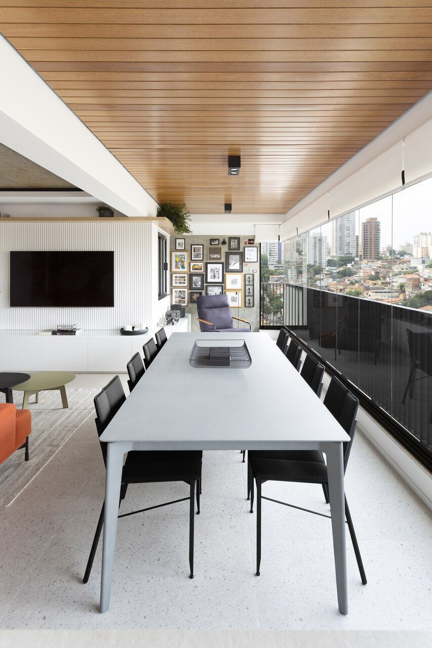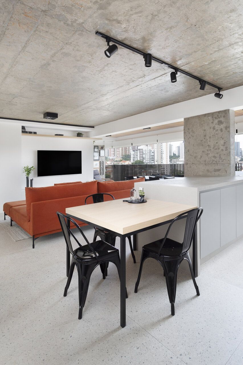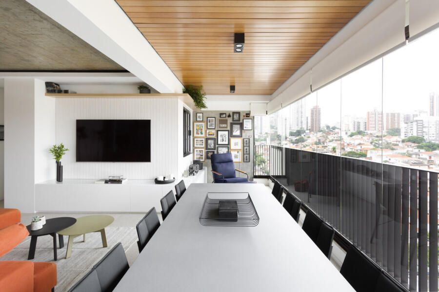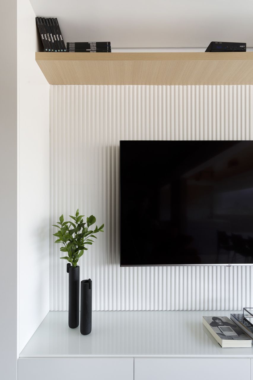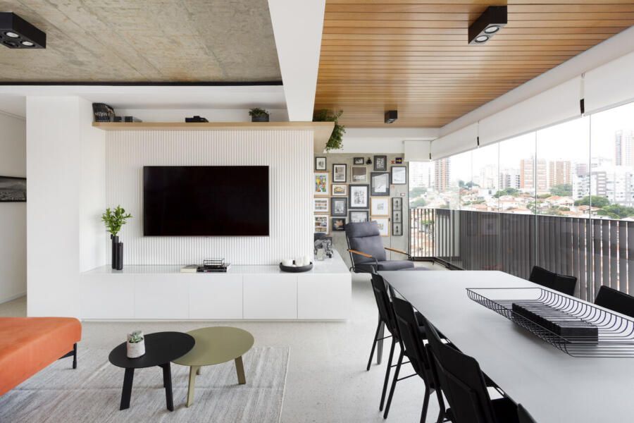 Todos os tampos das áreas molhadas foram executados em porcelanato. Atrás da TV, um porcelanato ripado garante durabilidade e praticidade ao espaço. Sobre a paleta de cores e o ar contemporâneo conferido ao projeto, o destaque fica por conta do sofá laranja.