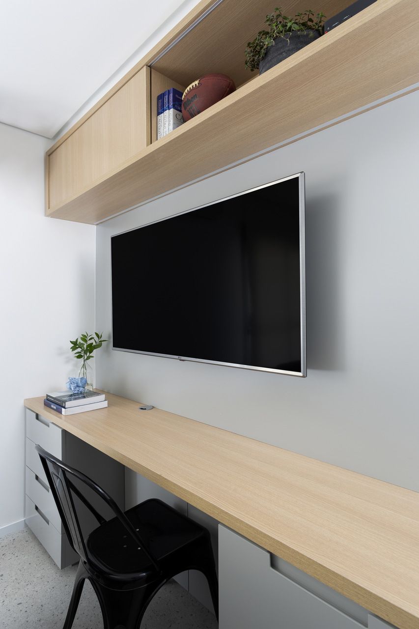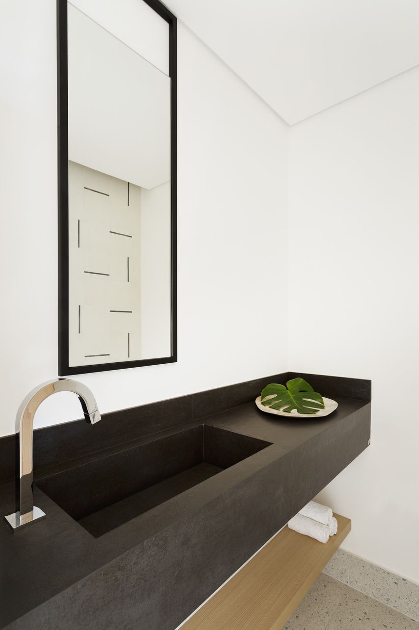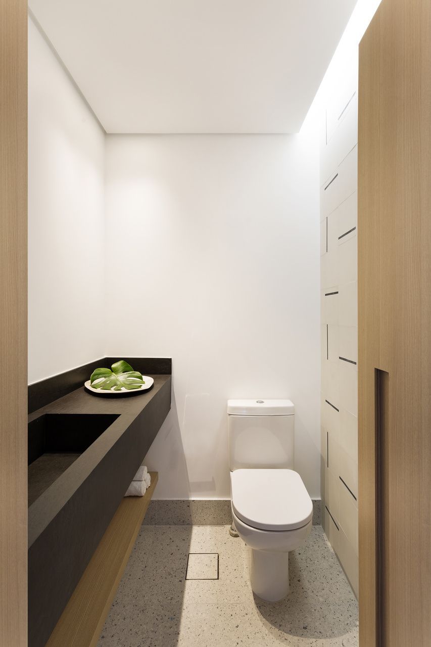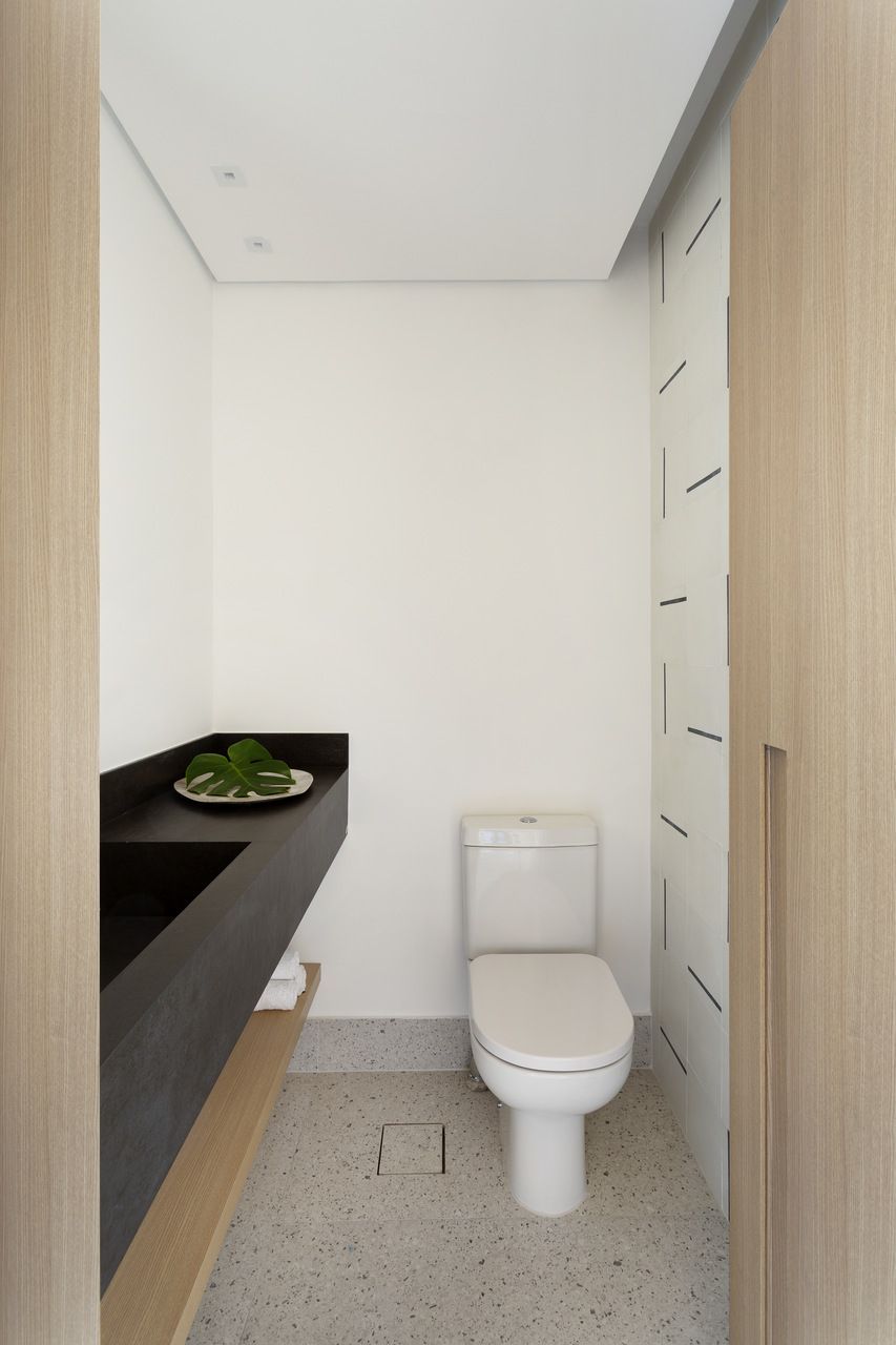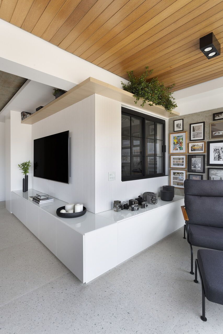 Todos os tampos das áreas molhadas foram executados em porcelanato. Atrás da TV, um porcelanato ripado garante durabilidade e praticidade ao espaço. Sobre a paleta de cores e o ar contemporâneo conferido ao projeto, o destaque fica por conta do sofá laranja.