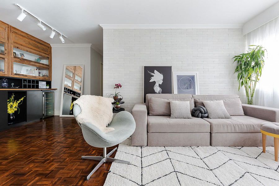 A cliente do escritório Breves Arquitetura adora receber os amigos e queria que o apartamento de 95m² tivesse a cozinha integrada com a sala e um ambiente convidativo e acolhedor.