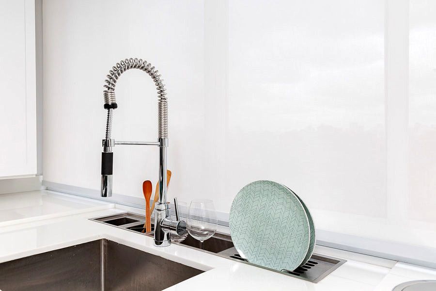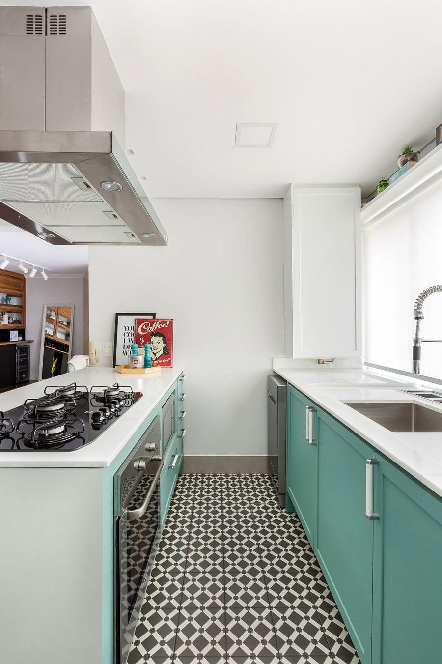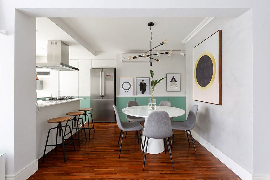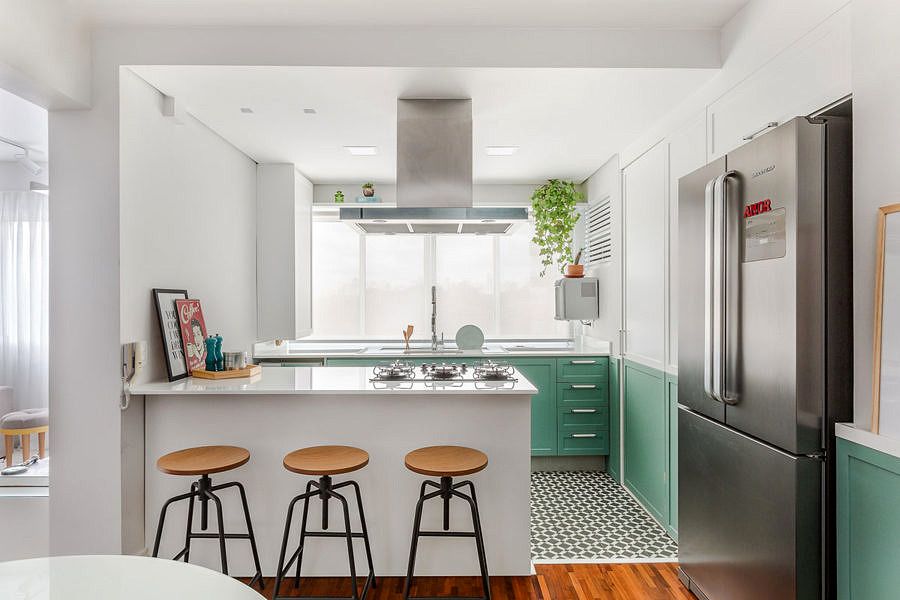 Um dos destaques do projeto, segundo o escritório, são as duas cores na marcenaria da cozinha. Por ela ser pequena, a cor verde na parte inferior e na parte superior a cor branca para trazer mais leveza para os ambientes da cozinha e sala de jantar.