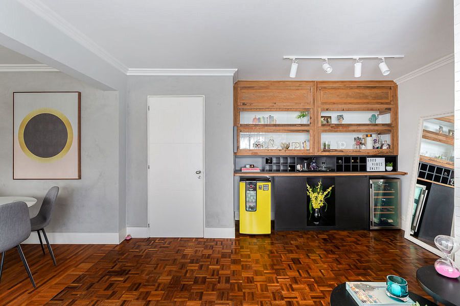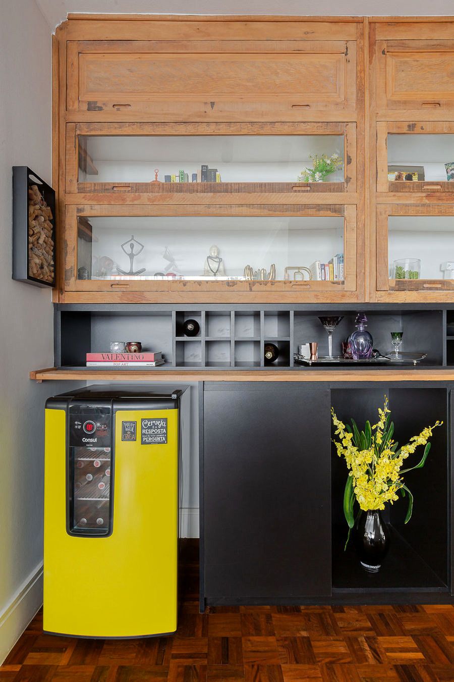 Outro desafio foi na sala, aproveitamos parte de um móvel de madeira de demolição para criar a parede do bar da casa.