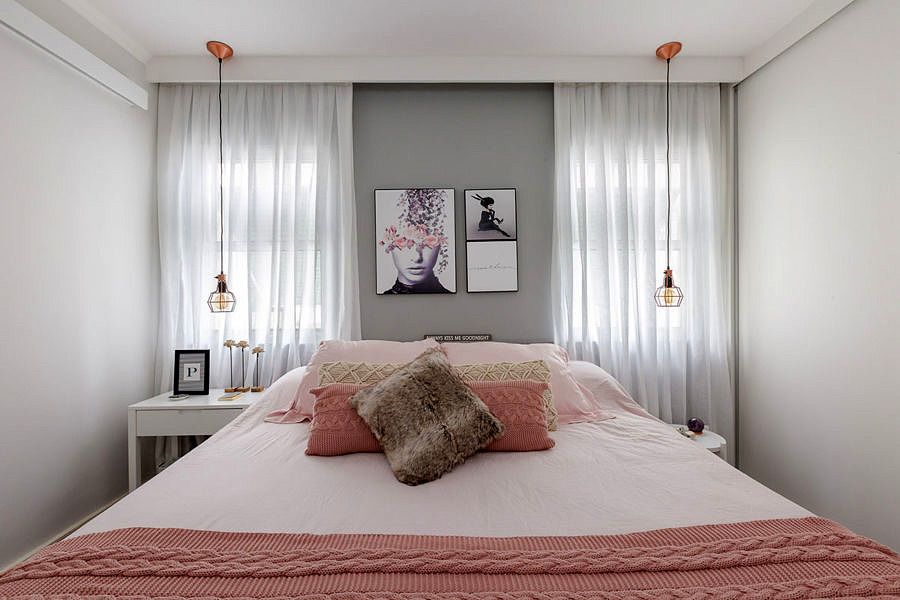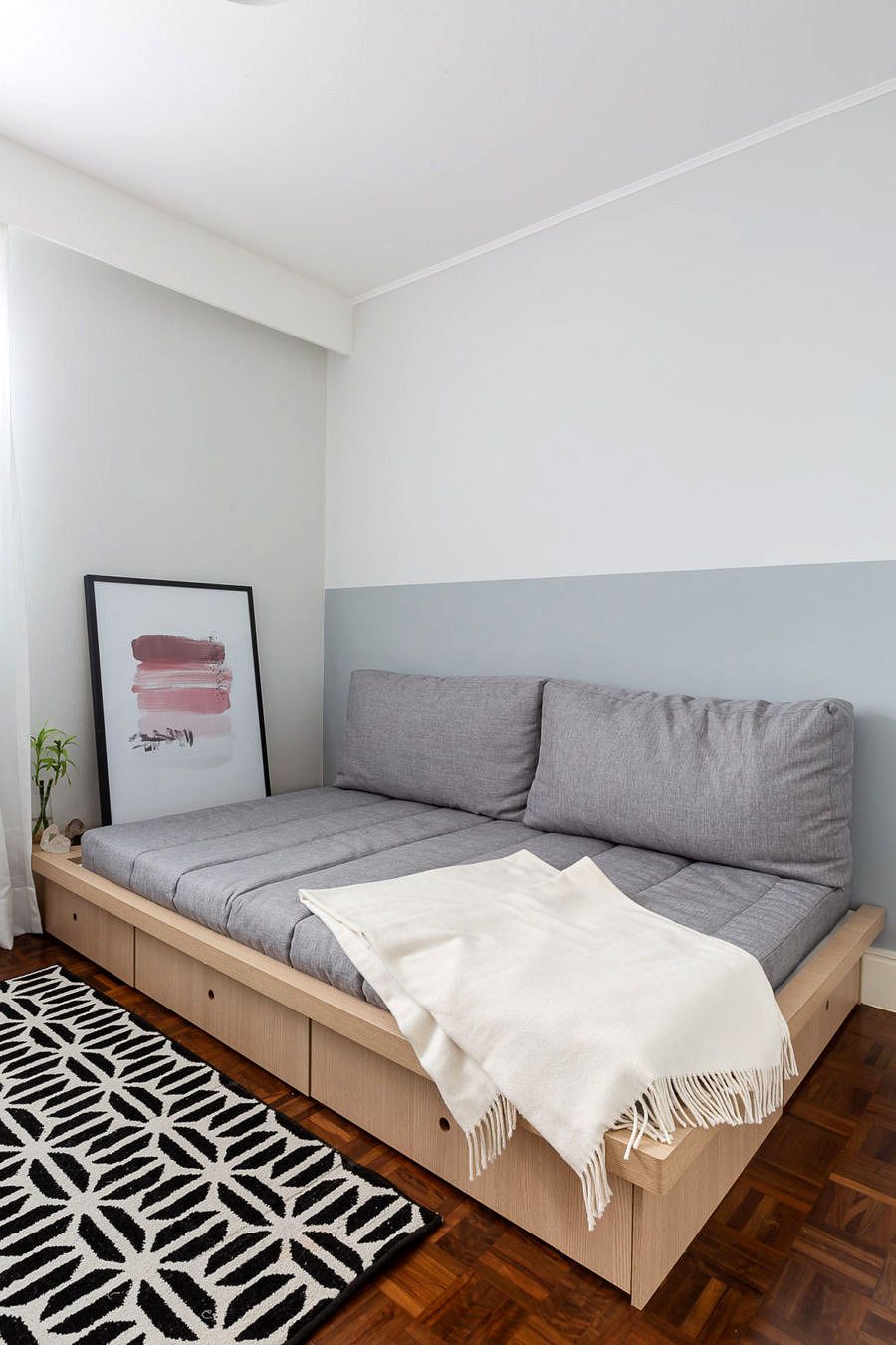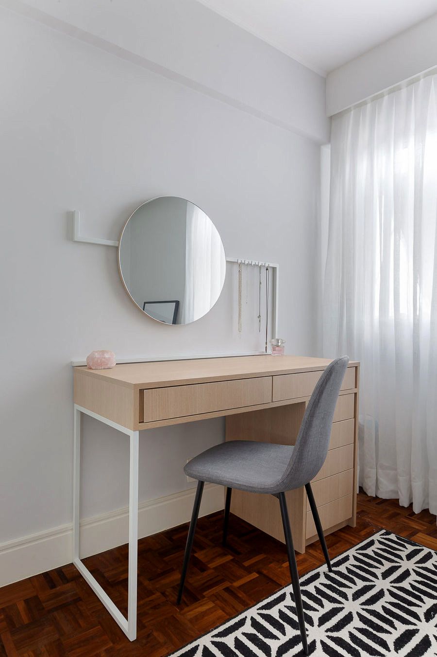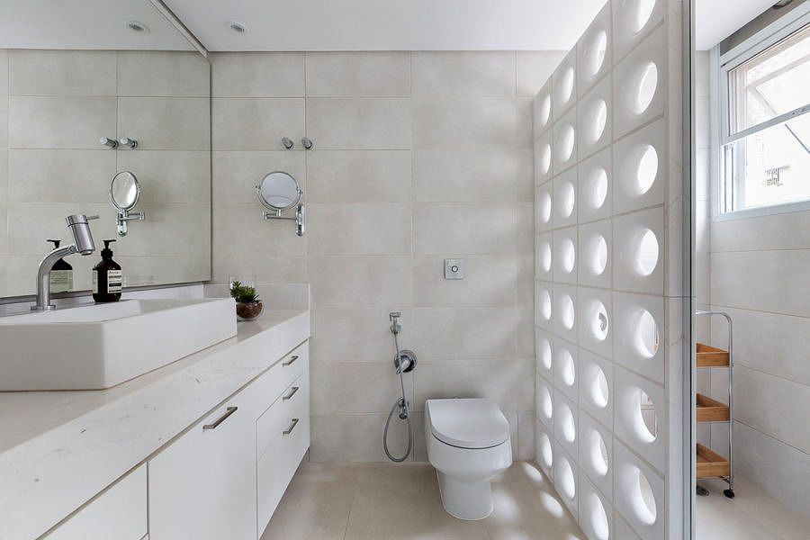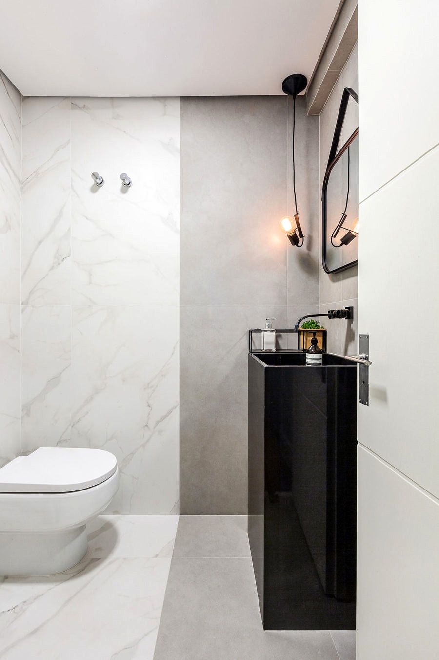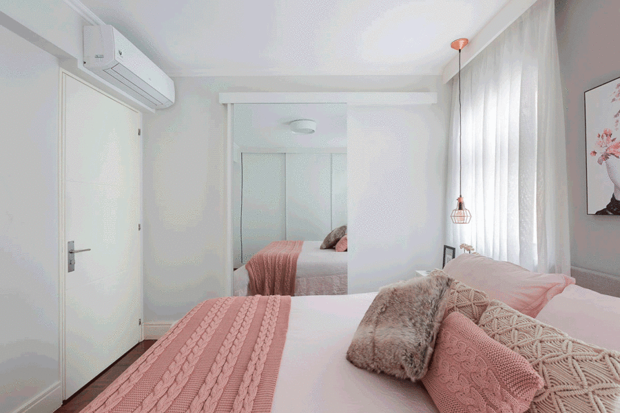 Como ela gosta de receber, era preciso que o banheiro social tivesse cara de lavabo. Já o quarto de hóspedes, foi pensado para ser um quarto para meditar, e ter a sua penteadeira para ser um quarto de se vestir. A suíte prática e feminina.