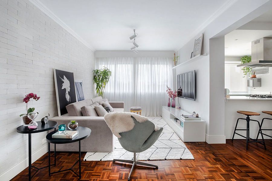 A cliente do escritório Breves Arquitetura adora receber os amigos e queria que o apartamento de 95m² tivesse a cozinha integrada com a sala e um ambiente convidativo e acolhedor.