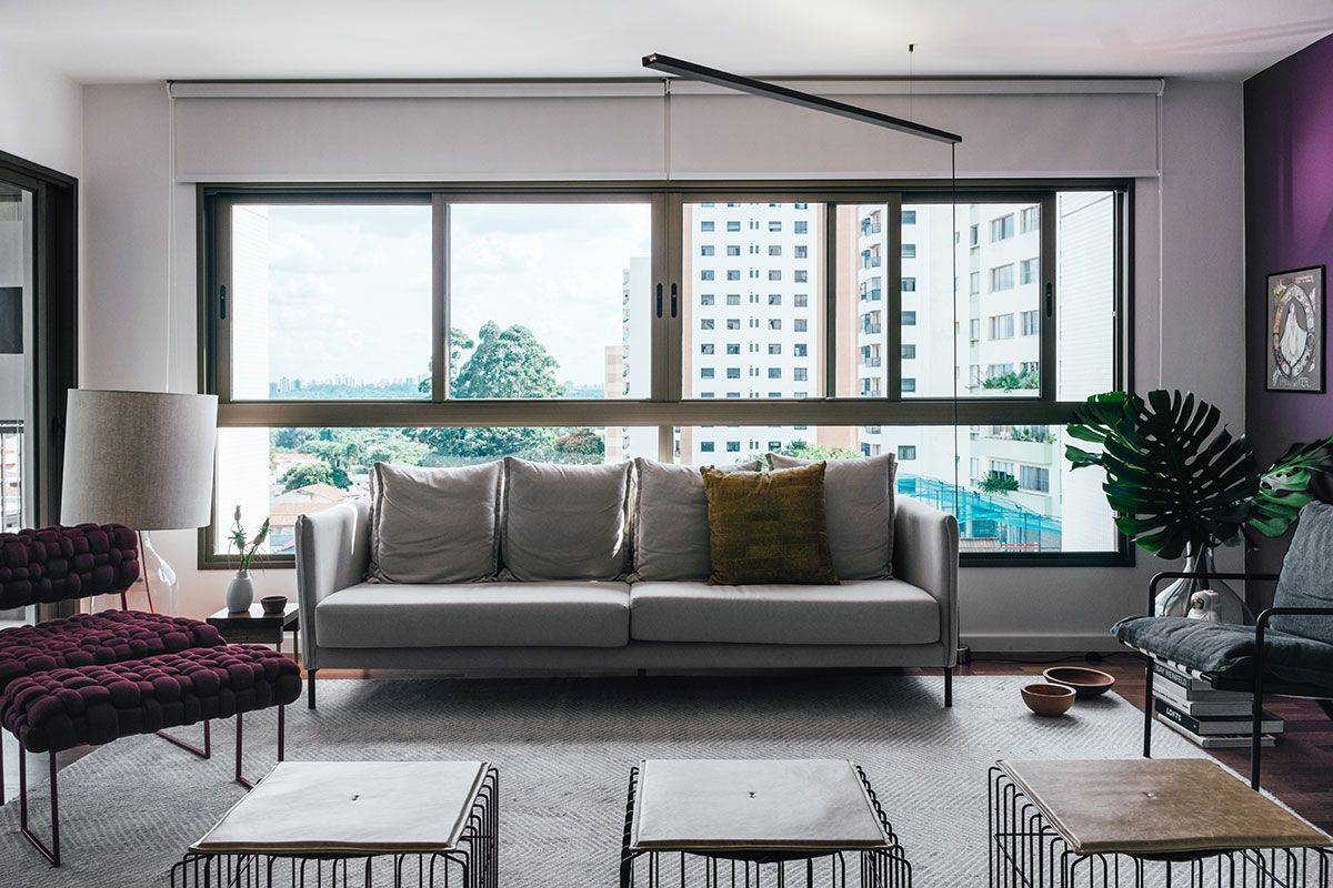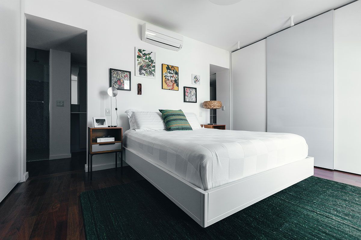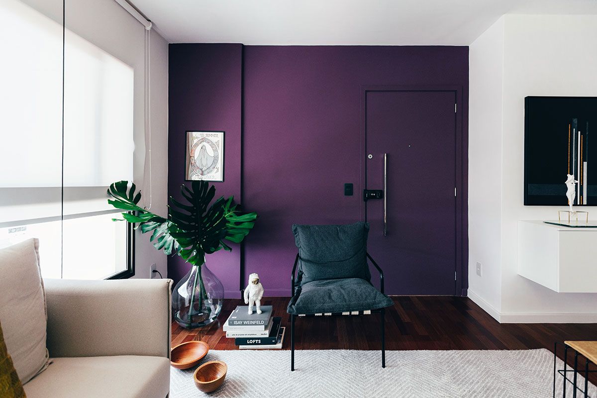 A cliente procurou o escritório MNBR Arquitetos com o desejo de ter um quarto maior e com um banheiro generoso, tipo um quarto de hotel. Além disso, era preciso ter no apartamento de 107m² uma parede roxa, era um desejo especial dela.