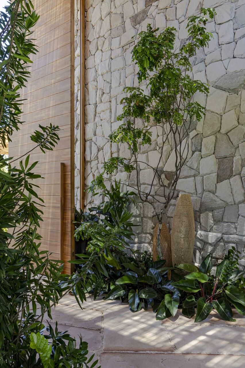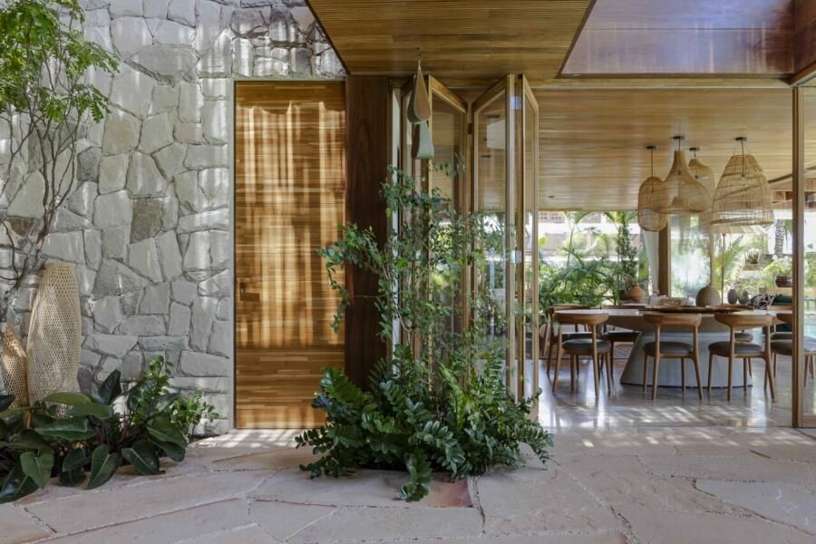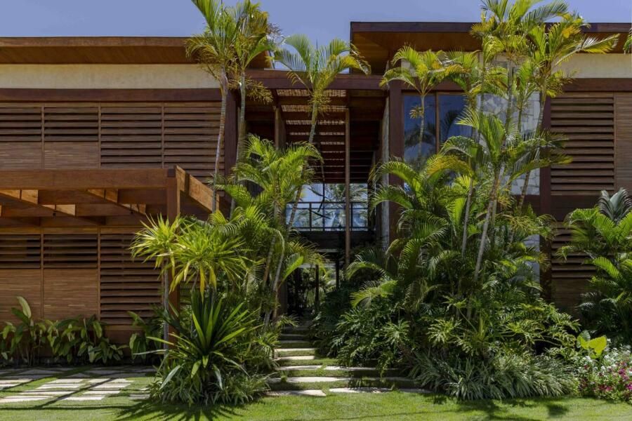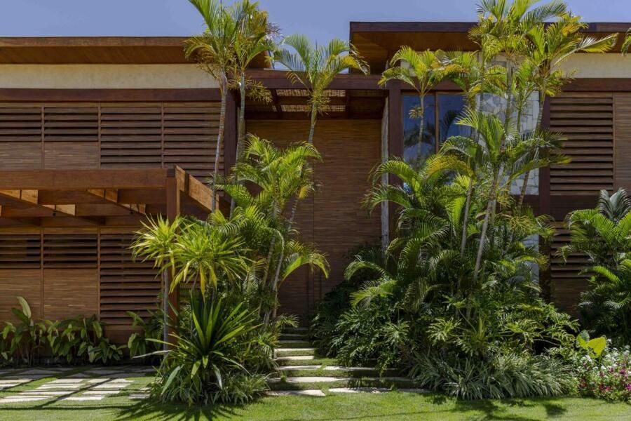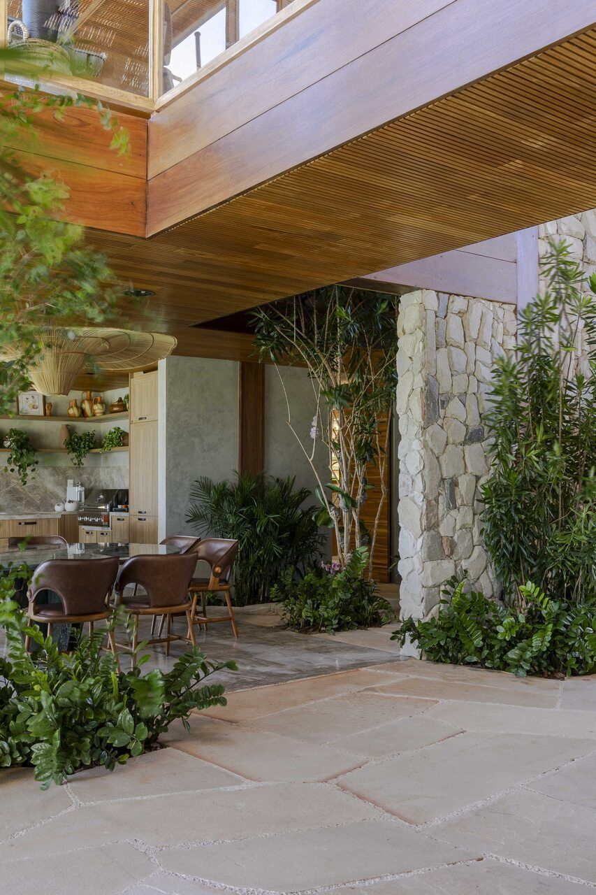“O estilo pode ser definido como tropical contemporâneo. Isso se deve ao uso de linhas retas, grandes vãos, panos de vidro, esquadrias em venezianas de madeira, que são elementos que marcam a arquitetura do nosso tempo atual. Ao mesmo tempo, a casa mantém o charme e a rusticidade de uma casa de praia em estilo resort, através da utilização de madeira, pedras naturais, telhas planas que remetem a taubilha e paisagismo exuberante.”