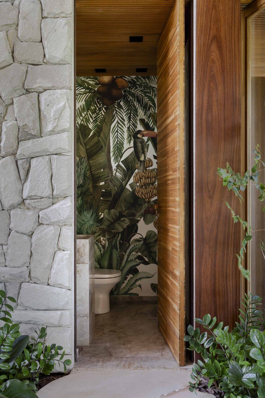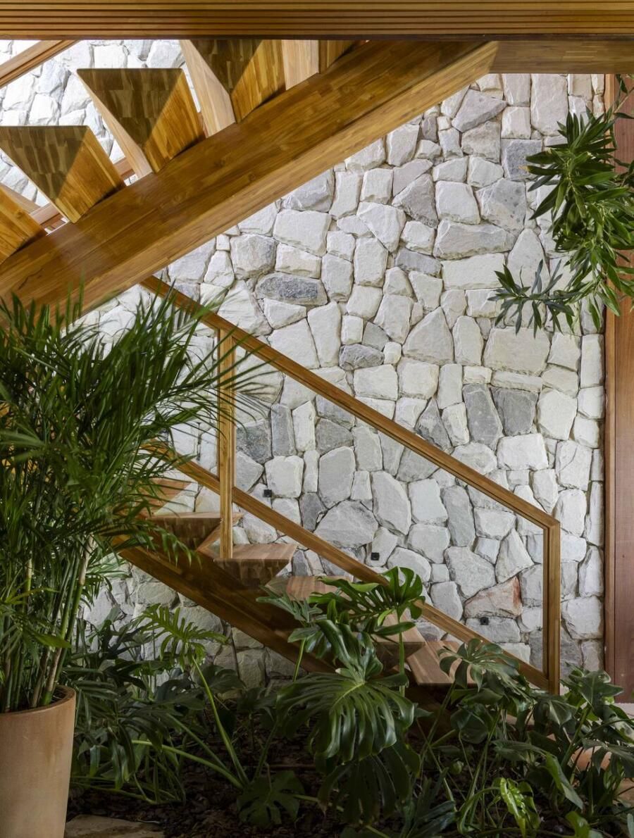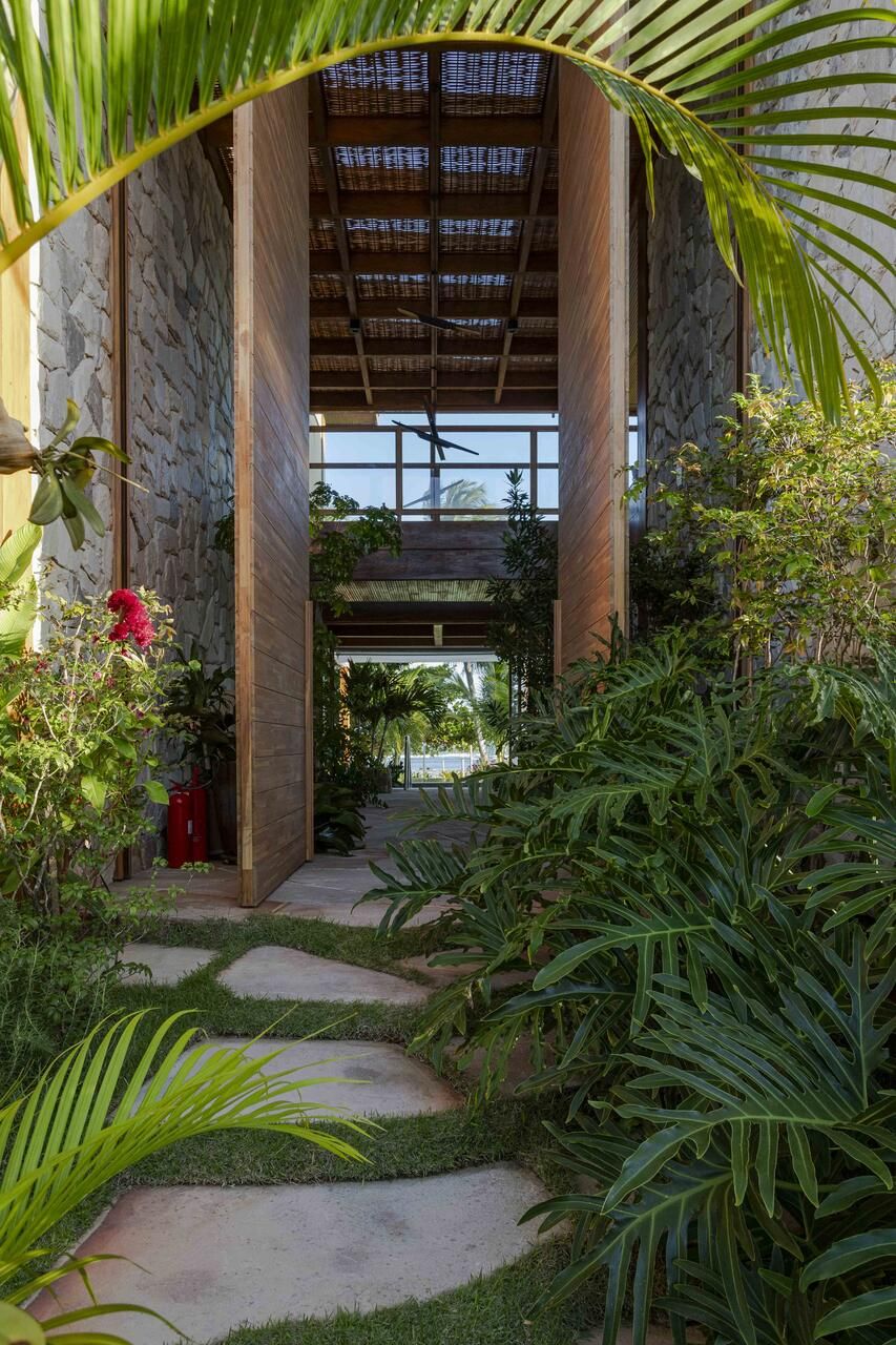 “O estilo pode ser definido como tropical contemporâneo. Isso se deve ao uso de linhas retas, grandes vãos, panos de vidro, esquadrias em venezianas de madeira, que são elementos que marcam a arquitetura do nosso tempo atual. Ao mesmo tempo, a casa mantém o charme e a rusticidade de uma casa de praia em estilo resort, através da utilização de madeira, pedras naturais, telhas planas que remetem a taubilha e paisagismo exuberante.”
