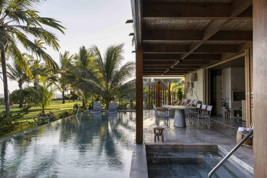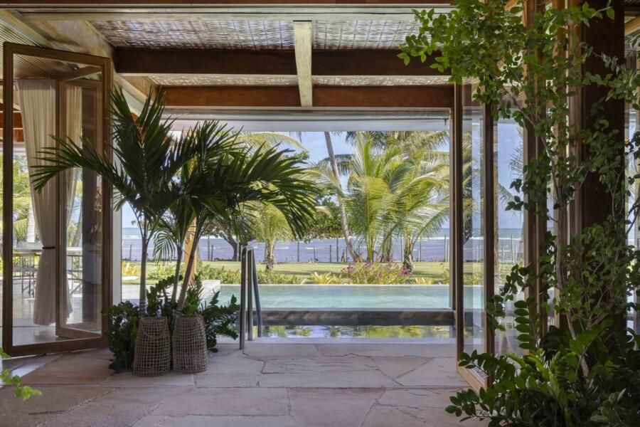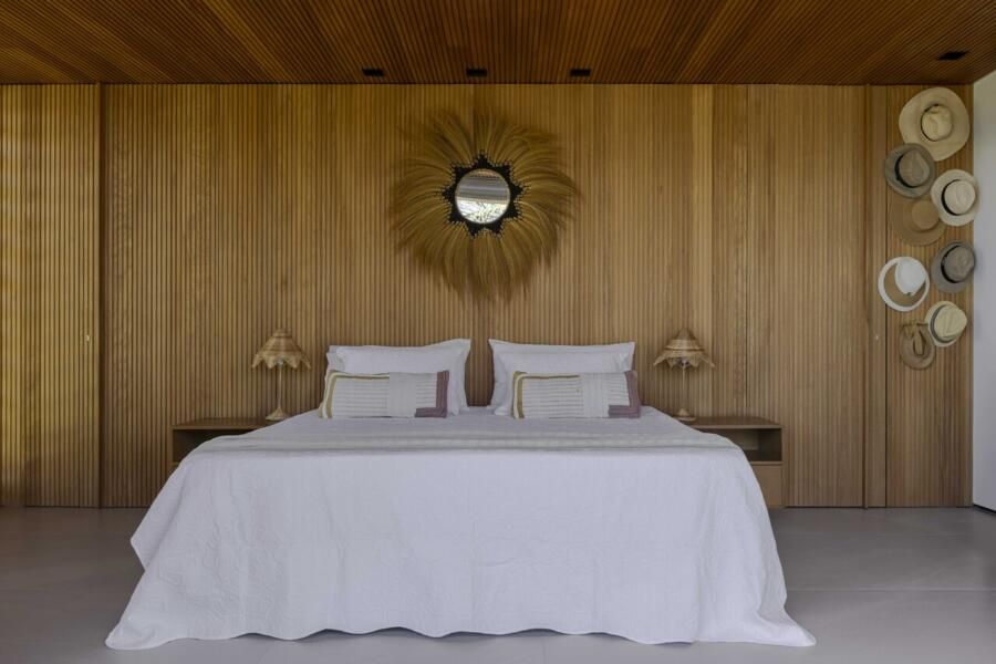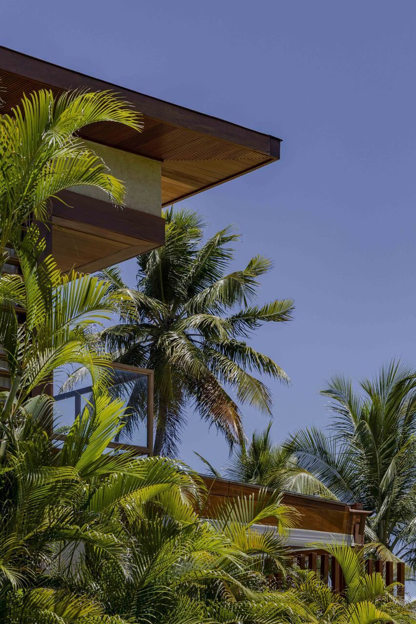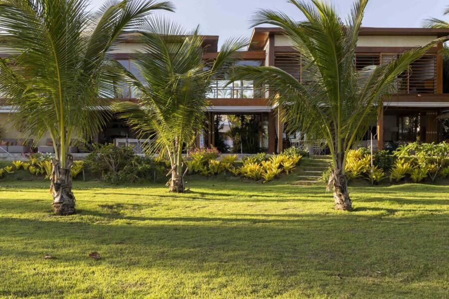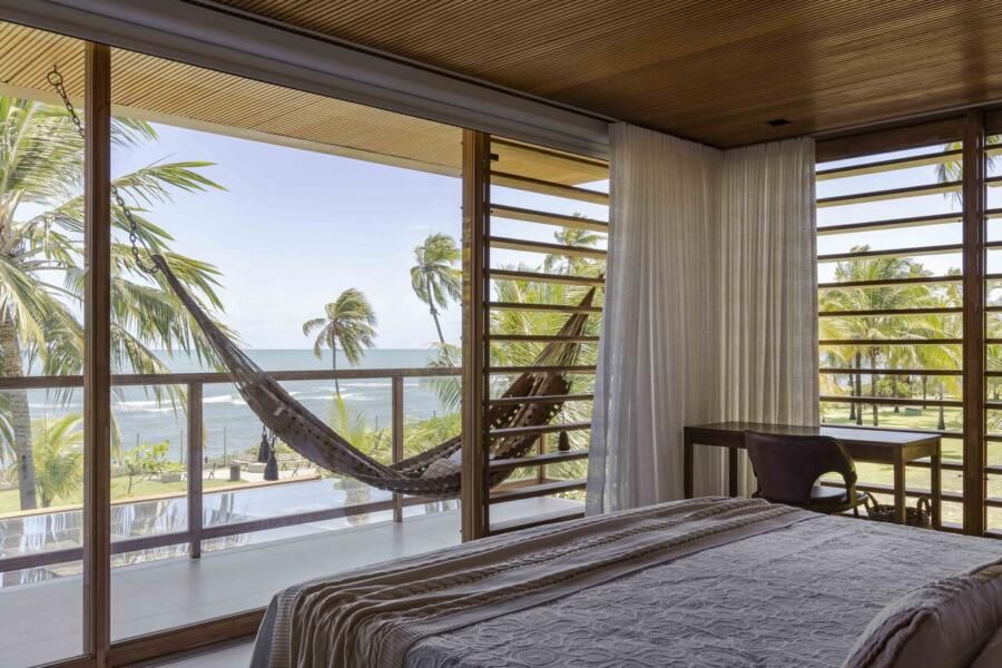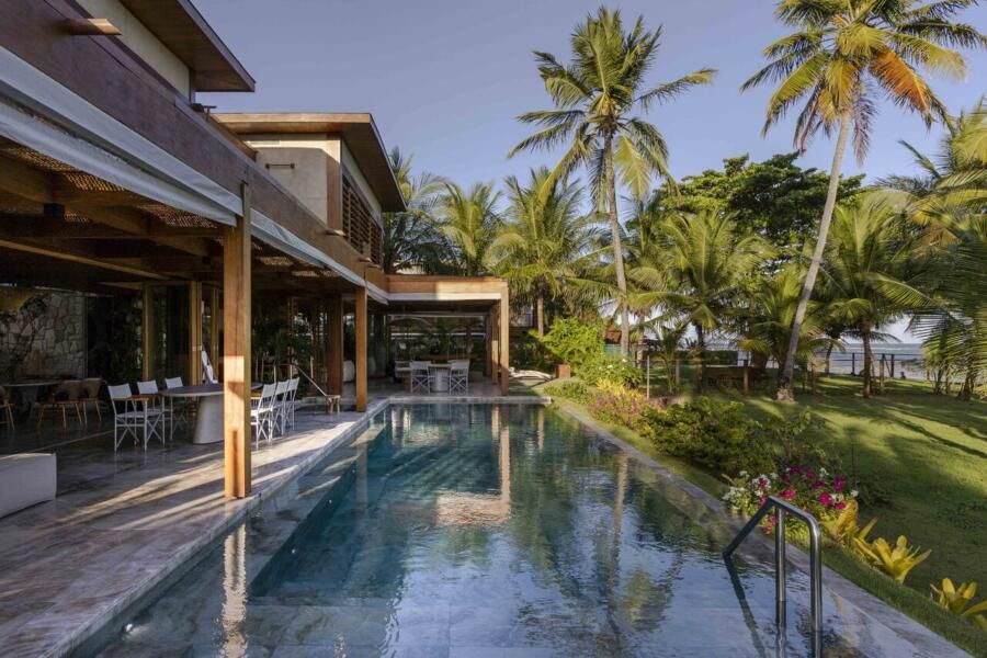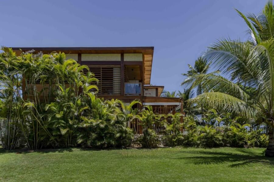 A arquitetura foi pensada para dar protagonismo ao cenário paradisíaco da Praia do Forte, na Bahia: ambientes sociais e íntimos se alinham lado a lado em frente ao mar, com grandes aberturas que convidam a luz natural a iluminar o interior e revelam o horizonte emoldurado pelas esquadrias. O projeto ainda aproveita ao máximo a ventilação cruzada, garantindo conforto térmico e eficiência energética, potencializada pelo uso de placas fotovoltaicas no telhado.