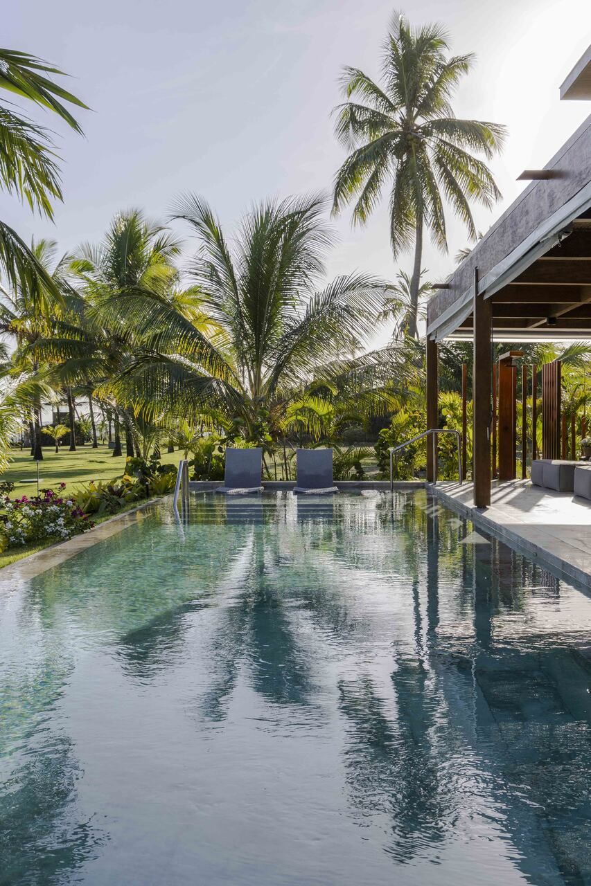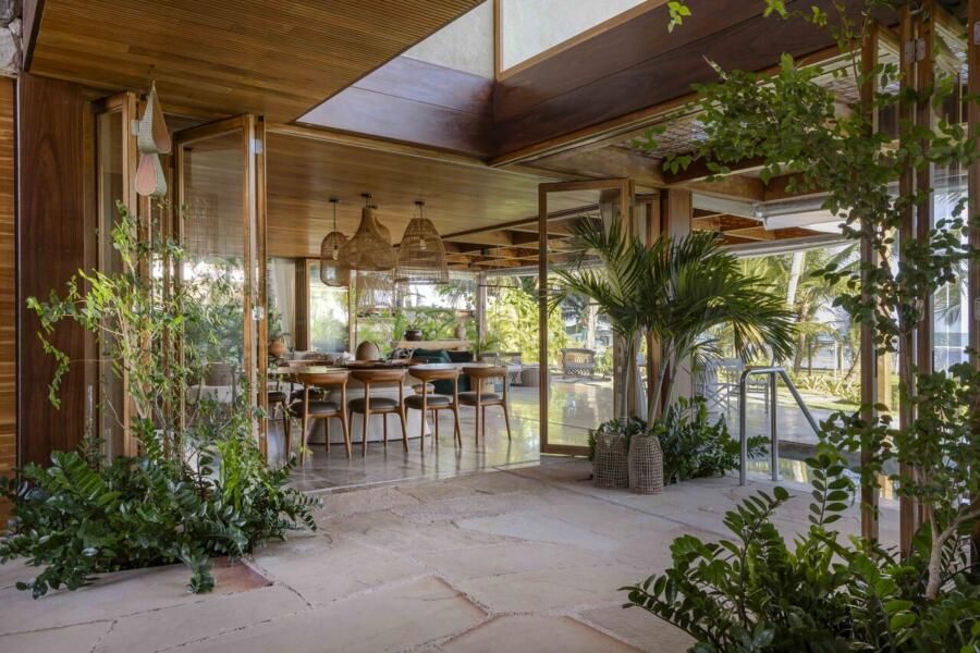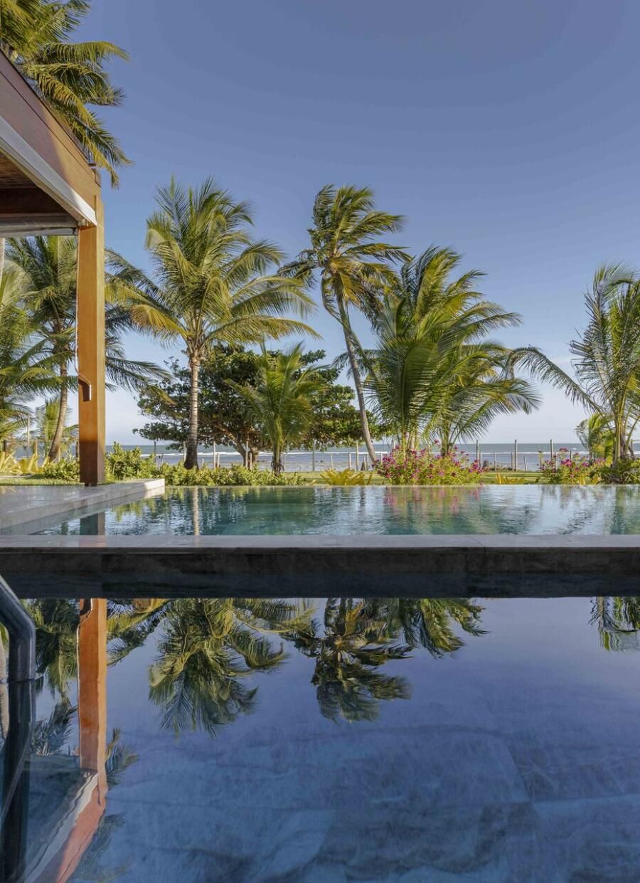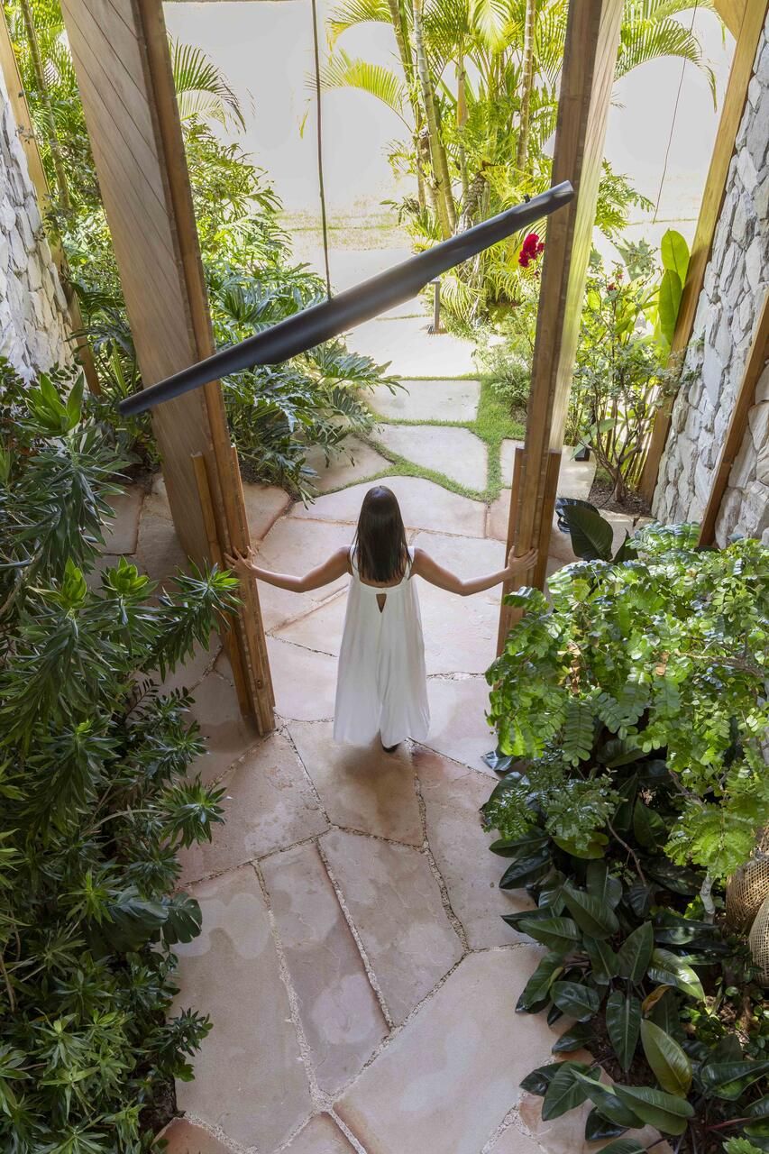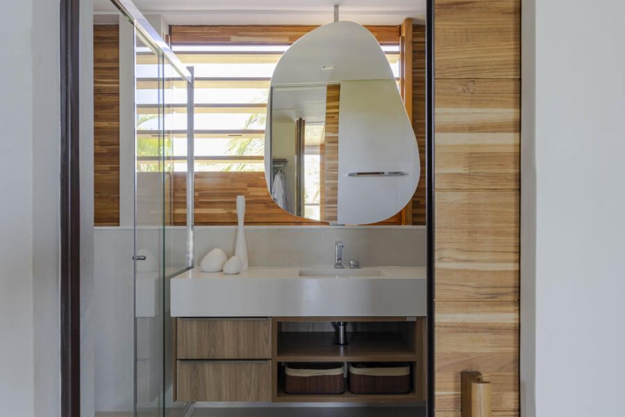 A arquitetura foi pensada para dar protagonismo ao cenário paradisíaco da Praia do Forte, na Bahia: ambientes sociais e íntimos se alinham lado a lado em frente ao mar, com grandes aberturas que convidam a luz natural a iluminar o interior e revelam o horizonte emoldurado pelas esquadrias. O projeto ainda aproveita ao máximo a ventilação cruzada, garantindo conforto térmico e eficiência energética, potencializada pelo uso de placas fotovoltaicas no telhado.