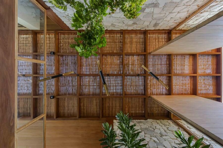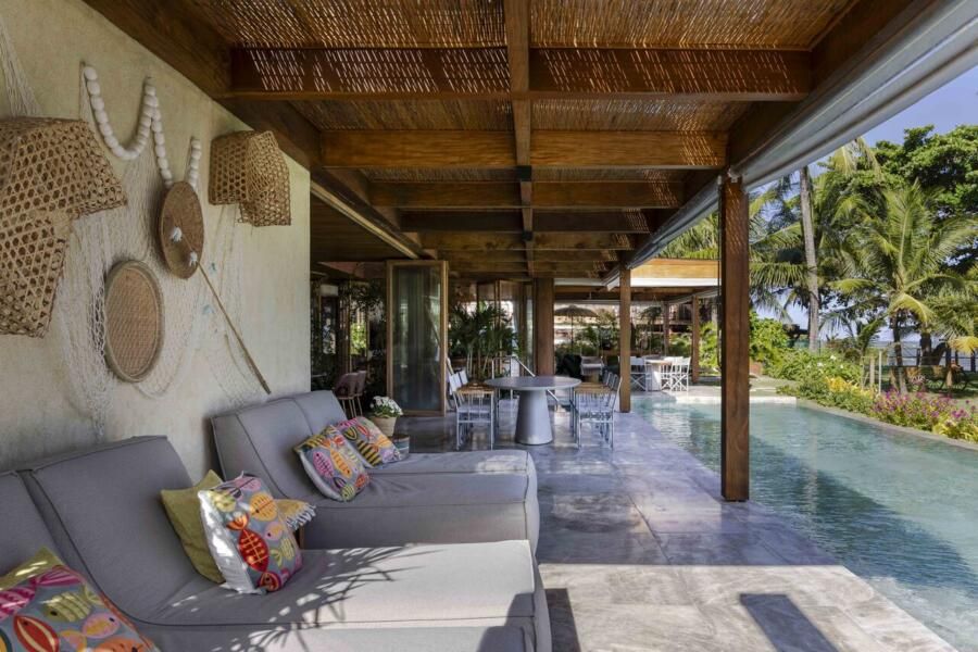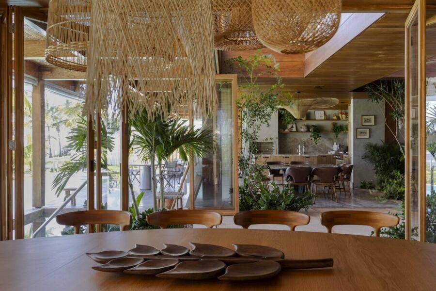 Nas fachadas, materiais em tons de bege remetem à areia da praia e criam uma paleta que se mimetiza à natureza. Materiais naturais aparecem como protagonistas, trazendo rusticidade e aconchego. Essa mesma lógica se estende ao interior, onde tons claros, marcenaria pontual e madeira aquecem os espaços, enquanto o mobiliário mistura peças brasileiras de design contemporâneo a outras de estética rústica. Obras de arte adquiridas em viagens e de artistas nordestinos adicionam identidade e afeto.