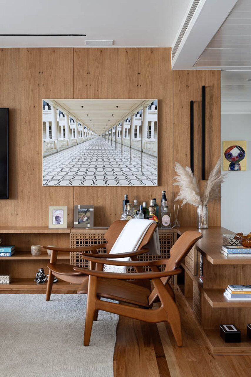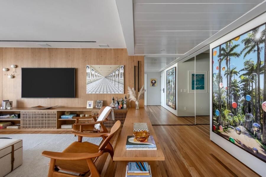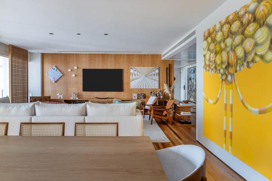 Integração da sala com marcenaria em destaque