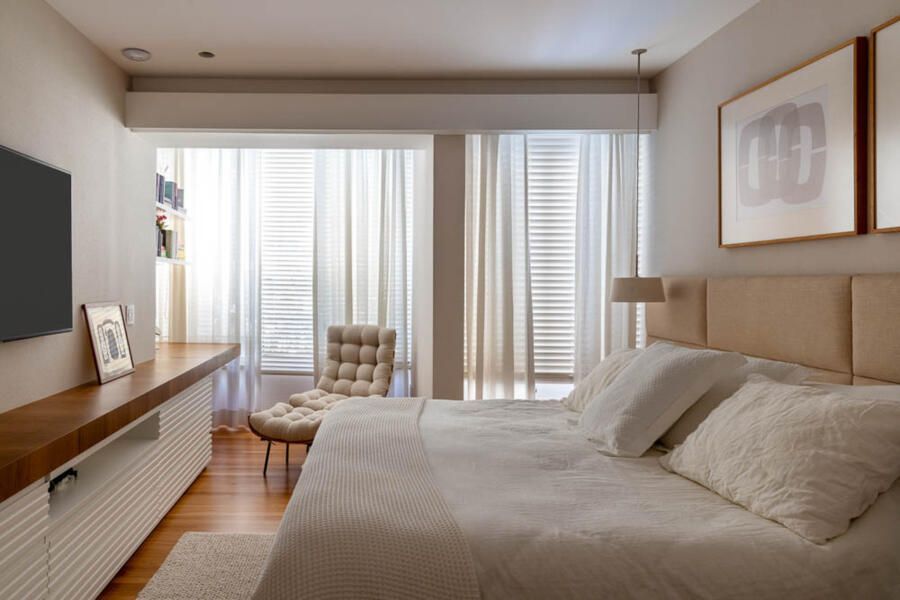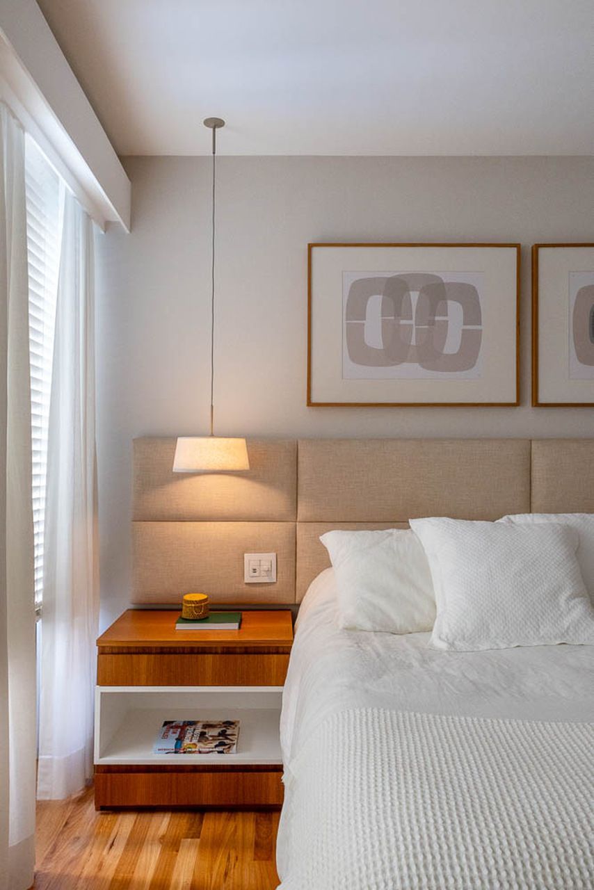 A ideia era deixar os ambientes mais claros, leves e confortáveis, valorizando os móveis e as obras de arte que o casal já tinha em casa.