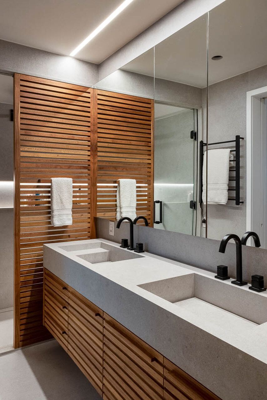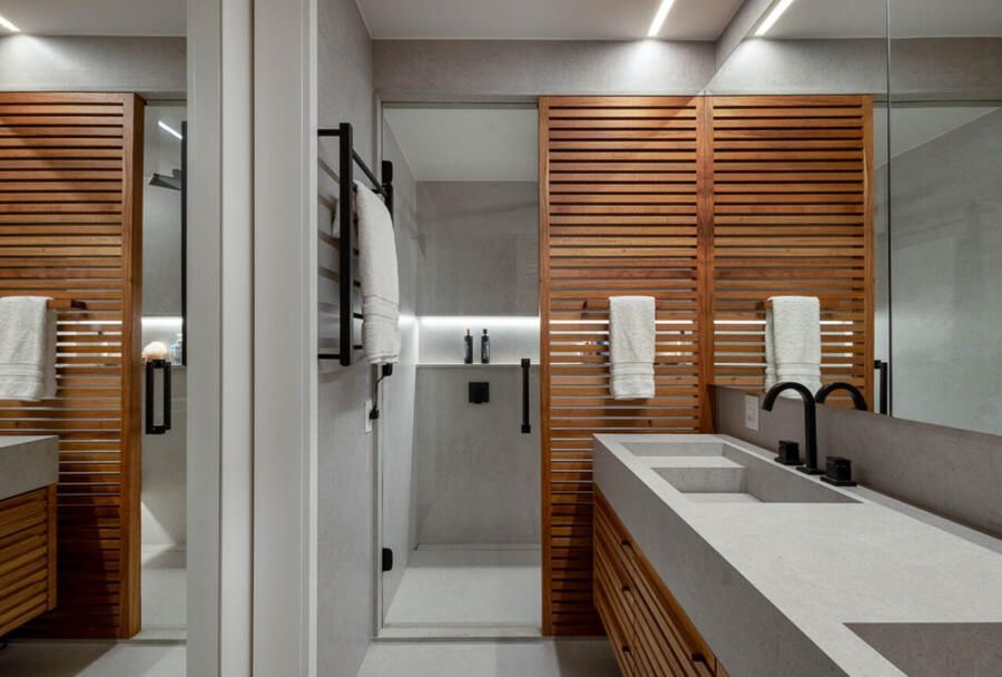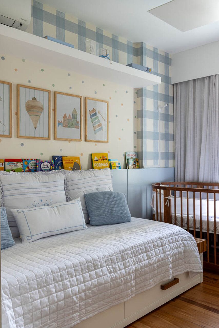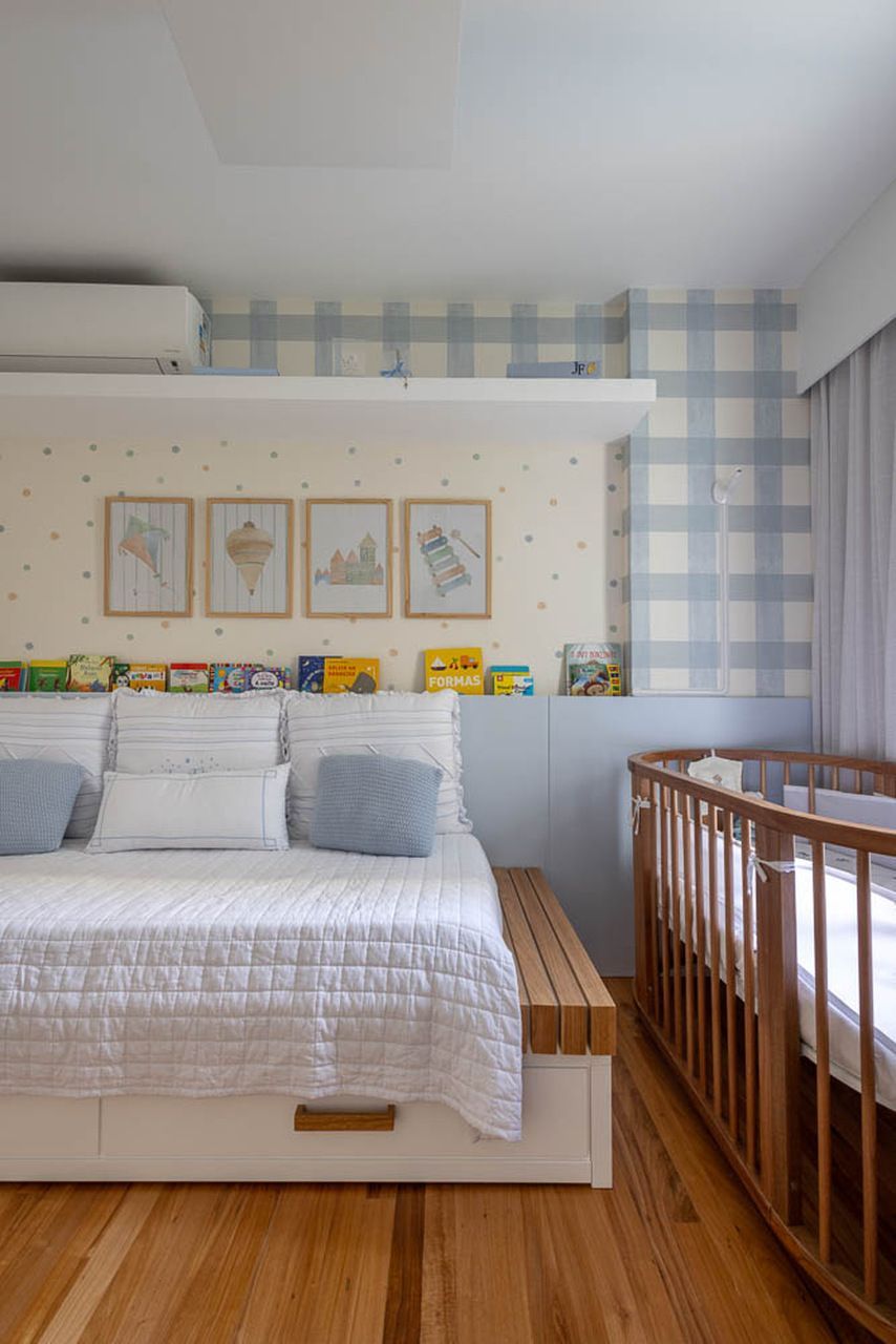 Na área íntima, o quarto do bebê foi decorado com azul claro, uma escolha simples que traz calma e aconchego. O quarto do casal tem tons neutros e um banheiro todo renovado, com uma bancada maior e venezianas de madeira que deixam a área do chuveiro mais charmosa e prática.