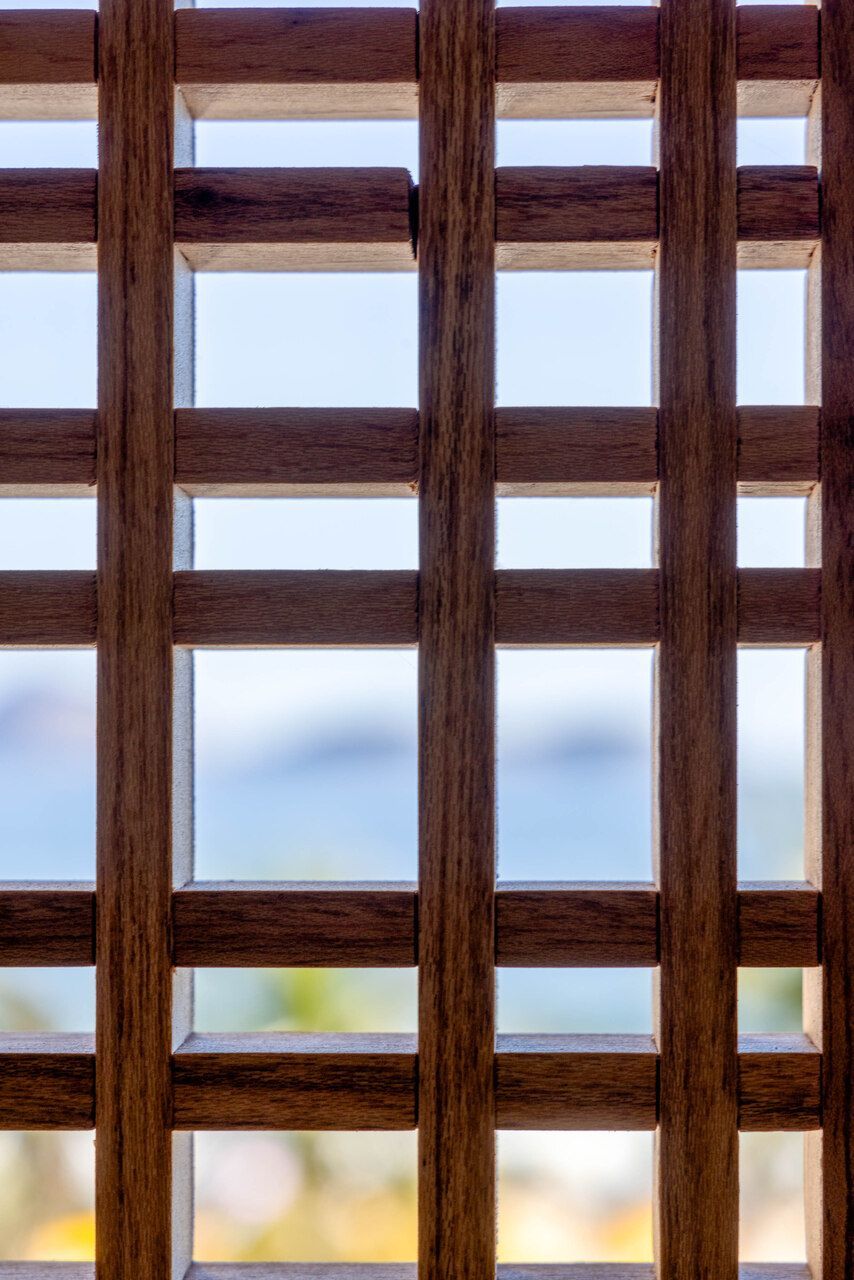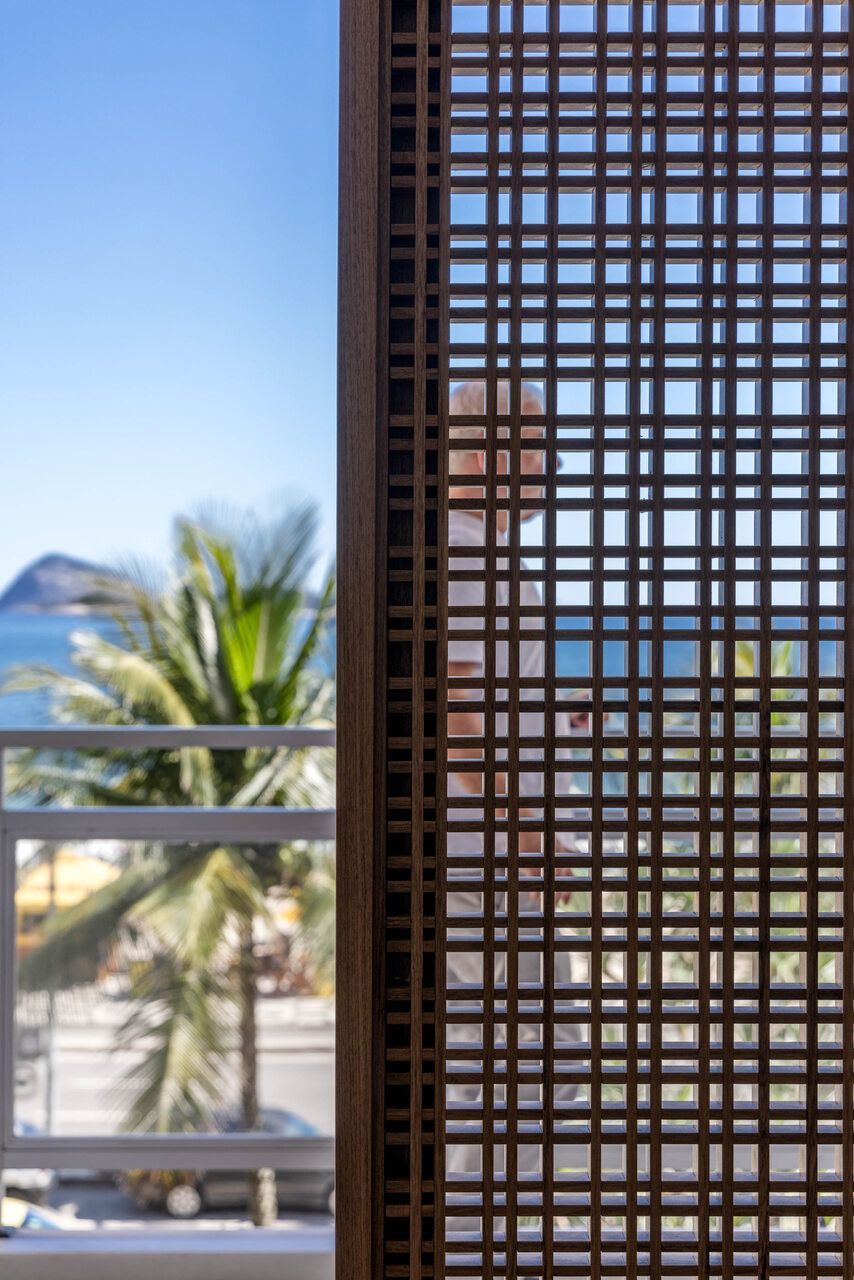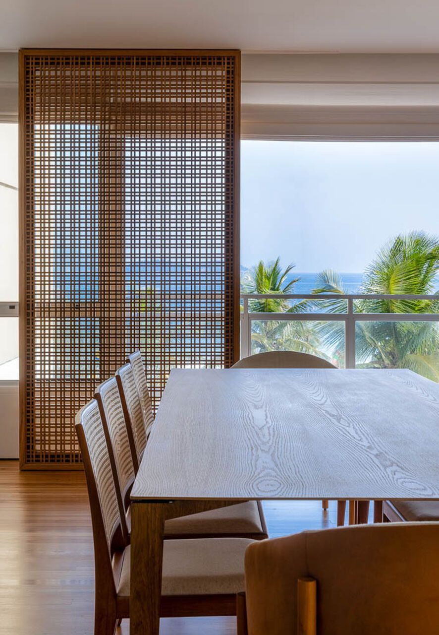 A sala era dividida em vários espaços pequenos, como um antigo home office. Depois da reforma, passou a ter um grande ambiente único, com sala de jantar e área de estar. Um detalhe que chama a atenção é o uso de painéis de madeira com desenhos vazados, que aparecem na divisória da varanda e nas portas do móvel da TV. Esses painéis servem para criar sombra e dar um toque especial ao ambiente.