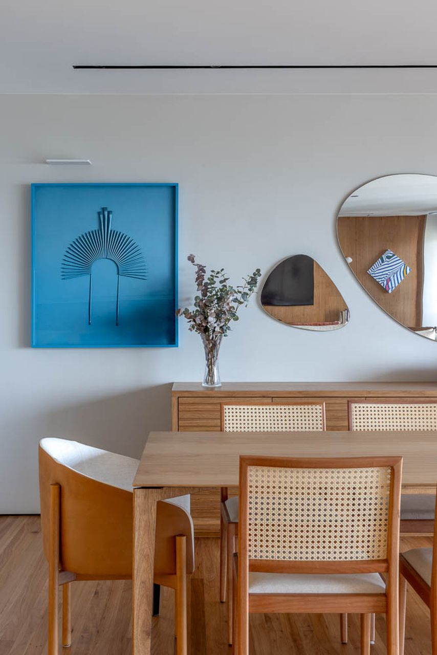 A bancada em formato de L ajuda a organizar a sala e cria um corredor lateral. Como o espaço tem poucas paredes, o corredor foi usado como uma pequena galeria para exibir quadros e objetos. Já na sala de jantar, um quadro grande preenche toda a parede lateral, trazendo mais vida ao espaço.