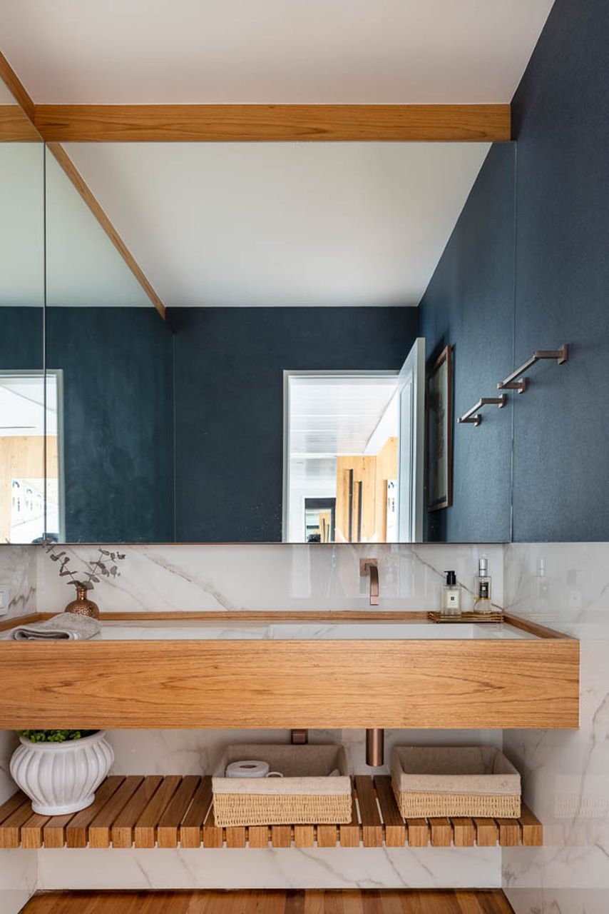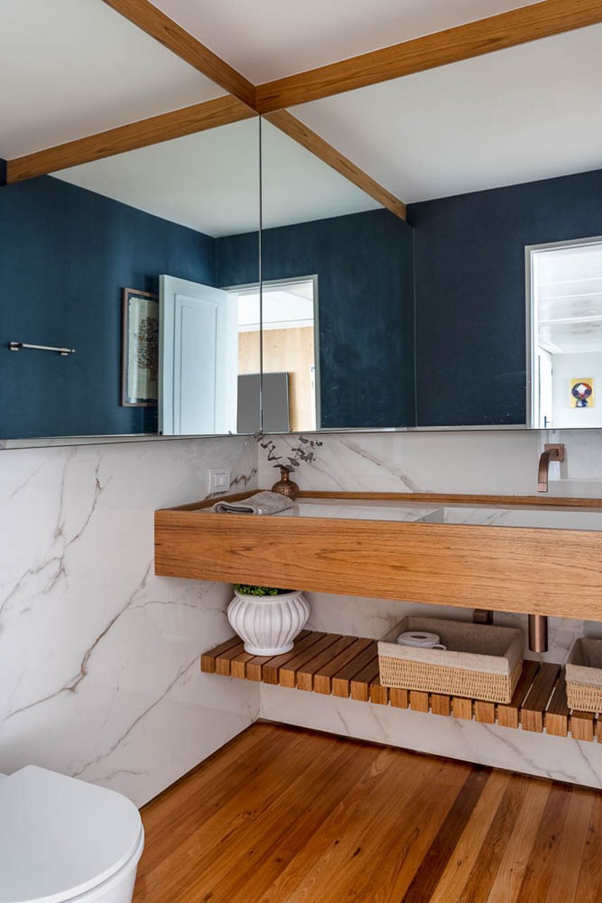 O lavabo foi o único espaço onde houve troca de revestimentos. Antes com um estilo mais antigo, agora tem paredes azul escuro e uma nova bancada que deixou tudo mais atual. Mesmo sendo um espaço pequeno, o resultado ficou bonito e diferente.