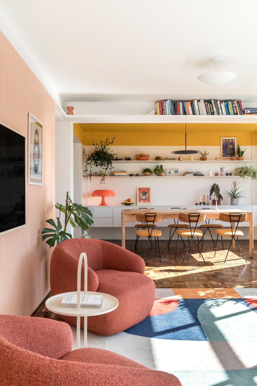 “Nosso ponto de partida foi o tapete da sala de estar, colorido e com formas orgânicas, dele é extraída toda a paleta de cores que compõe a área social, fazendo com que as cores utilizadas no apartamento ao mesmo tempo que sejam marcantes, conversem entre si e tragam harmonia. Essa unidade visual também é proporcionada pelo painel ripado coral que percorre toda a sala de estar, esconde a porta do lavabo e também mimetiza a televisão entre quadros.”