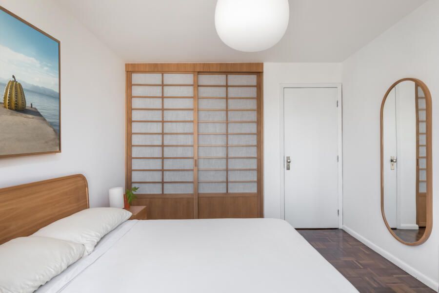“O contraponto às cores utilizadas nesse apartamento está na área íntima. Buscamos trazer para esse espaço atmosfera minimalista, mais serena e favorável ao relaxamento. Para o quarto do casal, utilizamos tons claros e madeiras, desenhos na cama, mesa de cabeceiras e porta do armário que mimetizam arquitetura japonesa dos antigos templos budistas.”