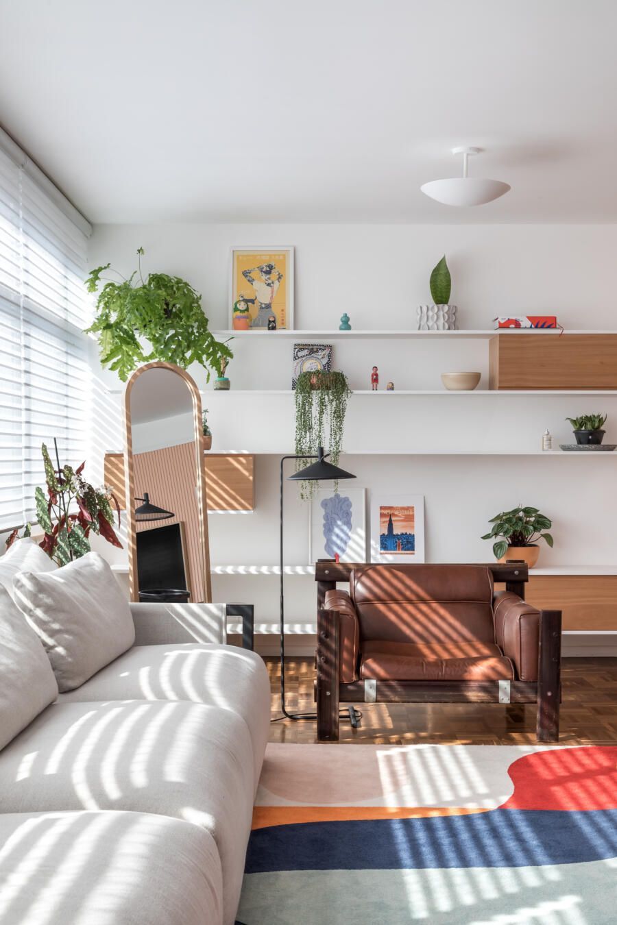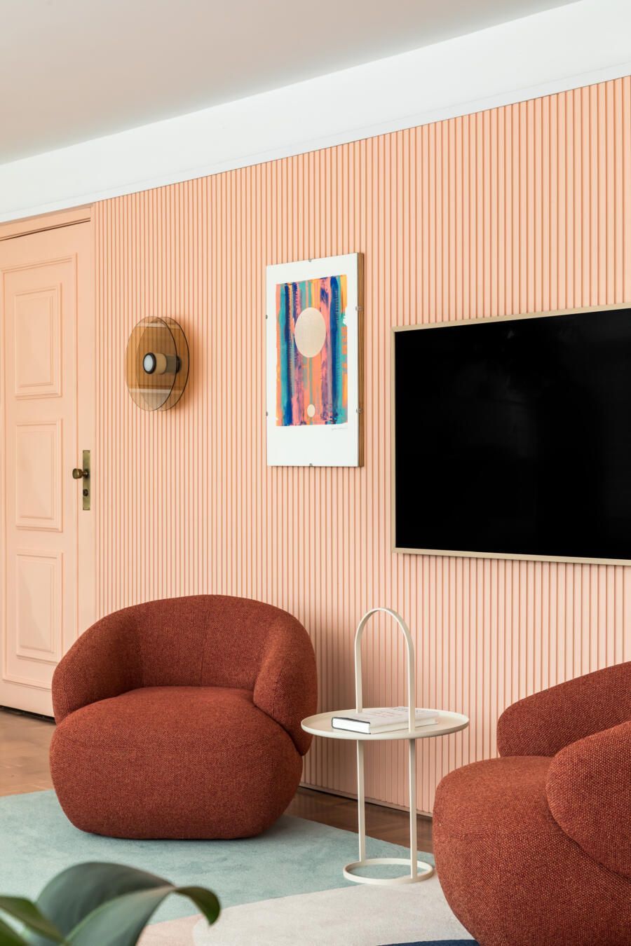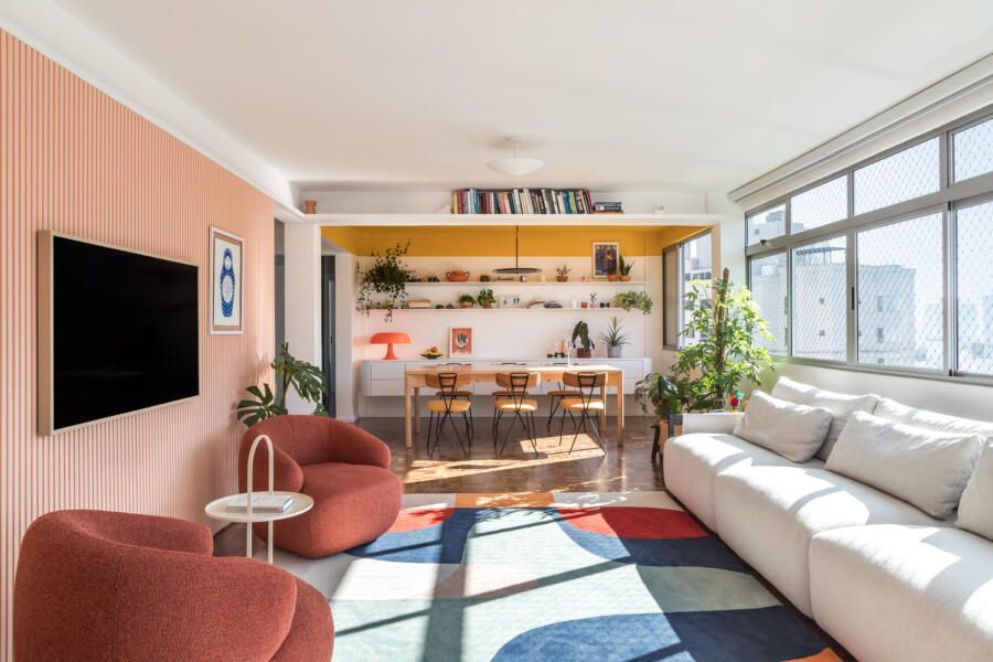 “Nosso ponto de partida foi o tapete da sala de estar, colorido e com formas orgânicas, dele é extraída toda a paleta de cores que compõe a área social, fazendo com que as cores utilizadas no apartamento ao mesmo tempo que sejam marcantes, conversem entre si e tragam harmonia. Essa unidade visual também é proporcionada pelo painel ripado coral que percorre toda a sala de estar, esconde a porta do lavabo e também mimetiza a televisão entre quadros.”