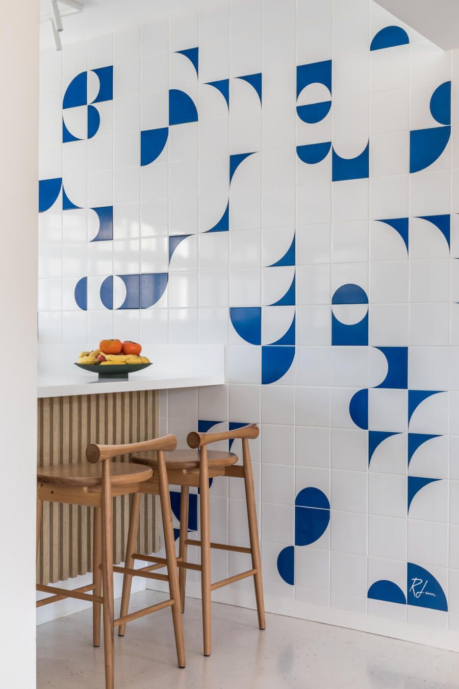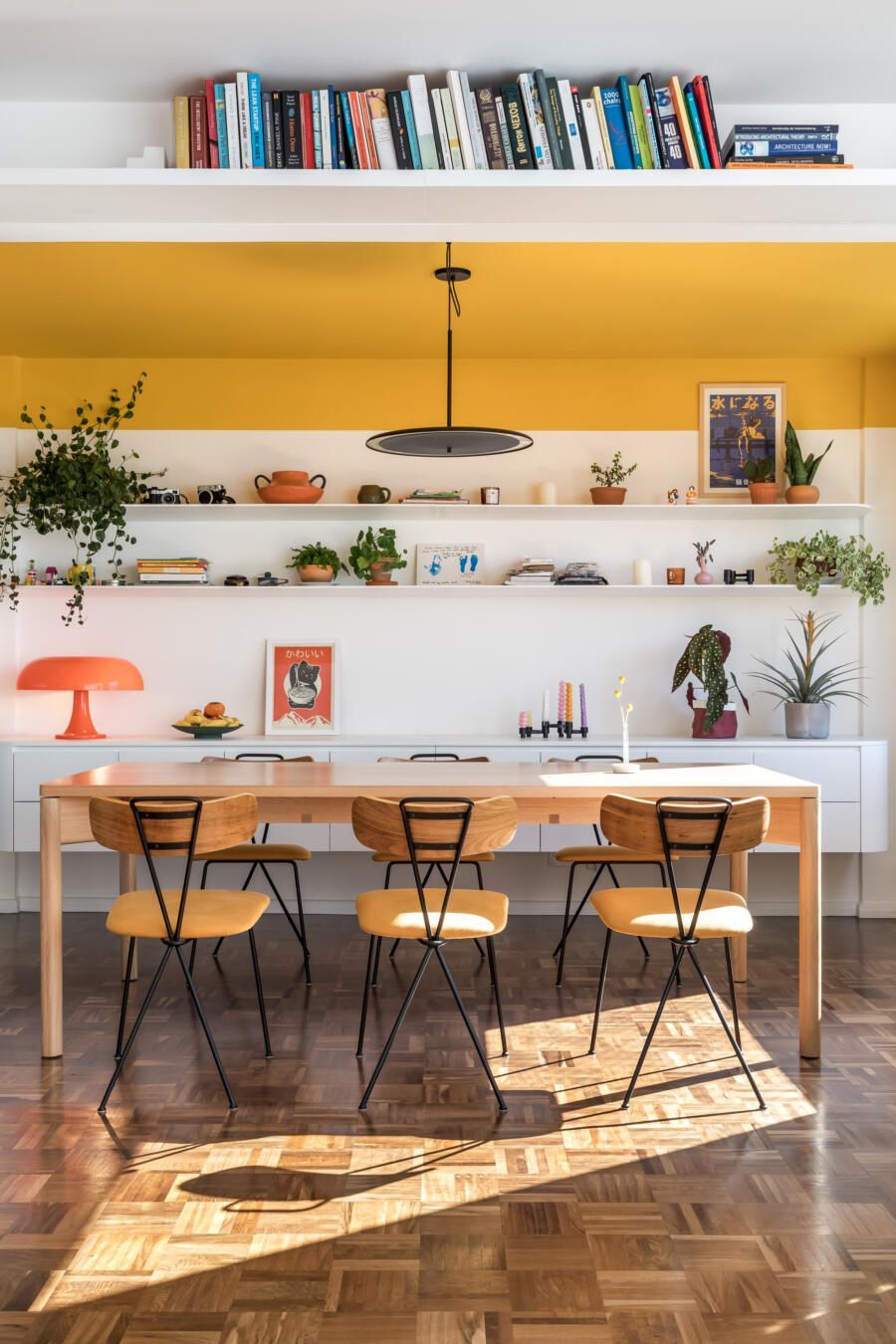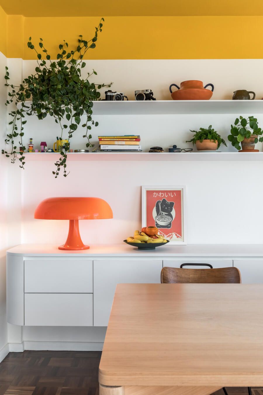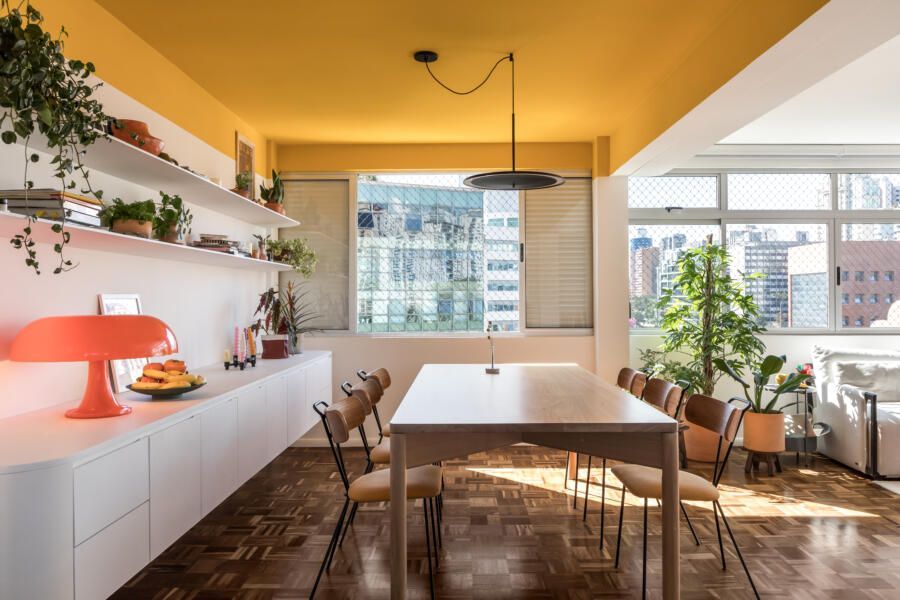 “Na sala de jantar, o destaque está no teto mostarda, que traz uma atmosfera solar às refeições. As prateleiras, balcão e paredes brancas, servem de abrigo para os projetos colecionados, fotografias e garimpos adquiridos ao longo dos anos. Já na cozinha, as cores fortes da marcenaria são suavizadas com o piso e bancada brancos compondo o azulejo criado pelo artista plástico Romulo Lass.”