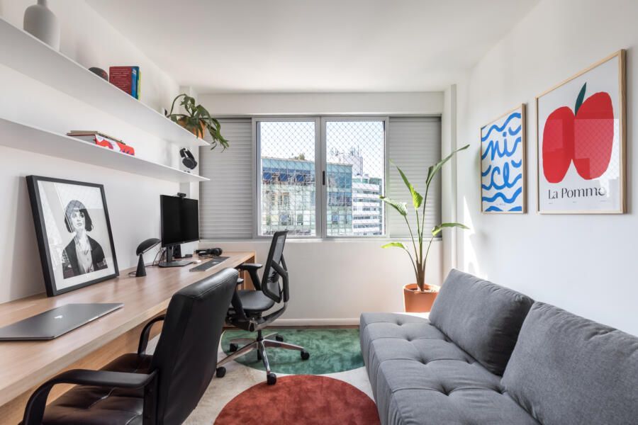 Já para quartos e área íntima, os arquitetos Arthur Brizola e João Gabriel Küster Cordeiro optaram por dar um respiro a atmosfera colorida do apartamento.