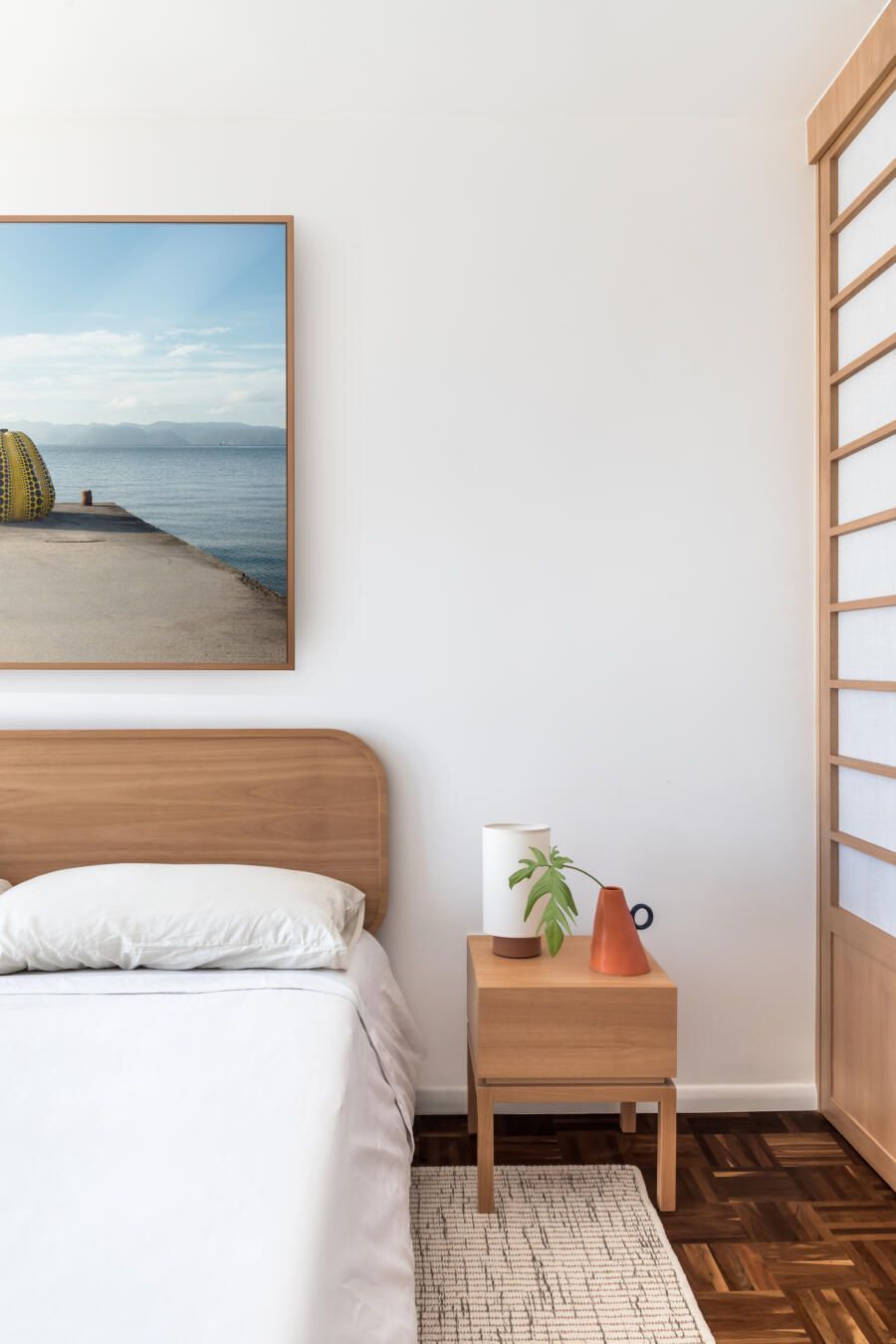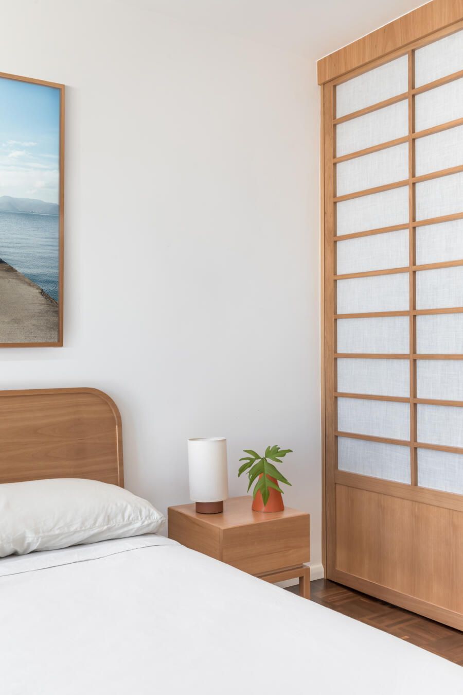 “O contraponto às cores utilizadas nesse apartamento está na área íntima. Buscamos trazer para esse espaço atmosfera minimalista, mais serena e favorável ao relaxamento. Para o quarto do casal, utilizamos tons claros e madeiras, desenhos na cama, mesa de cabeceiras e porta do armário que mimetizam arquitetura japonesa dos antigos templos budistas.”