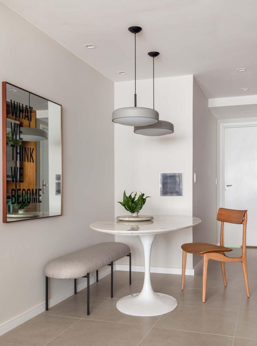 “Demolimos a parede entre a sala e a varanda para ampliar a área social do imóvel, alongando a sala de TV, que é integrada ao espaço de jantar. O quarto de serviço também foi demolido, abrindo espaço para que a cozinha e a área de serviço fossem maiores.”