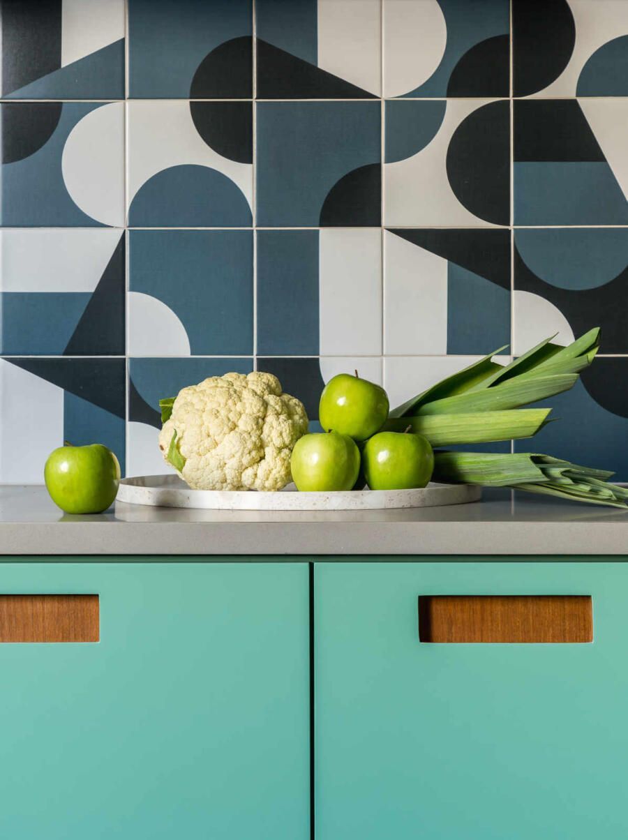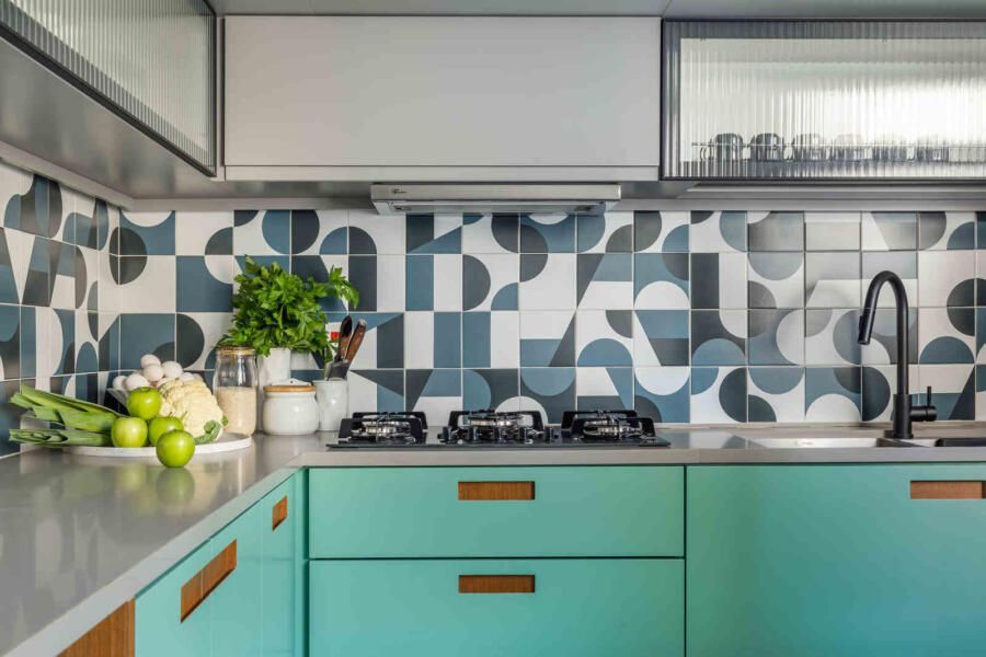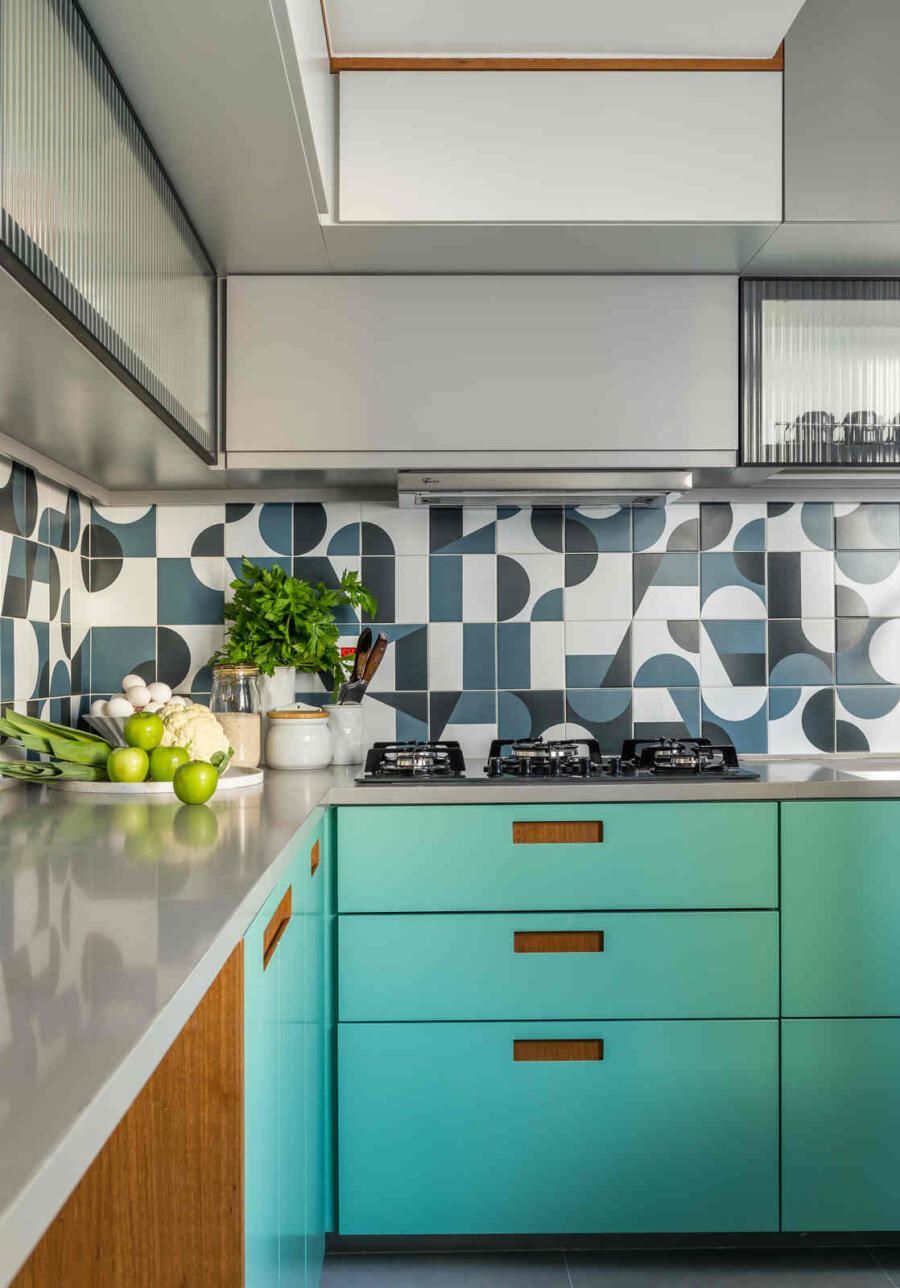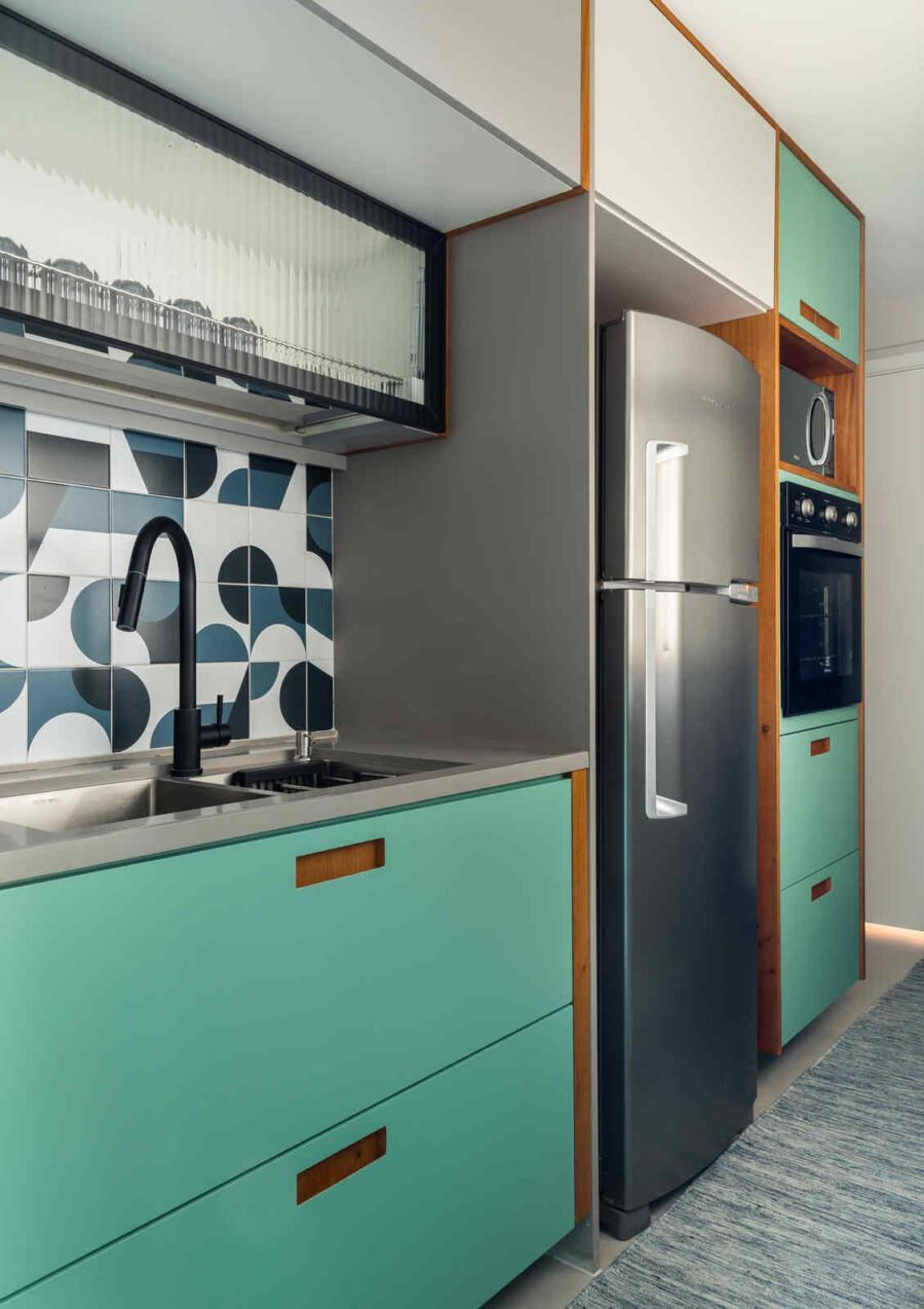 “Aplicamos azulejos geométricos nas áreas molhadas da cozinha e banheiros, o que imprimou ainda mais personalidade aos ambientes.”
