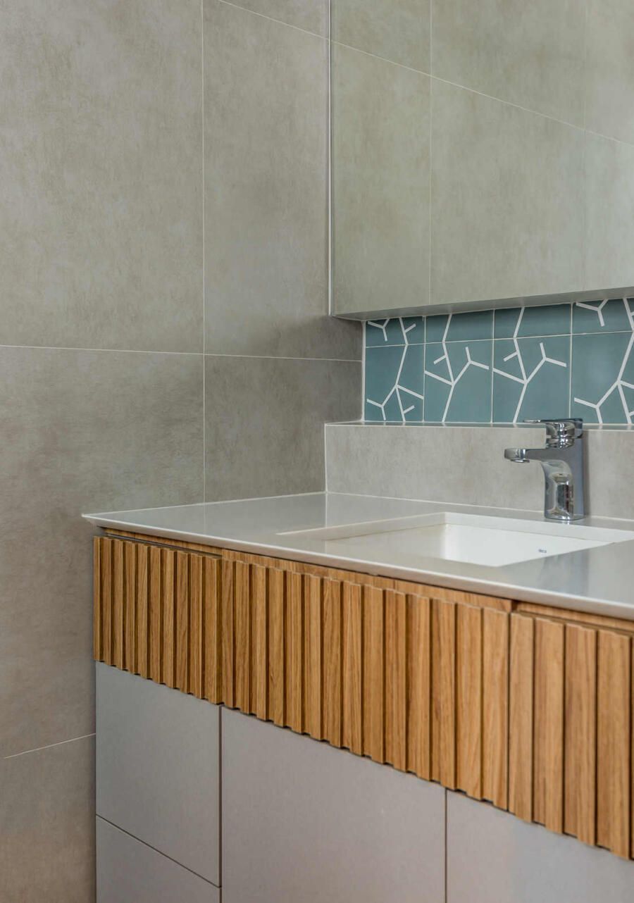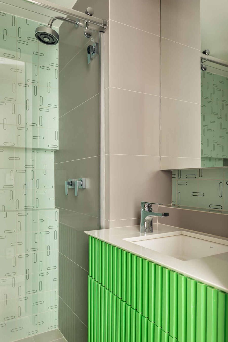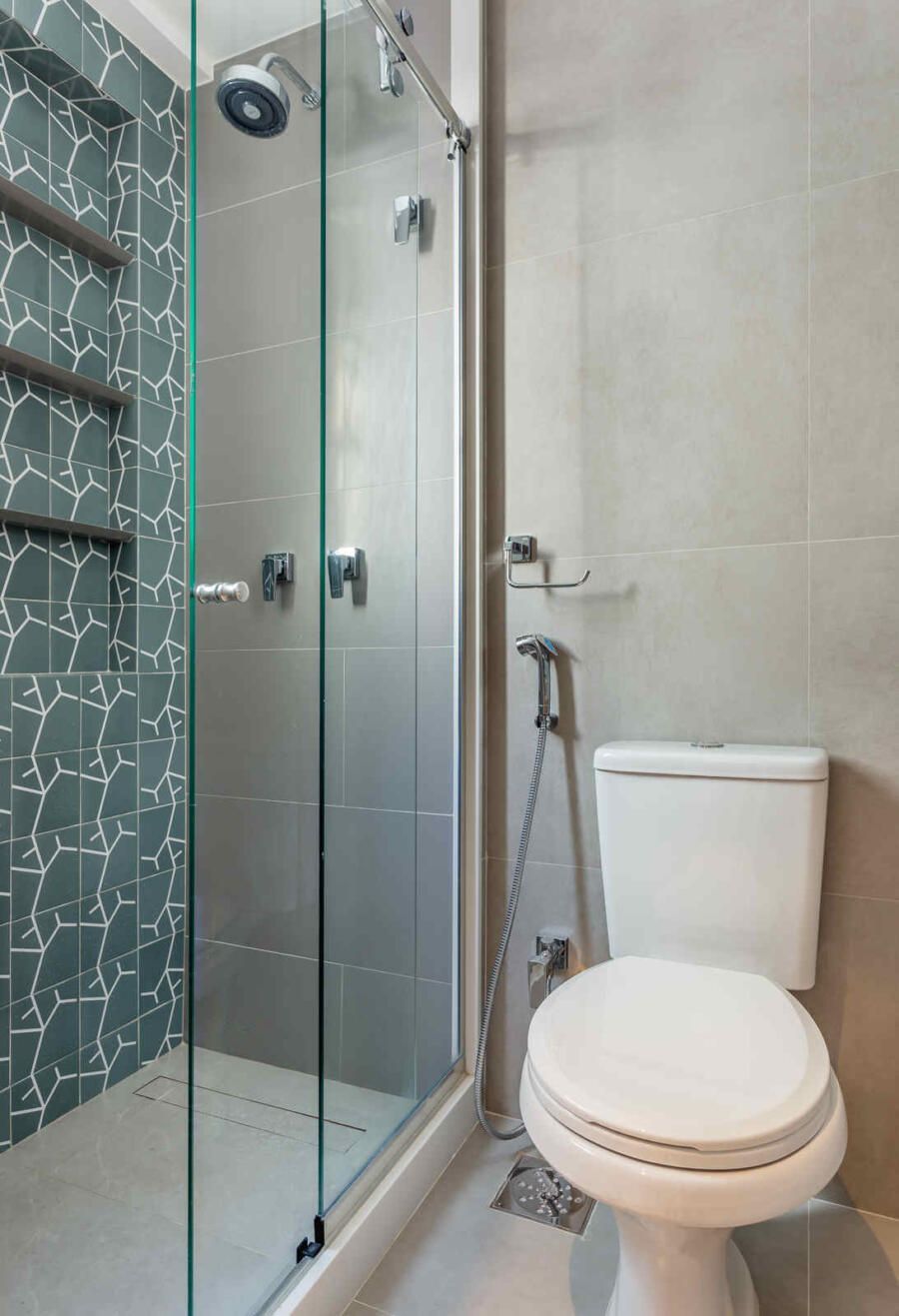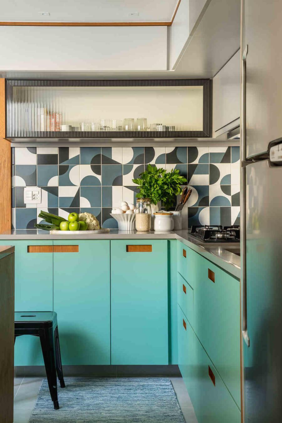 “Aplicamos azulejos geométricos nas áreas molhadas da cozinha e banheiros, o que imprimou ainda mais personalidade aos ambientes.”