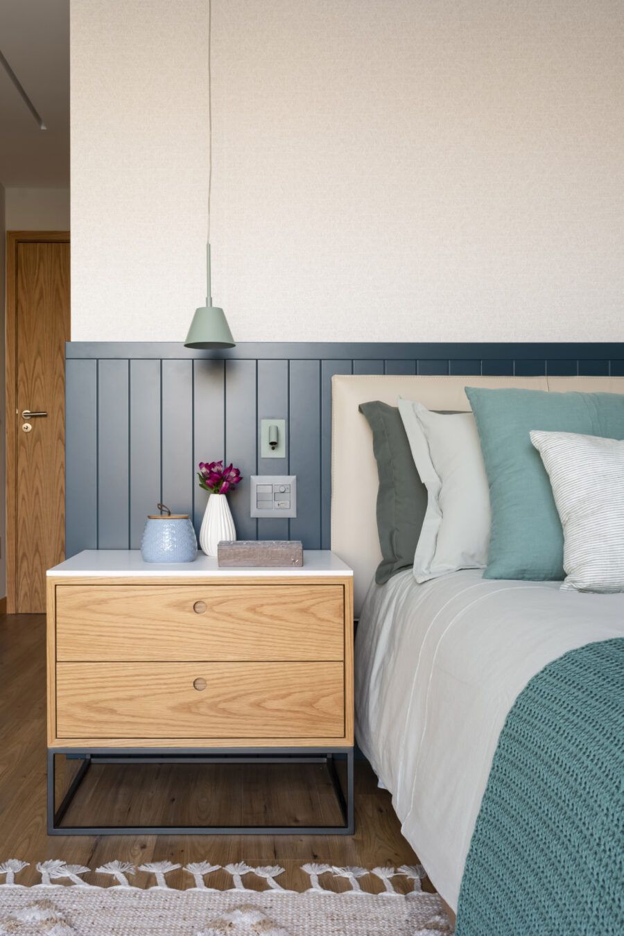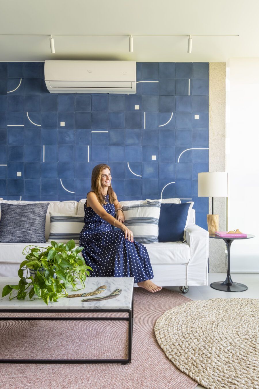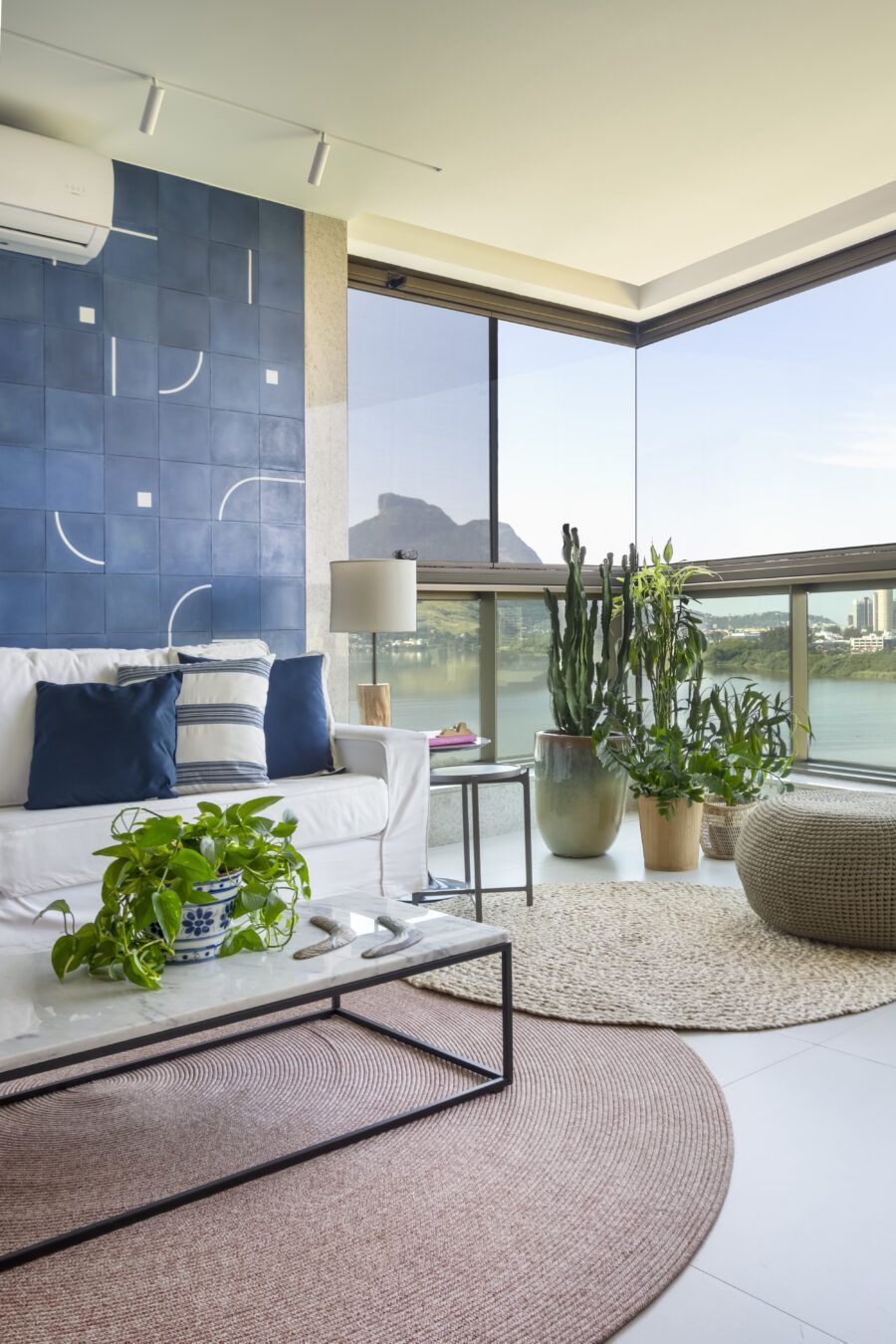 Já na varanda integrada à sala, a parede é revestida com ladrilhos hidráulicos azuis, em um grande painel que chama a atenção por não ser convencional. O piso e a marcenaria, ambos com tonalidade clara, recobram o equilíbrio, e tons rosados aparecem no tapete e no estofado da poltrona.