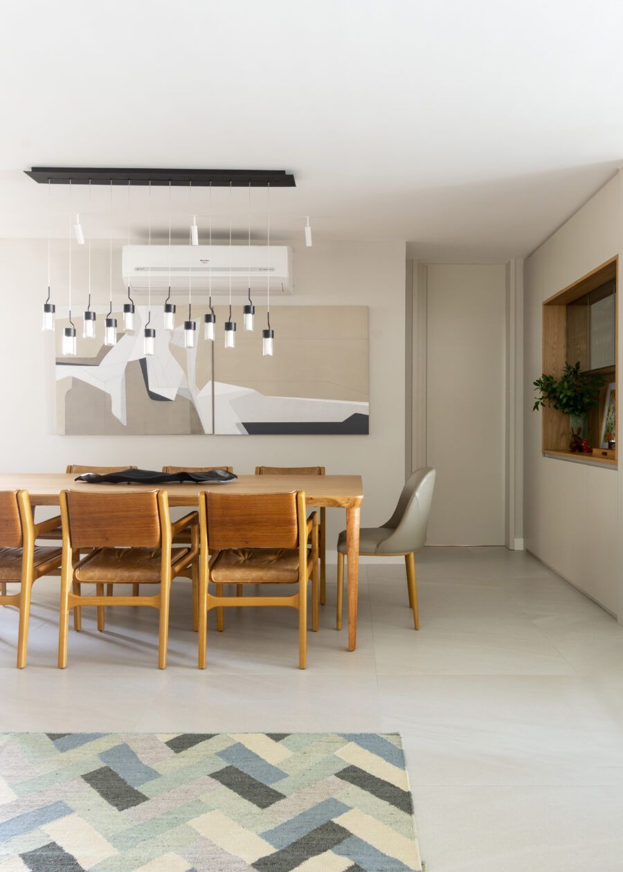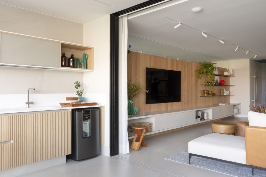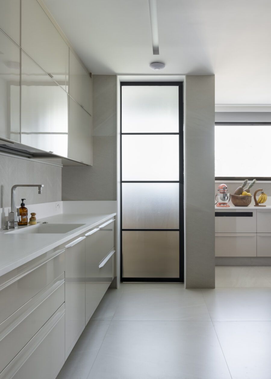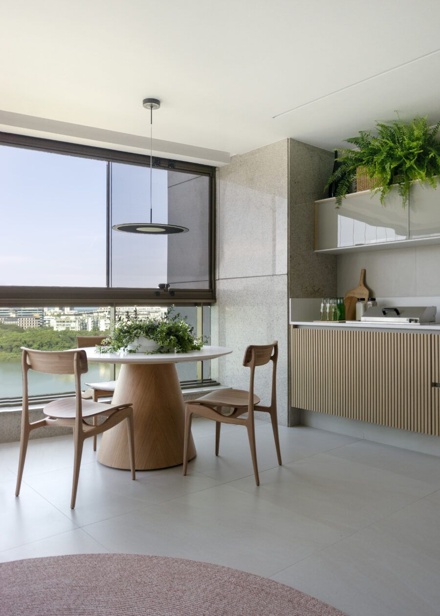“Usamos o mesmo piso de porcelanato cinza claro, com formato grande, na área social, cozinha e varanda, não só para criar uma unidade visual como também para aumentar a sensação de amplitude.”