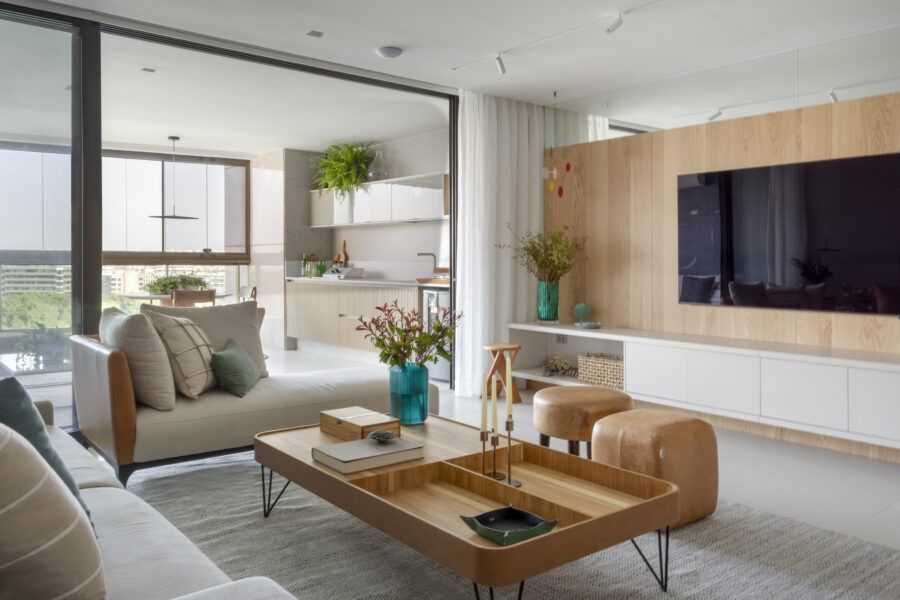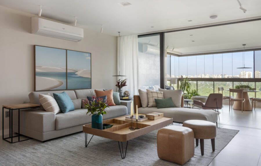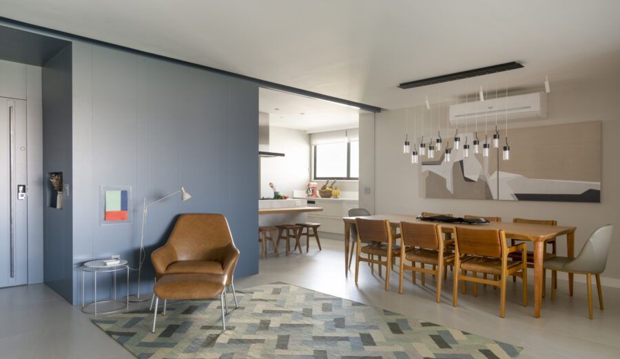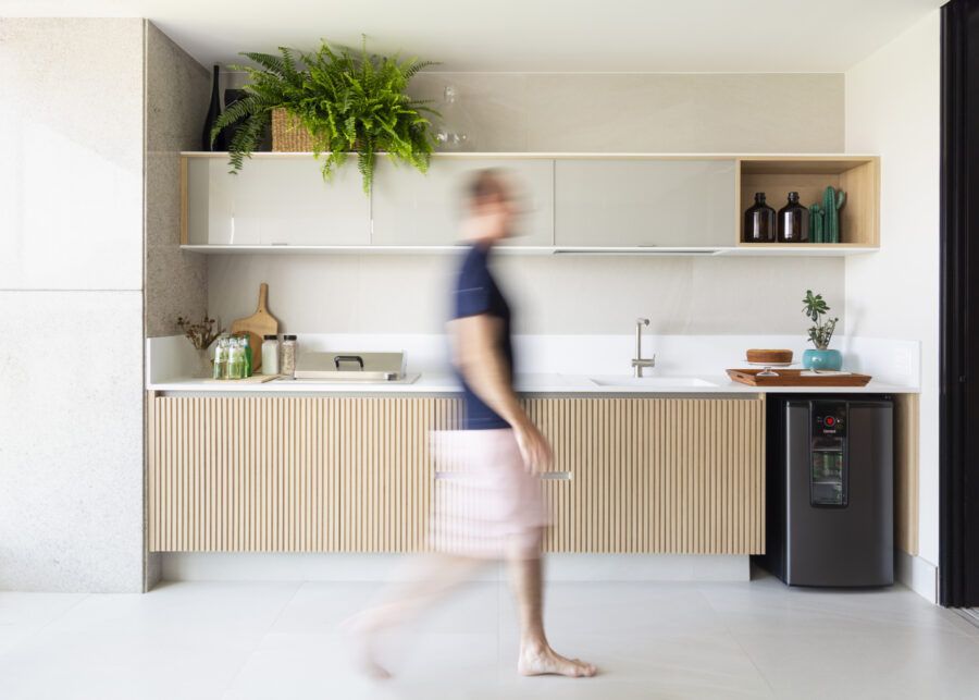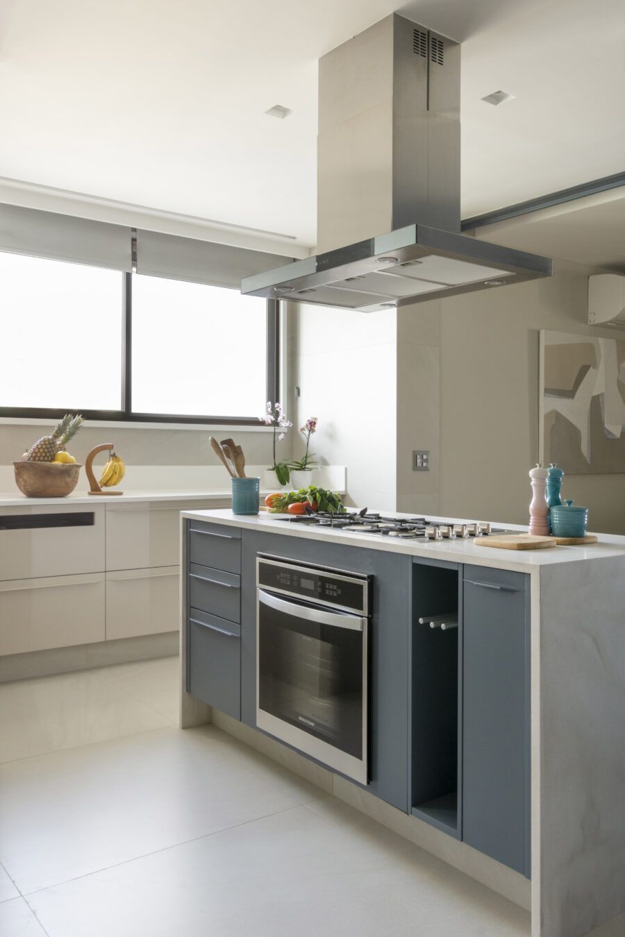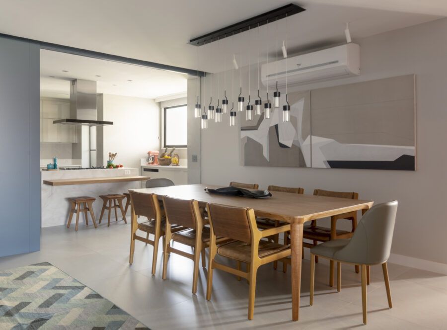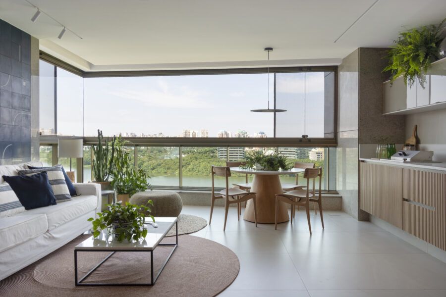 “Usamos o mesmo piso de porcelanato cinza claro, com formato grande, na área social, cozinha e varanda, não só para criar uma unidade visual como também para aumentar a sensação de amplitude.”