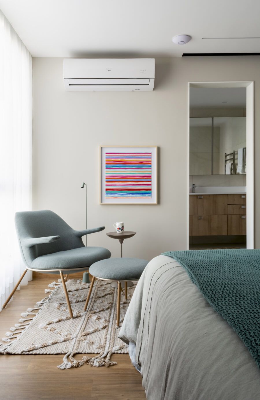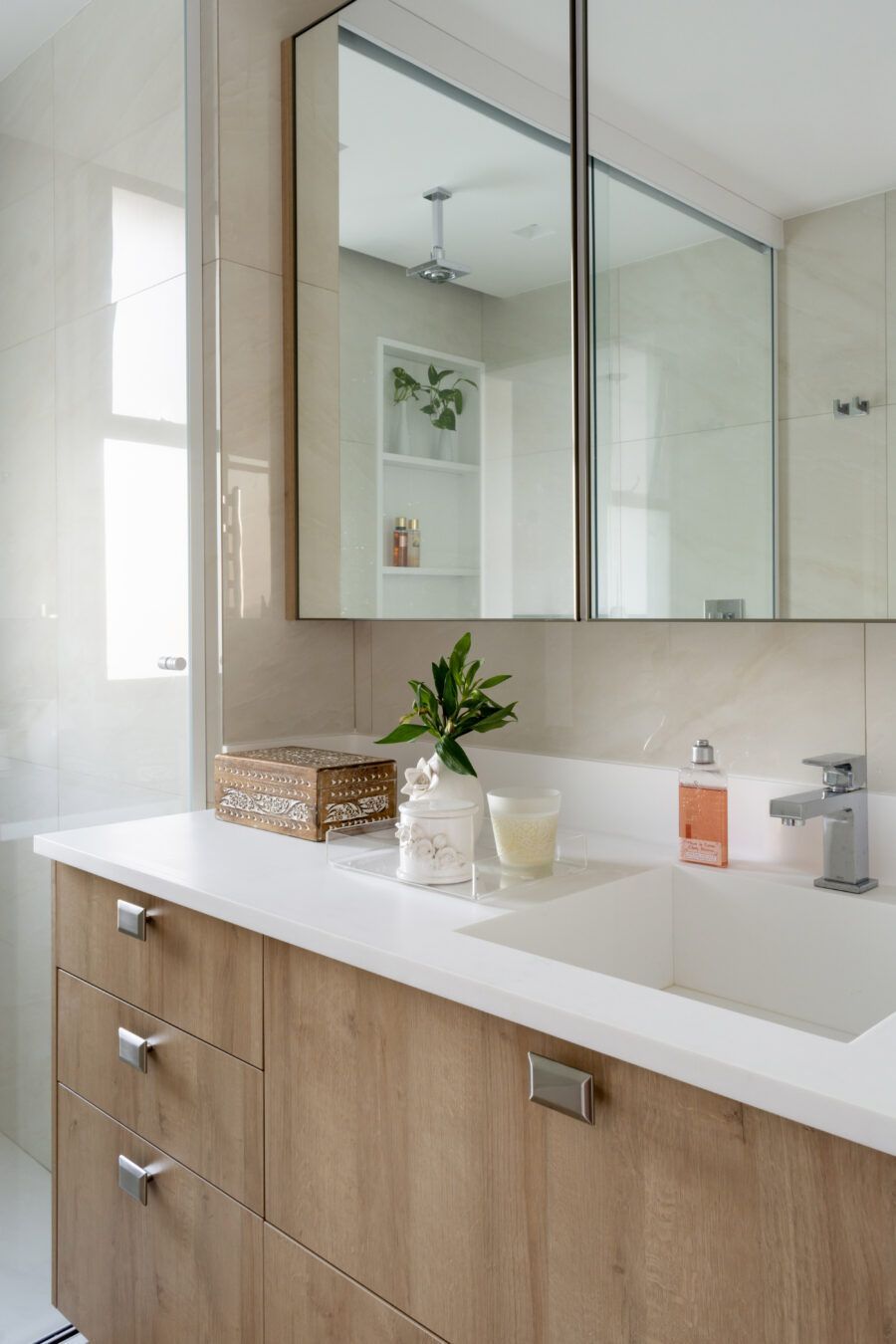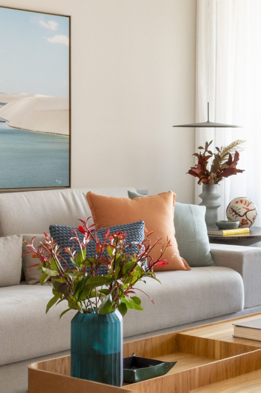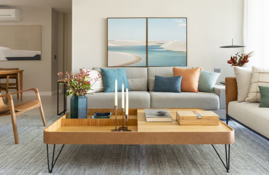 “Usamos o mesmo piso de porcelanato cinza claro, com formato grande, na área social, cozinha e varanda, não só para criar uma unidade visual como também para aumentar a sensação de amplitude.”