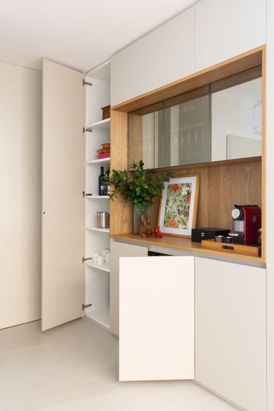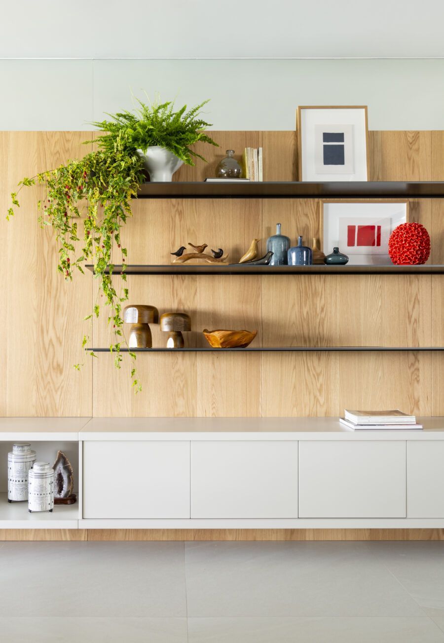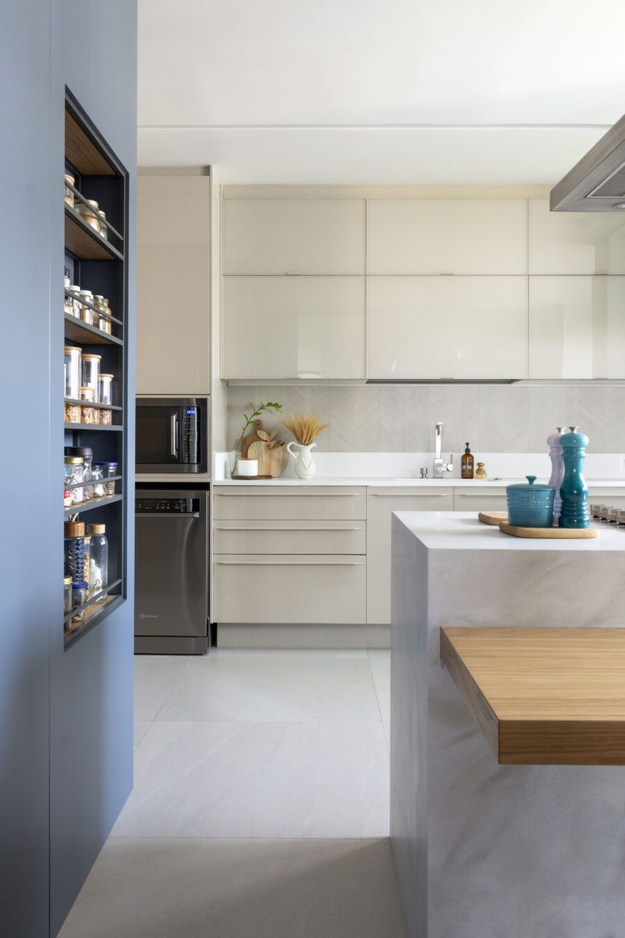O projeto buscou criar um lar com estilo contemporâneo e toques modernos. Para isso, cores contratantes foram escolhidas para texturas, acabamentos e materiais em todo o apartamento. Para a cozinha, por exemplo, a marcenaria de carvalho natural dividiu espaço com a laca azul, sempre com muita elegância e equilíbrio.