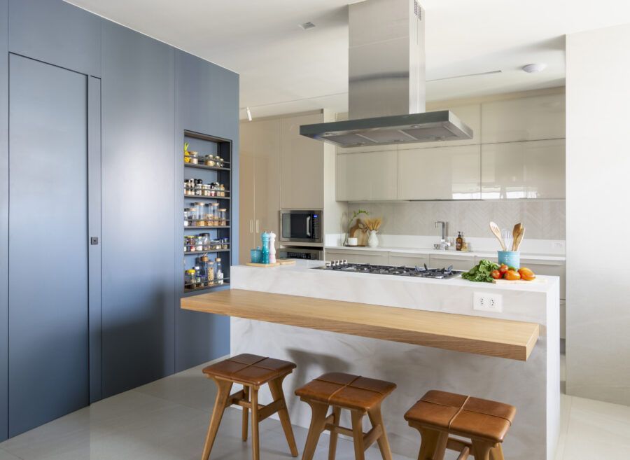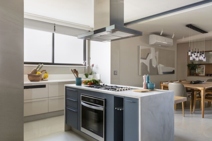 Uma cozinha com ilha e decoração azul no apartamento. Este foi o pedido dos clientes para a arquiteta Paula Müller, que assina o projeto de 200m² com vista privilegiada para a Lagoa da Tijuca.