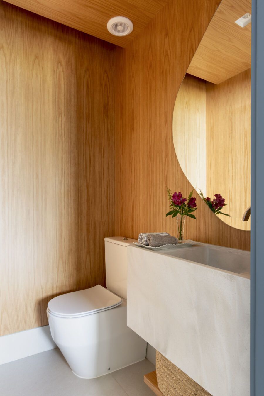 A ilha da cozinha foi executada em corian, o que lhe rendeu um aspecto mais rústico. Outro destaque é o lavabo que, camuflado no painel azul, conta com revestimento de carvalho natural nas paredes internas e no teto, além de um grande espelho e cuba esculpida na própria pedra.